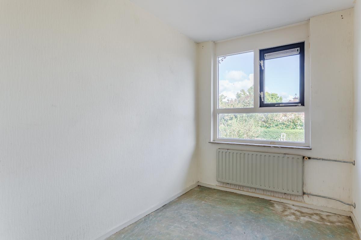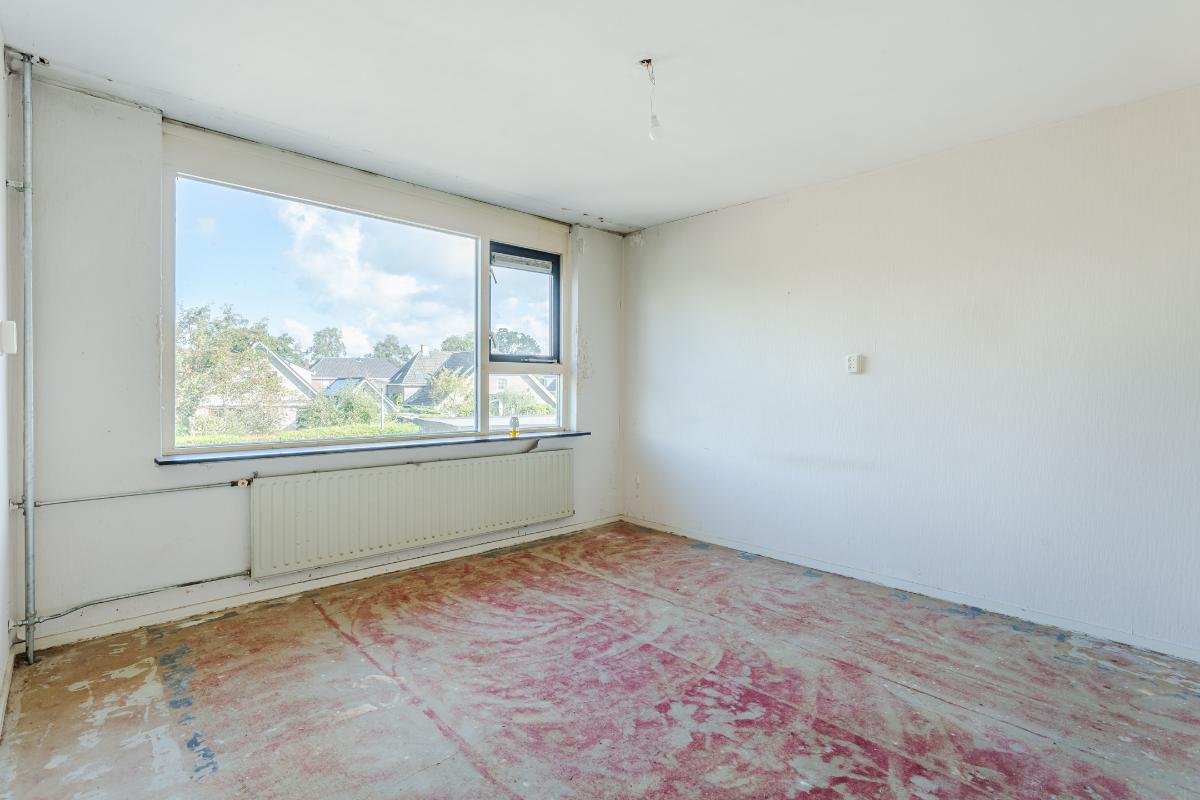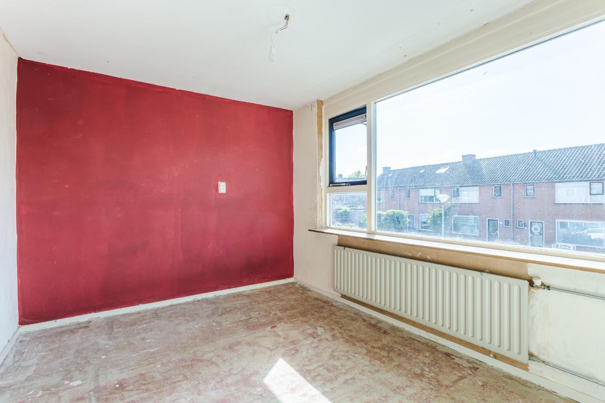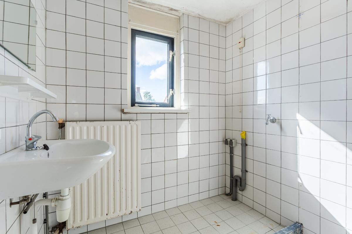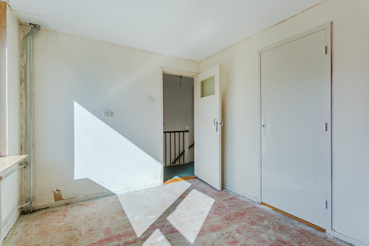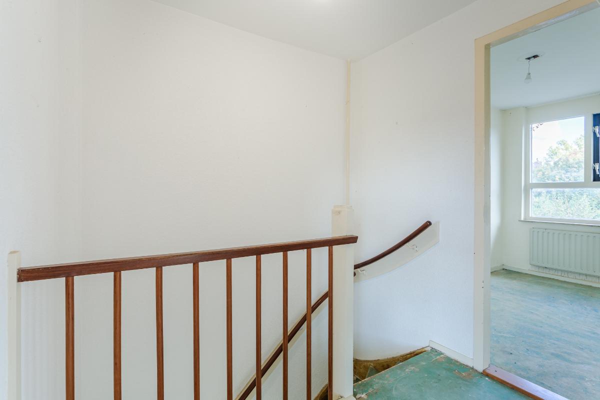 Eerste verdieping: overloop, drie slaapkamers, waarvan de 2 grootste kamers zijn voorzien van een vaste kast. Alle kamers zijn voorzien van dubbele beglazing. Wand- en vloerafwerking zijn naar eigen wens te realiseren. De eenvoudige badkamer is uitgerust met een douche, wastafel en wasmachine-aansluiting. Een raam zorgt voor lichtinval en ventilatie.