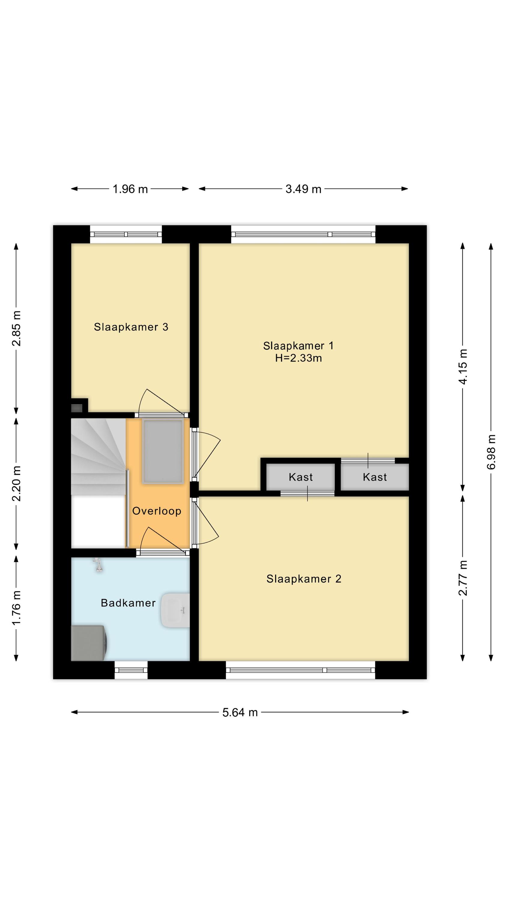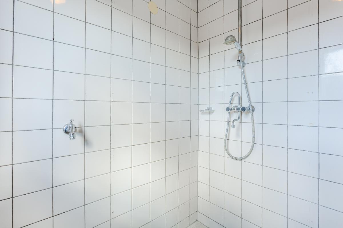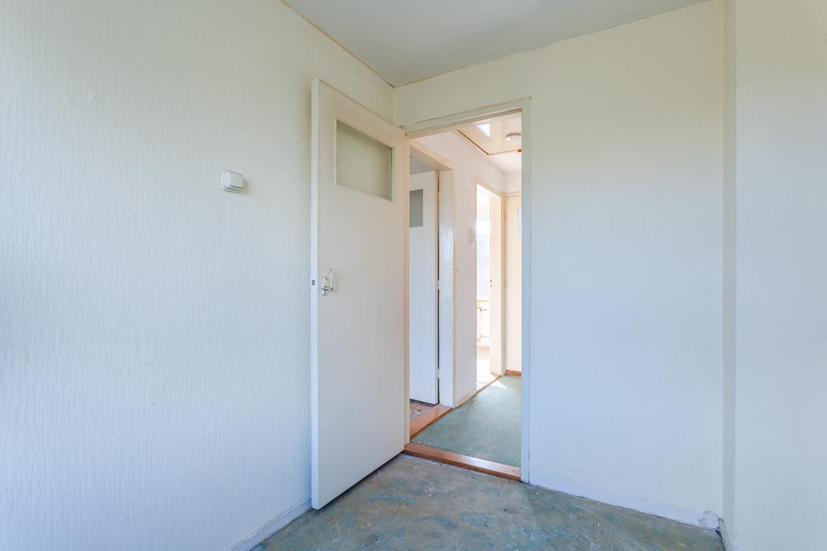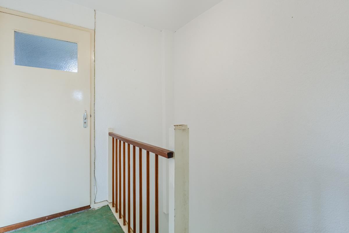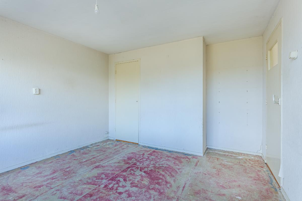 Eerste verdieping: overloop, drie slaapkamers, waarvan de 2 grootste kamers zijn voorzien van een vaste kast. Alle kamers zijn voorzien van dubbele beglazing. Wand- en vloerafwerking zijn naar eigen wens te realiseren. De eenvoudige badkamer is uitgerust met een douche, wastafel en wasmachine-aansluiting. Een raam zorgt voor lichtinval en ventilatie.