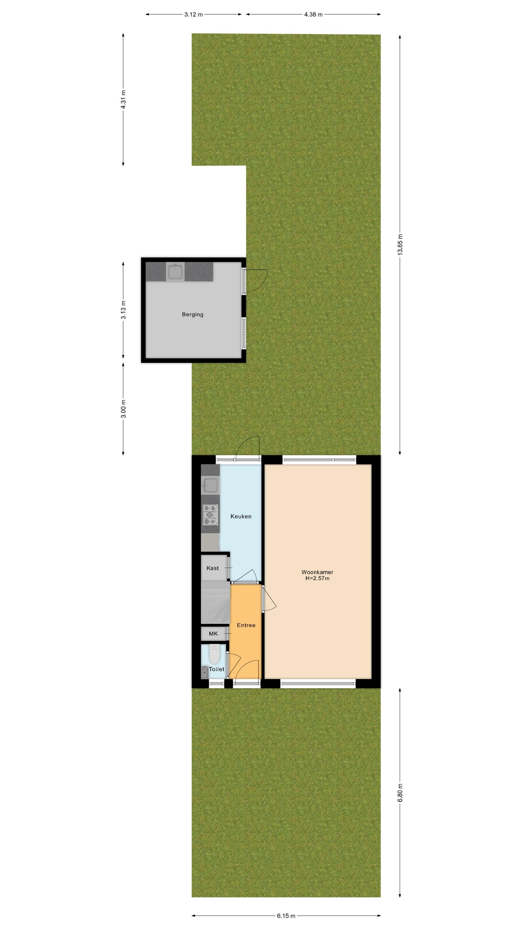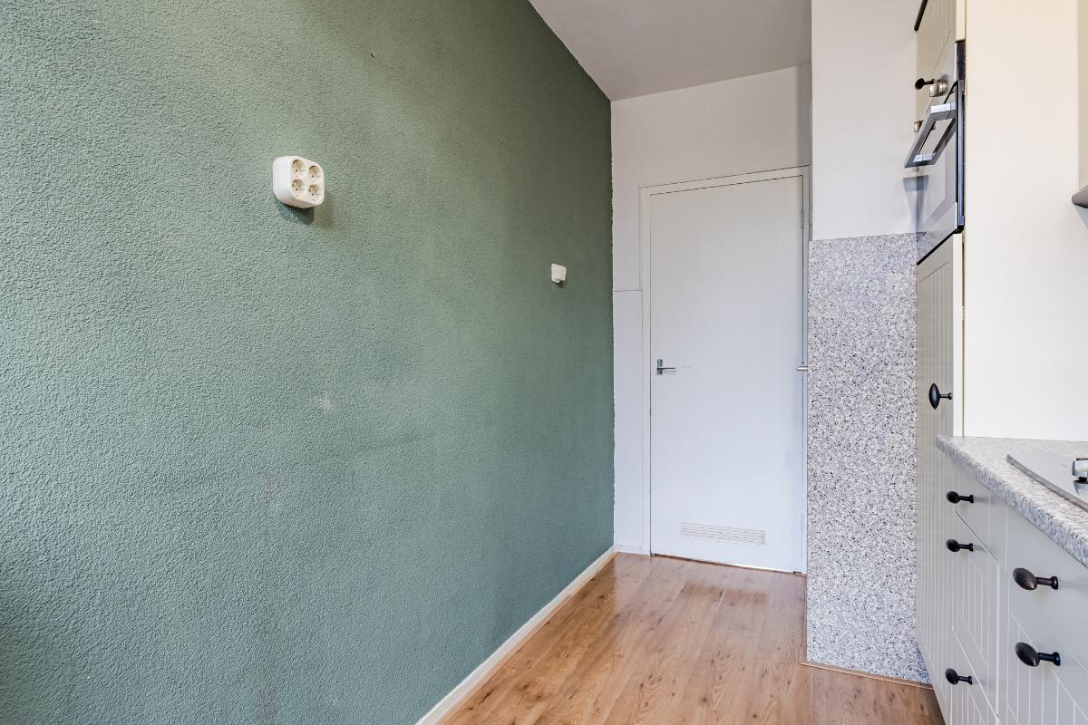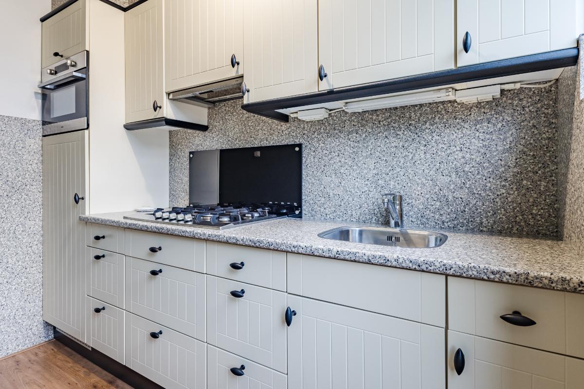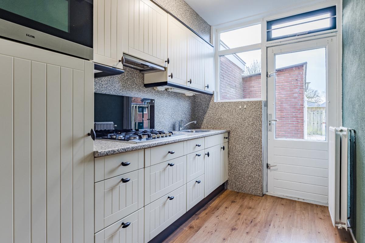 INDELING Begane grond: entree/hal, meterkast, toilet, trapopgang naar de 1e verdieping, toegang tot doorzonwoonkamer met laminaatvloer en spachtelputz wandafwerking. Vanuit de hal bereikt u de dichte keuken aan de achterzijde van de woning welke is voorzien van een praktische verlaagde kelderkast en een dichte keuken. De keuken is ongeveer 16 jaar oud, maar nog redelijk netjes en uitgerust met een 5 pits gasfornuis, combi-oven, afzuigkap, koelkast en vriezer .