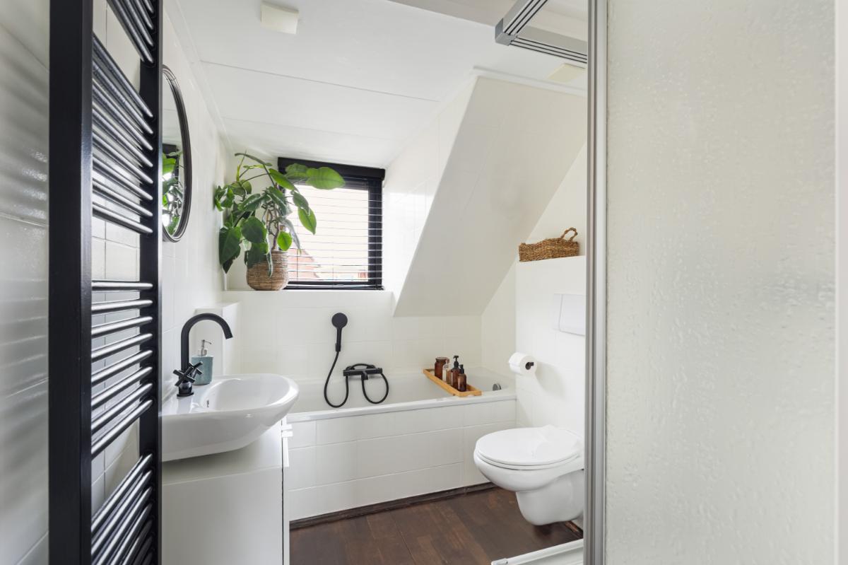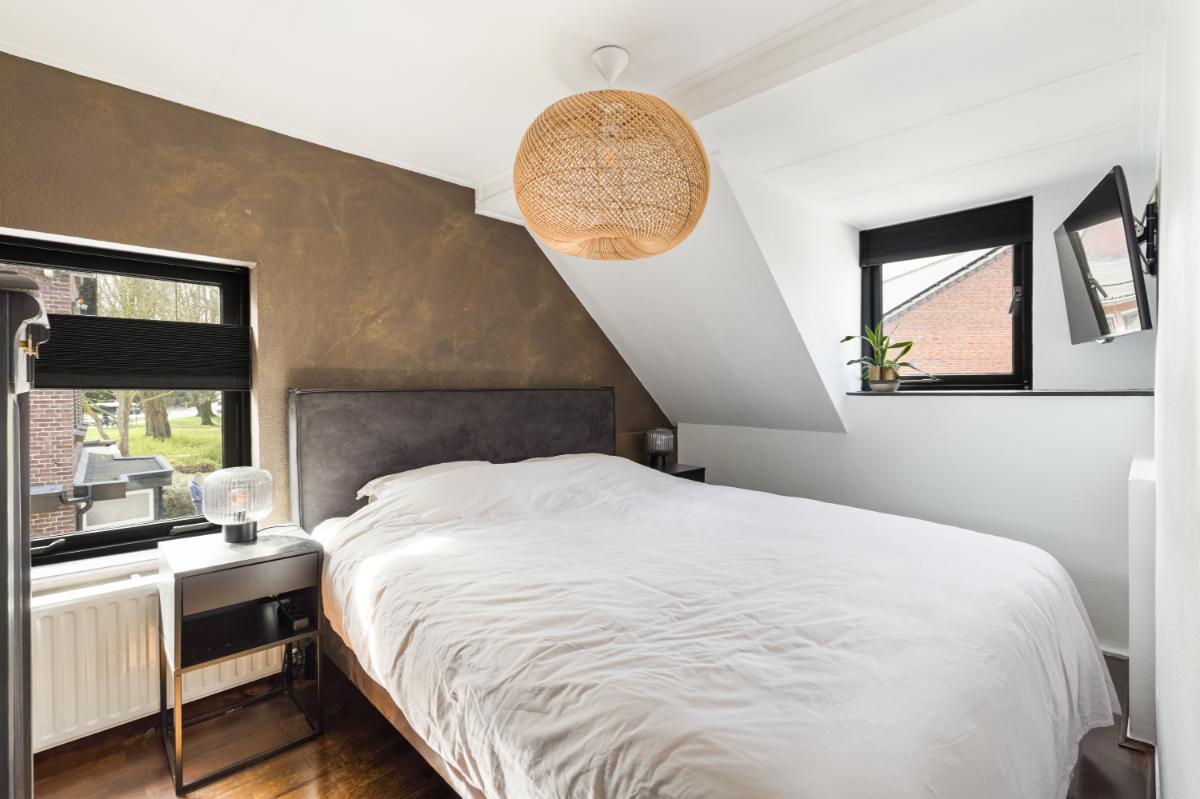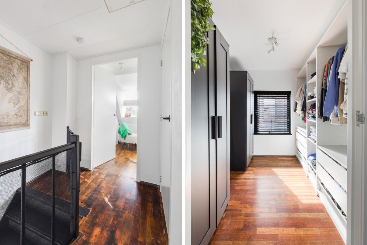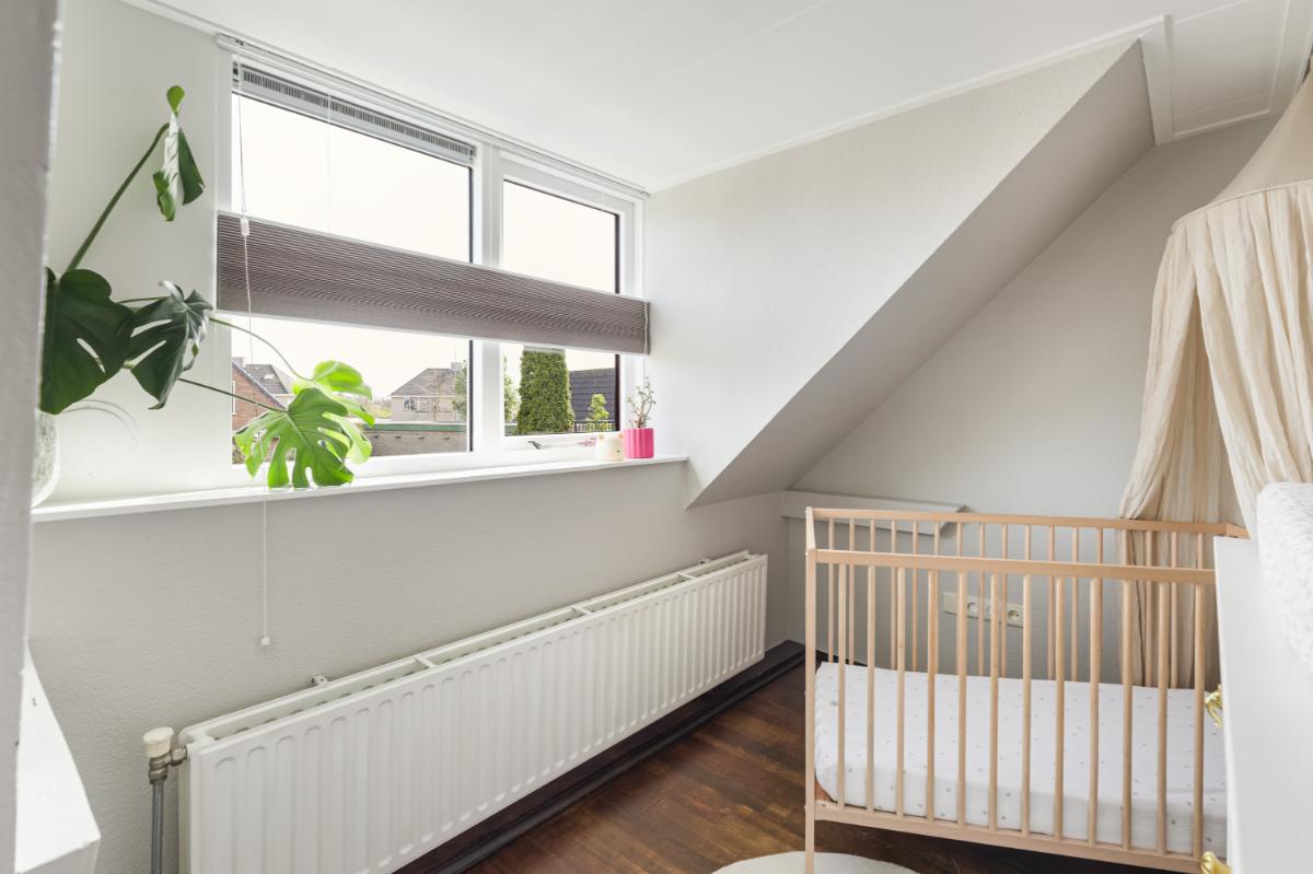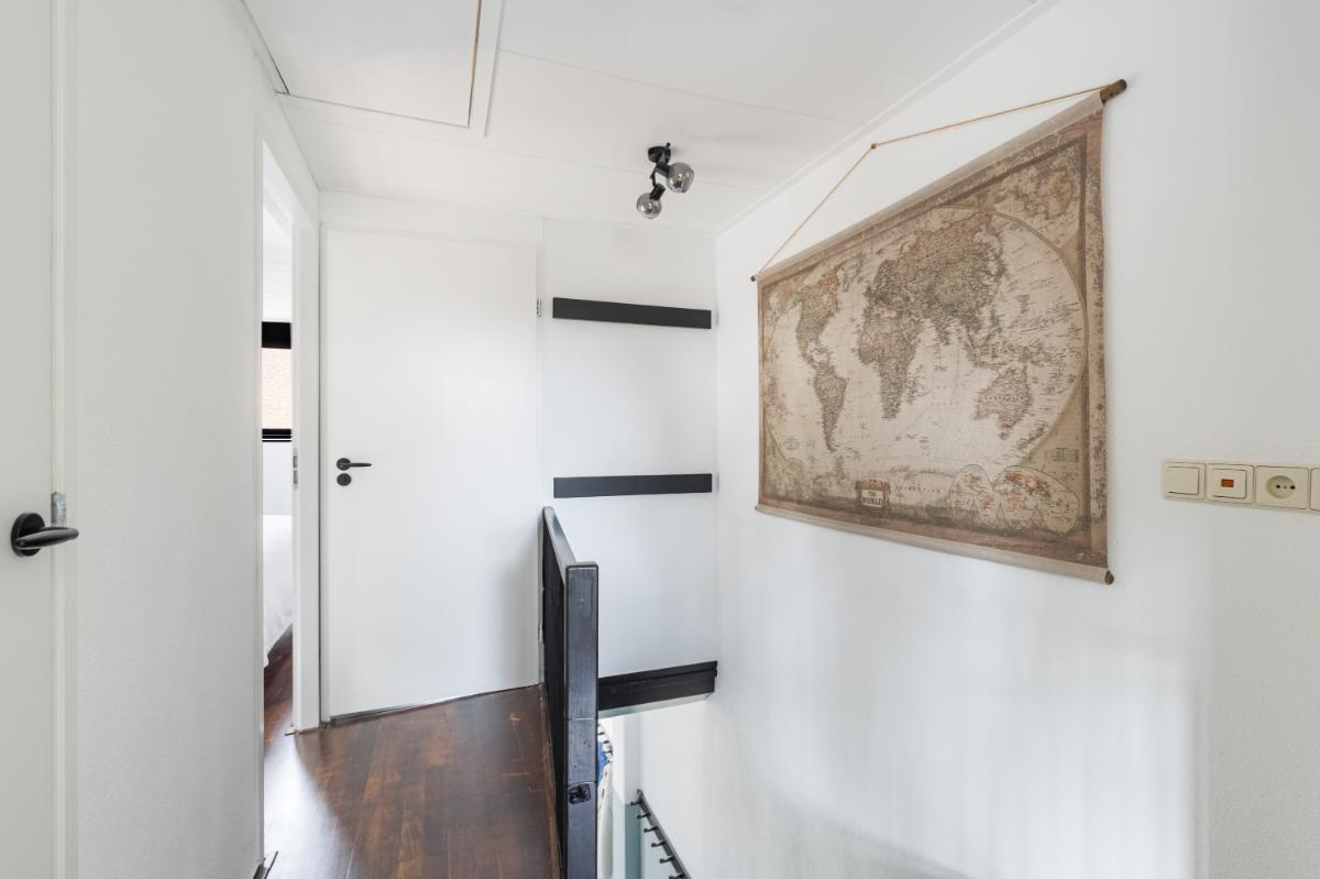 Eerste verdieping: de overloop geeft toegang tot drie slaapkamers. Aan de achterzijde bevindt zich een slaapkamer met dakkapel en vaste kast. De middelste kamer is ideaal als kinder-, werk- of logeerkamer. Aan de voorzijde ligt de derde slaapkamer, eveneens voorzien van een dakkapel en extra zijraam, wat zorgt voor veel lichtinval. Oorspronkelijk waren de achterste en middelste kamer één grote slaapkamer; dit is eenvoudig weer te herstellen indien gewenst. De badkamer is licht en compleet ingericht met een ligbad, douchecabine, wandcloset en wastafel.