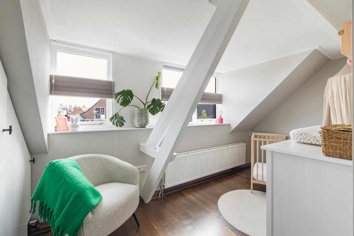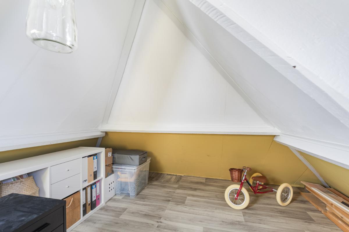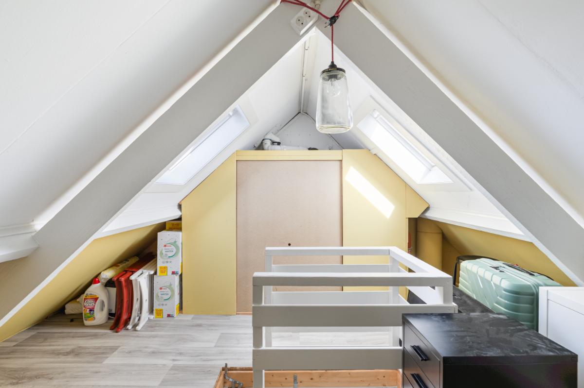 Tweede verdieping: via een vlizotrap bereik je de zolderverdieping. Deze ruimte heeft stahoogte en twee Velux dakramen, waardoor het een praktische plek is voor opslag of eventueel een hobbyruimte. Hier bevindt zich ook de cv-installatie (Nefit, 2021).