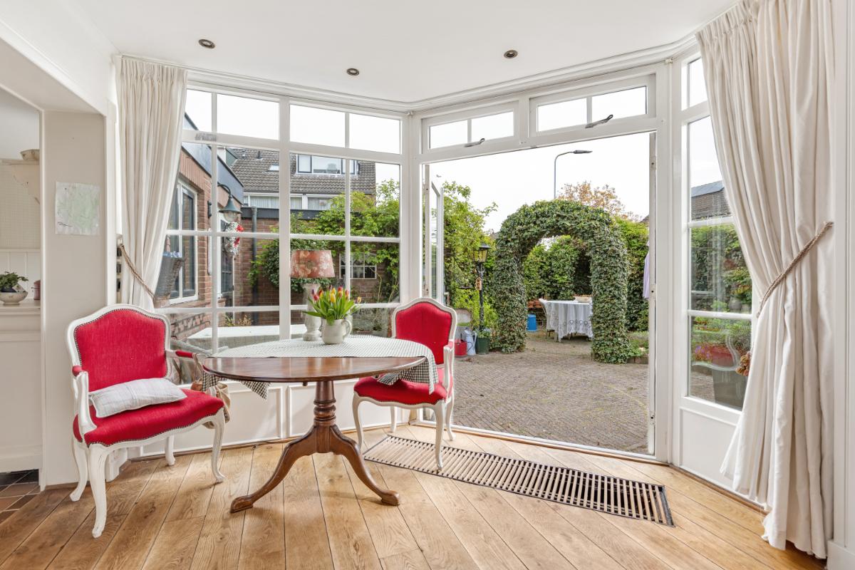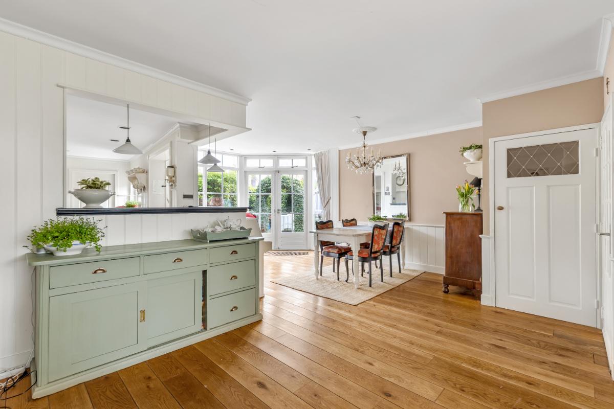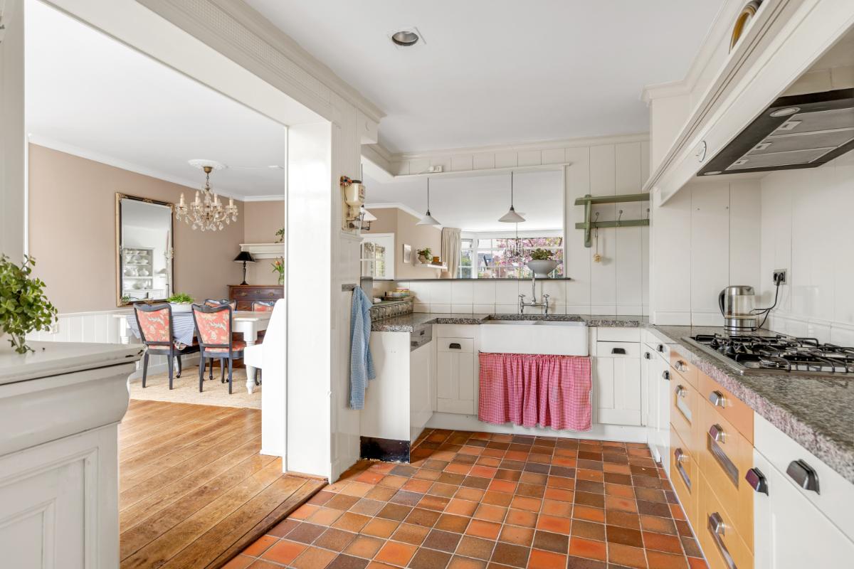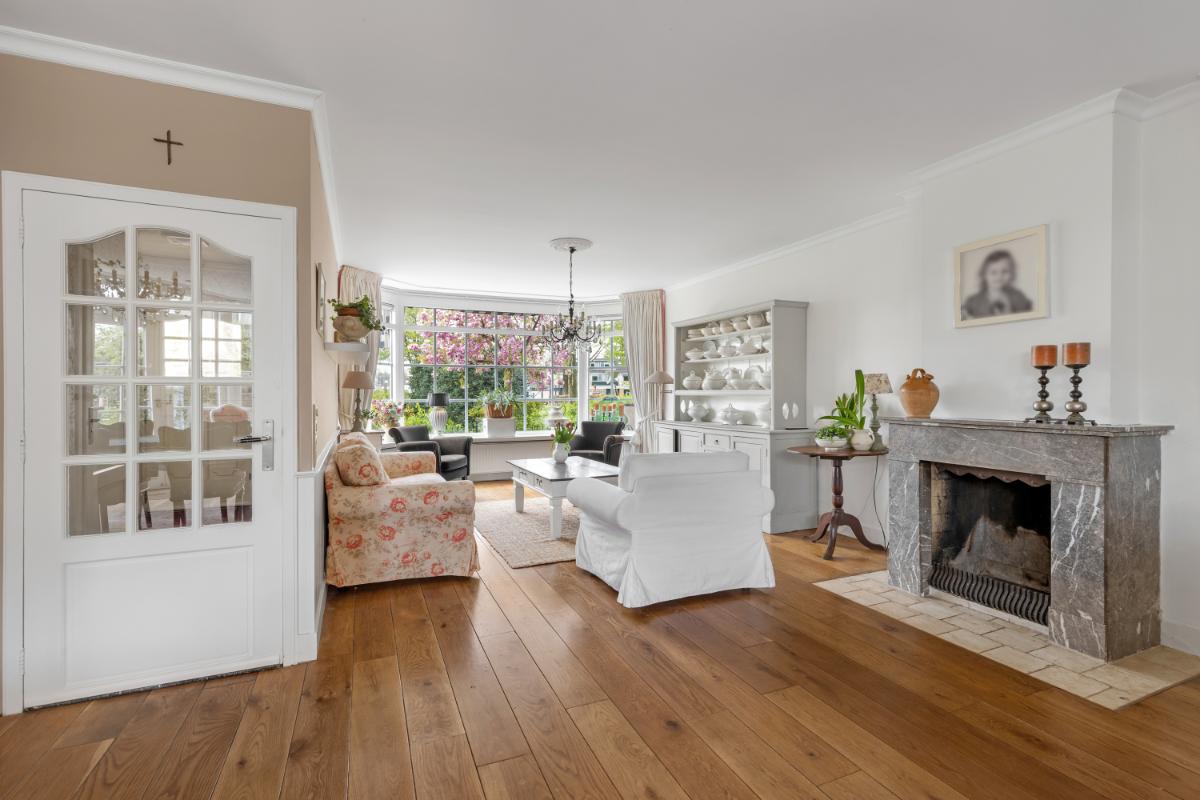 De ruime woonkamer bevindt zich aan de voorzijde en is voorzien van een fraaie erker en een sfeervolle open haard. Dankzij de ligging geniet u hier van een vrij uitzicht over het park. De woonkamer biedt daarnaast volop ruimte voor het hele gezin. Aan de achterzijde is de woning uitgebouwd, waardoor een royale keuken met aangrenzende berging is gerealiseerd. Dit zorgt niet alleen voor extra praktische ruimte, maar ook voor een fijne eethoek. De woon- en eetkamer zijn afgewerkt met een houten vloer, de keuken en berging zijn voorzien van praktische plavuizen. De wanden en plafonds zijn netjes afgewerkt met spachtelputz en lambrisering.