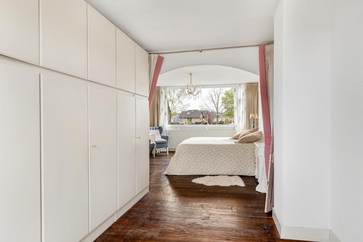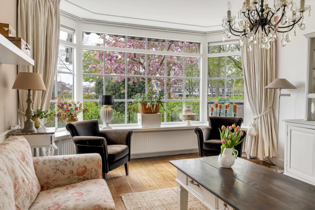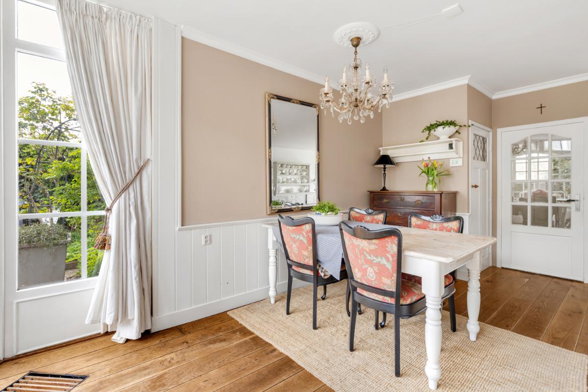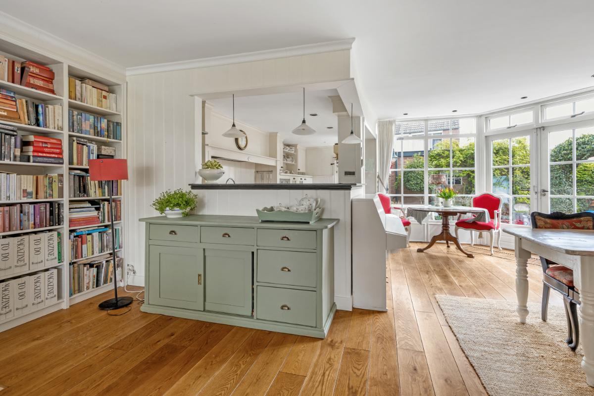 De ruime woonkamer bevindt zich aan de voorzijde en is voorzien van een fraaie erker en een sfeervolle open haard. Dankzij de ligging geniet u hier van een vrij uitzicht over het park. De woonkamer biedt daarnaast volop ruimte voor het hele gezin. Aan de achterzijde is de woning uitgebouwd, waardoor een royale keuken met aangrenzende berging is gerealiseerd. Dit zorgt niet alleen voor extra praktische ruimte, maar ook voor een fijne eethoek. De woon- en eetkamer zijn afgewerkt met een houten vloer, de keuken en berging zijn voorzien van praktische plavuizen. De wanden en plafonds zijn netjes afgewerkt met spachtelputz en lambrisering.