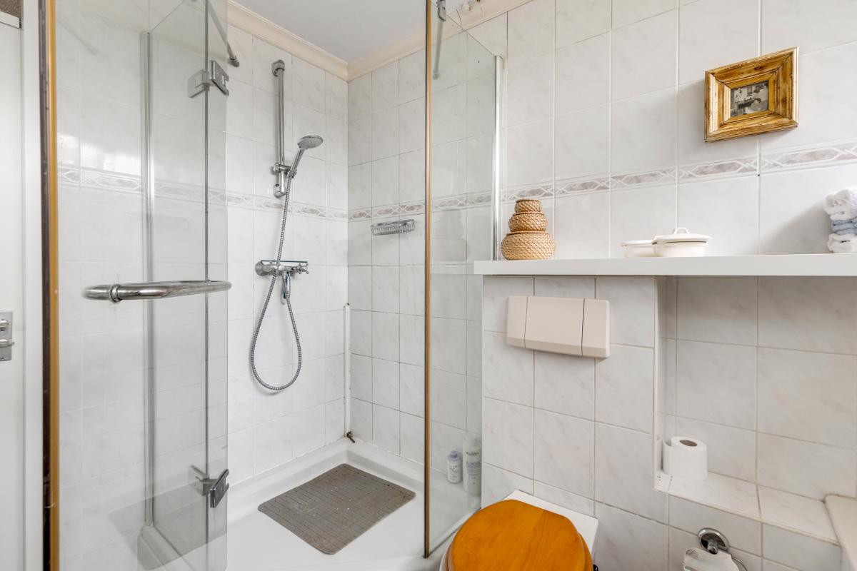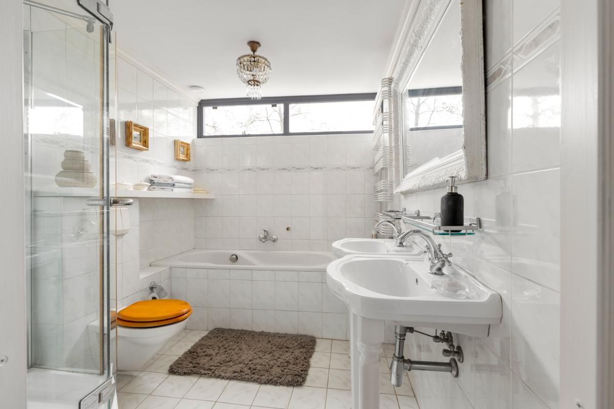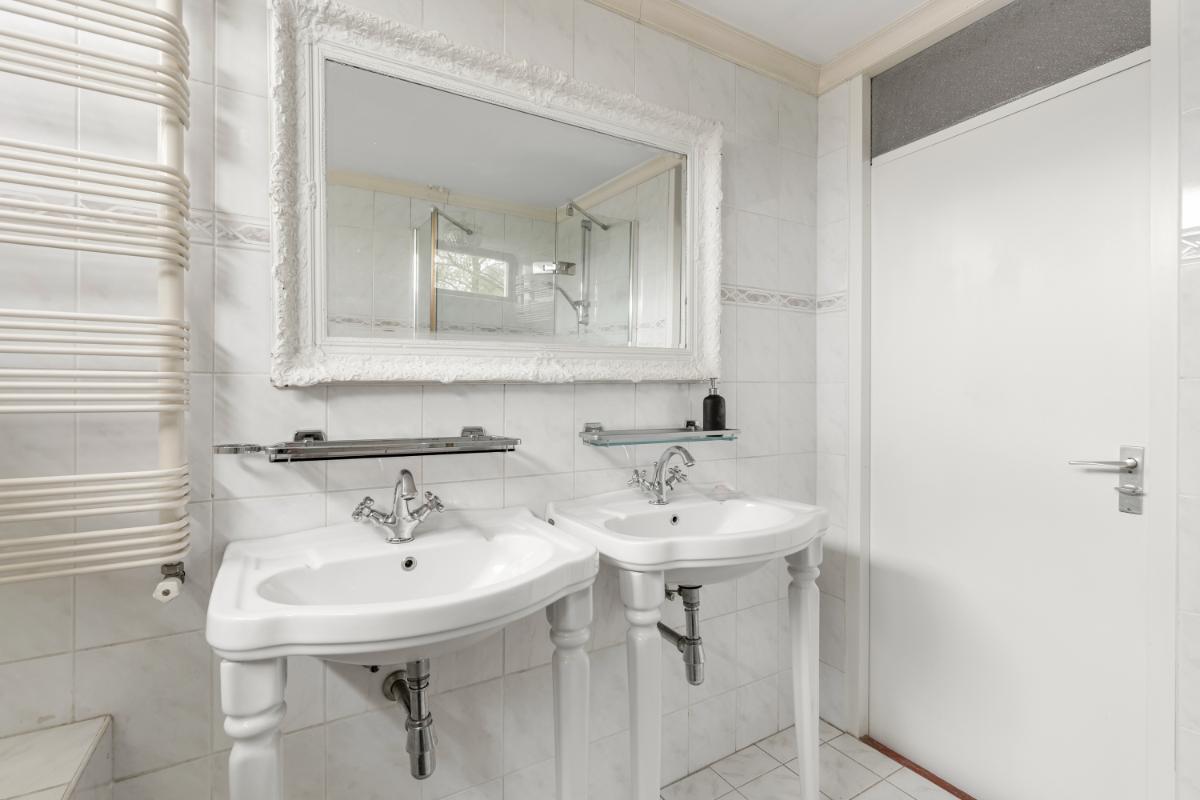 De badkamer is ruim opgezet en goed onderhouden, maar ietwat gedateerd. De ruimte is volledig functioneel en voorzien van een dubbele wastafel, douchecabine, wandcloset, ligbad en radiator.