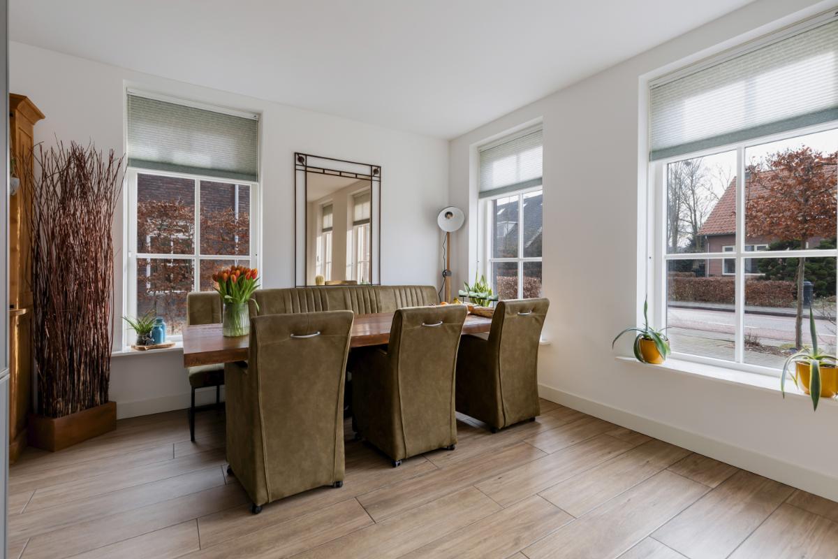 De woonkamer is aan de tuinzijde gesitueerd en heeft een L-vormige indeling, waardoor ruimte is voor zowel een royale zithoek als een grote eettafel. Dankzij de openslaande deuren en de grote raampartijen is de lichtinval hier bijzonder aangenaam. De keramische parketvloer en de verzorgde wandafwerking zorgen voor een rustige, warme basis.