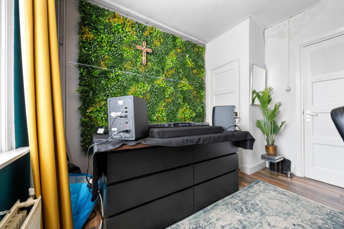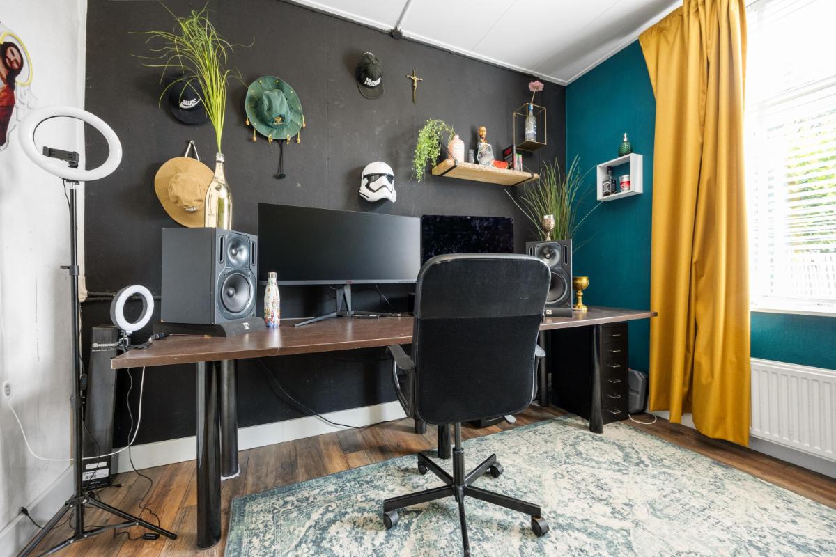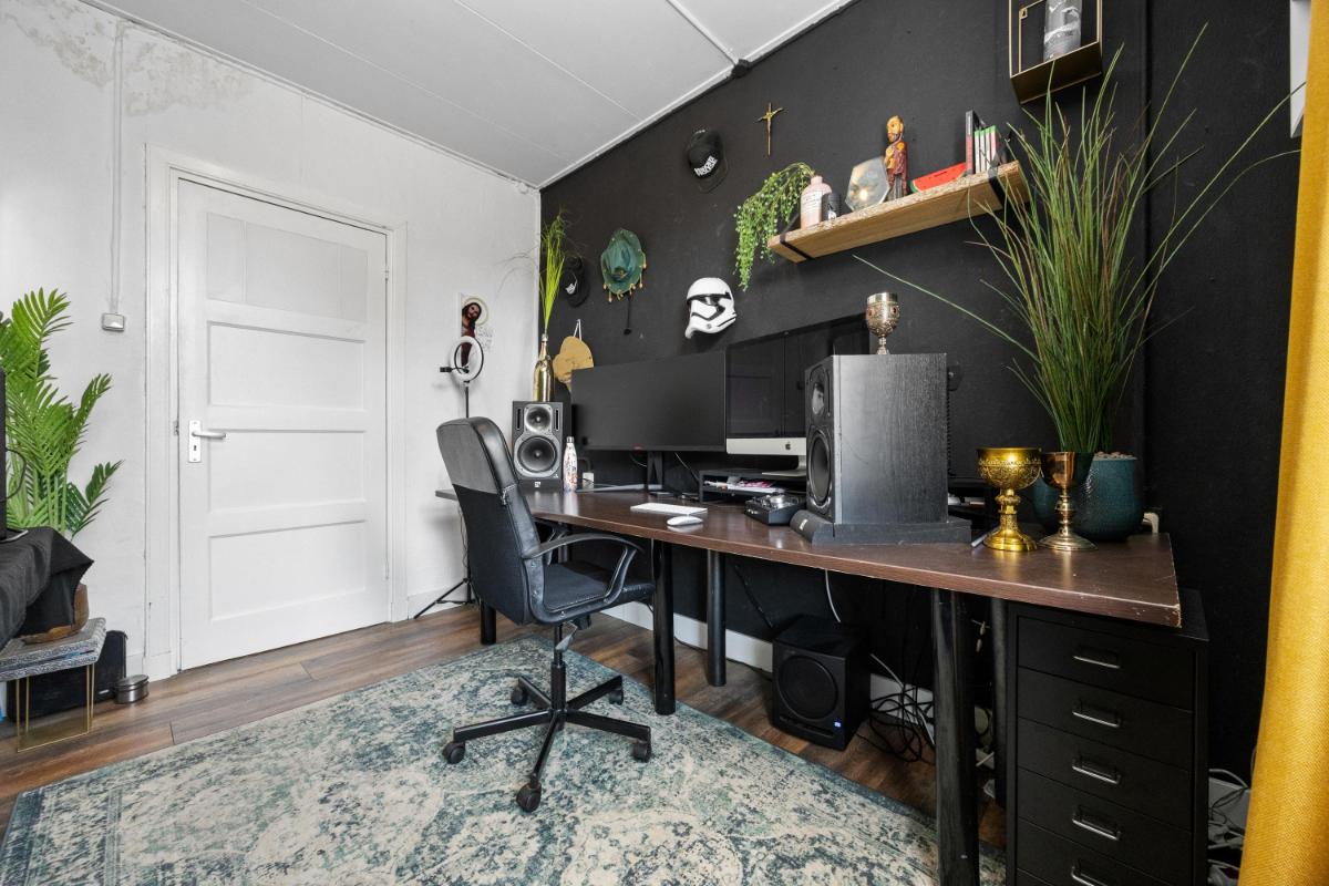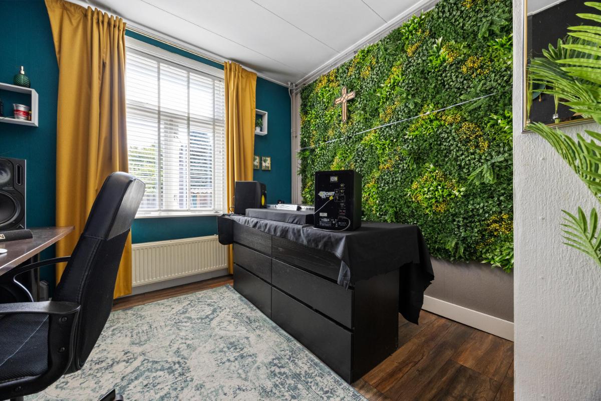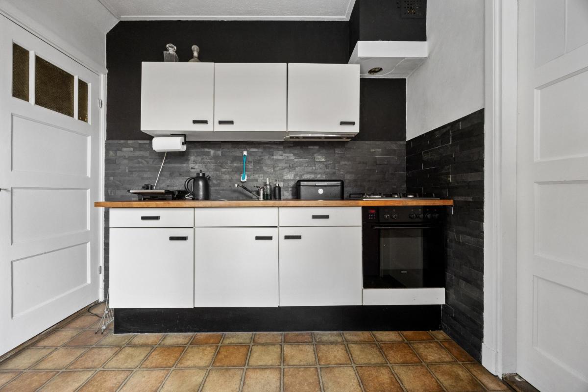De dichte keuken is netjes en functioneel, en geeft toegang tot de slaapkamer welke thans in gebruik is als werkkamer. Vanuit de keuken loop je zo de achtertuin in — ideaal op zomerse dagen of als je even snel buiten wilt zitten. De woning telt in totaal vier kamers, waarvan één op dit moment wordt gebruikt als slaapkamer (op de 1e verdieping). De overige kamers zijn ideaal als thuiswerkplek, slaap-logeerkamer of hobbyruimte. Dankzij de ruime opzet en rechte wanden kun je de woning flexibel inrichten naar jouw wensen. De badkamer gelegen op de 1e verdieping is compact en functioneel, met een douche, wastafel en toilet. Ook hier ligt een mooie kans om te moderniseren naar je eigen smaak.