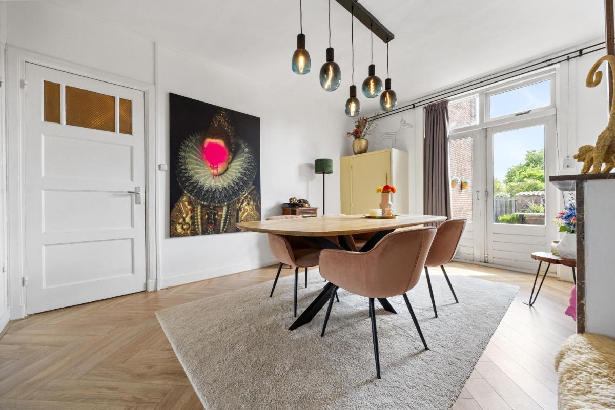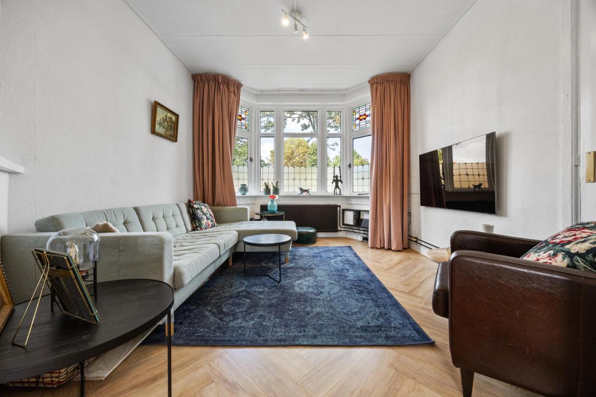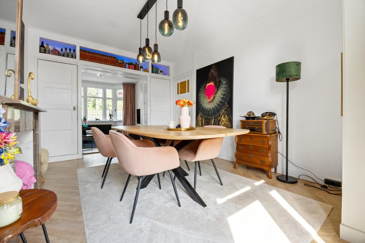 Bij binnenkomst in de woning valt direct de fijne indeling op: de centrale hal verbindt alle ruimtes op een logische en ruime manier. De lichte woonkamer aan de voorzijde (voormalige Kamer en Suite) heeft grote ramen en hoge plafonds – typisch jaren ’30 – en biedt een gezellige plek om te ontspannen. Aan de achterzijde vind je het eetgedeelte, met zicht en openslaande deuren naar de tuin welke gelegen is op het zuiden! Hier is voldoende ruimte voor een grote eettafel of een werkplek aan huis.