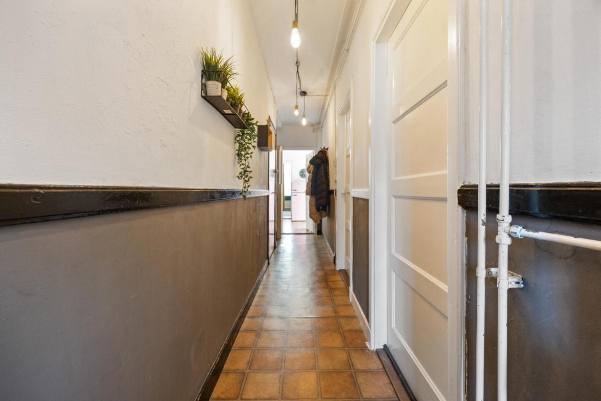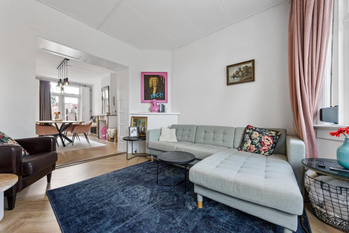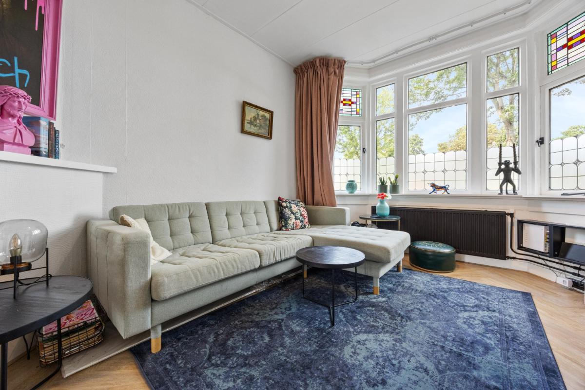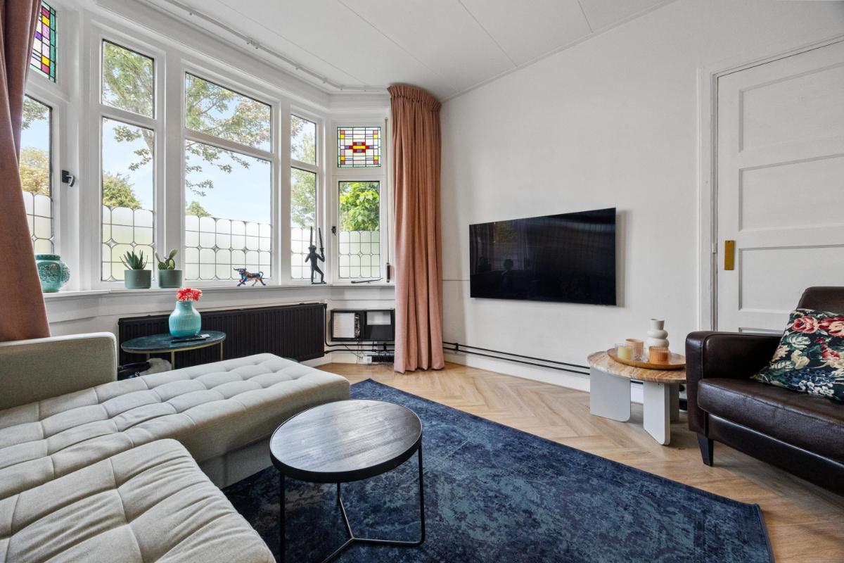 Bij binnenkomst in de woning valt direct de fijne indeling op: de centrale hal verbindt alle ruimtes op een logische en ruime manier. De lichte woonkamer aan de voorzijde (voormalige Kamer en Suite) heeft grote ramen en hoge plafonds – typisch jaren ’30 – en biedt een gezellige plek om te ontspannen. Aan de achterzijde vind je het eetgedeelte, met zicht en openslaande deuren naar de tuin welke gelegen is op het zuiden! Hier is voldoende ruimte voor een grote eettafel of een werkplek aan huis.