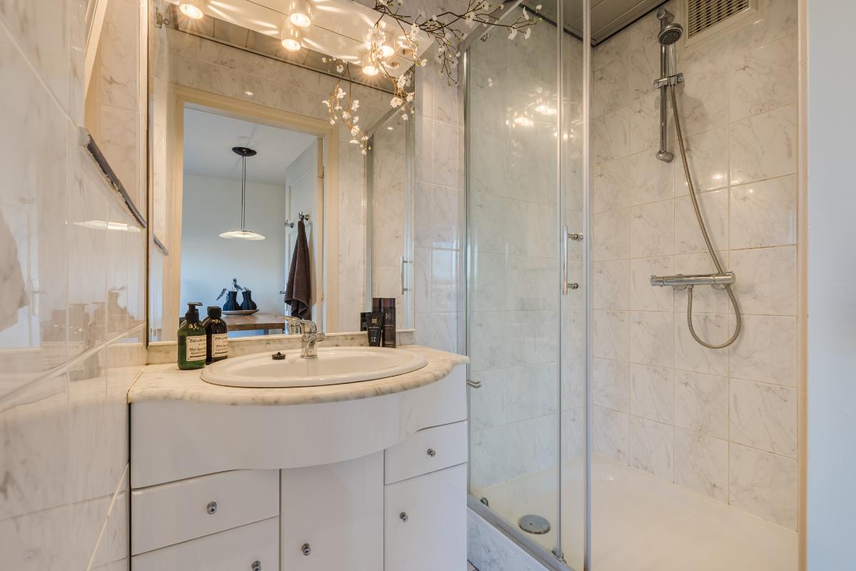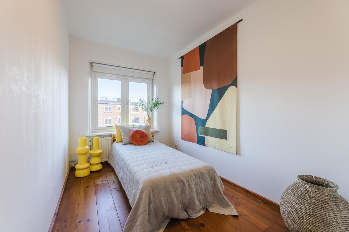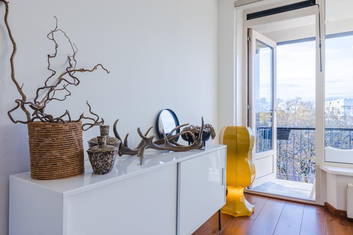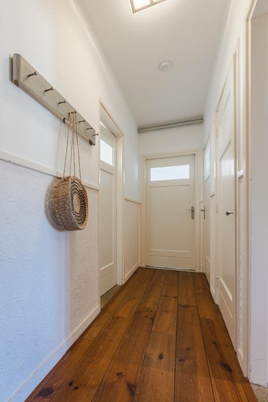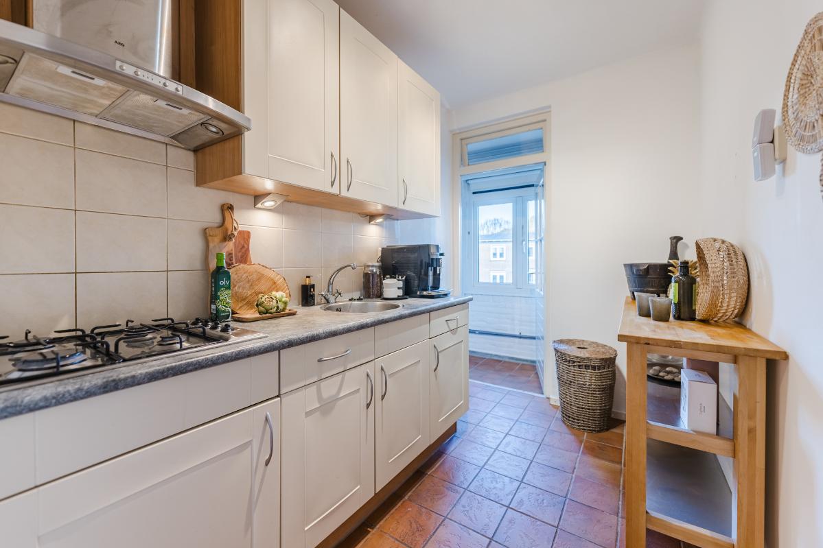 Appartement derde verdieping: Entree, gang met mooie betonemaille wand, meterkast en toiletruimte met toilet en fontein. Doorzonkamer met veel lichtinval, fraaie houten vloer, mooie schouw en toegang naar het balkon aan de voorzijde, waar je heerlijk kan genieten van de middag/avondzon. Dichte keuken met tegelvloer en afzuigkap, 4-pists gaskookplaat en spoelbak. Aan de achterzijde aparte berg-/wasruimte met wasmachine aansluiting en kast met daarin de cv-ketel (2000). Twee slaapkamers eveneens met houten vloeren en inbouwkasten. Doucheruimte met wastafelmeubel en douchecabine.