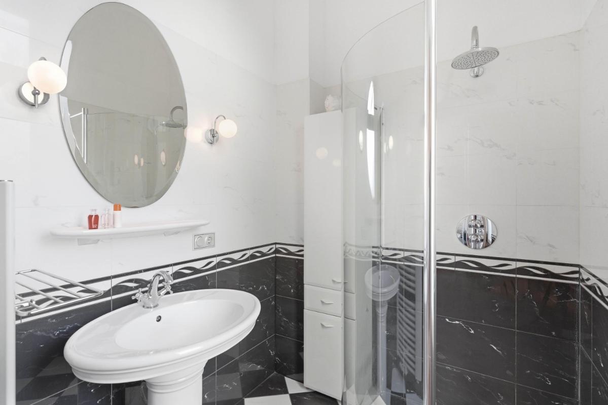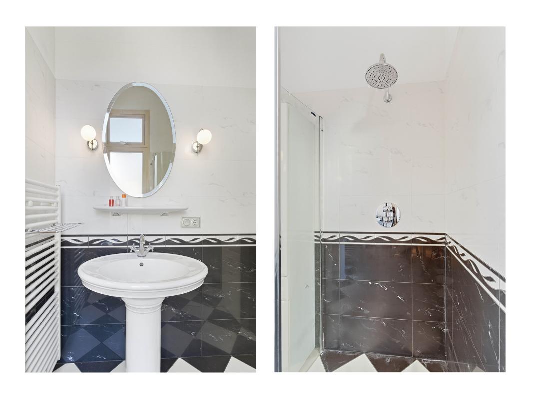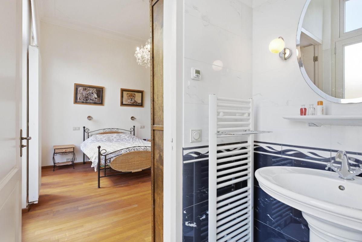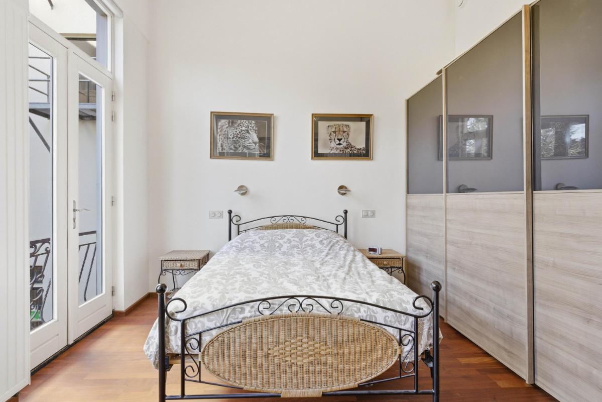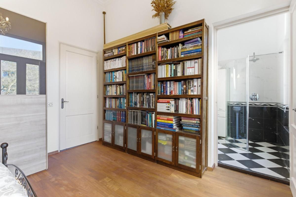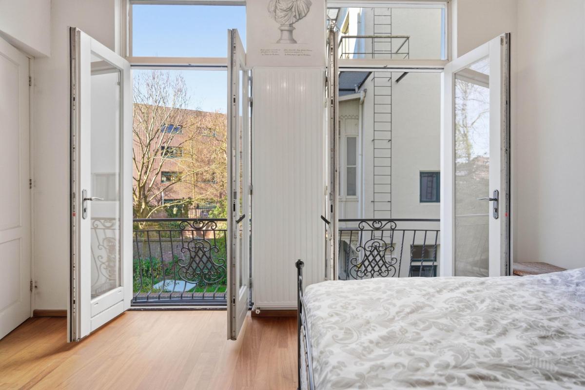 De ruime slaapkamer met Franse balkons is eveneens voorzien van een houten parketvloer. De moderne badkamer is uitgevoerd met een royale inloopdouche met regendouche, wastafel en comfortabele vloerverwarming.