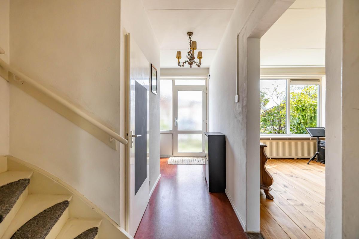 Begane grond Via de voortuin met veel groen bereik je de entree van de woning. In de hal bevinden zich het toilet met fonteintje, de meterkast, een diepe trapkast, de trapopgang naar de eerste verdieping en toegang tot de woonkamer. Opvallend is dat de hal beschikt over twee deuren naar de woonkamer, waardoor je zowel direct het zitgedeelte als het eetgedeelte kunt betreden.