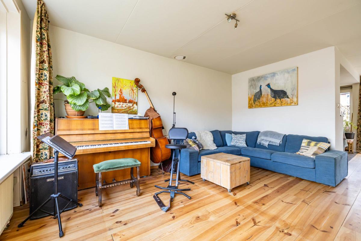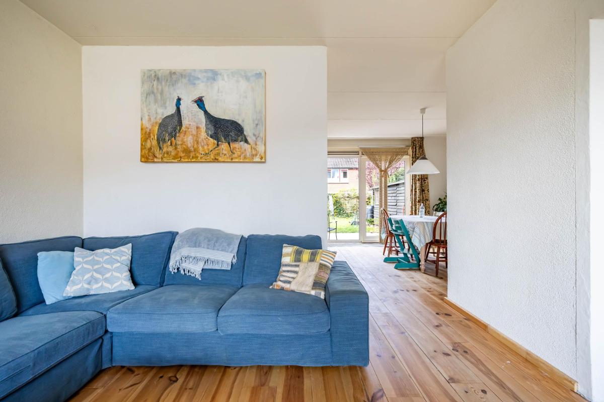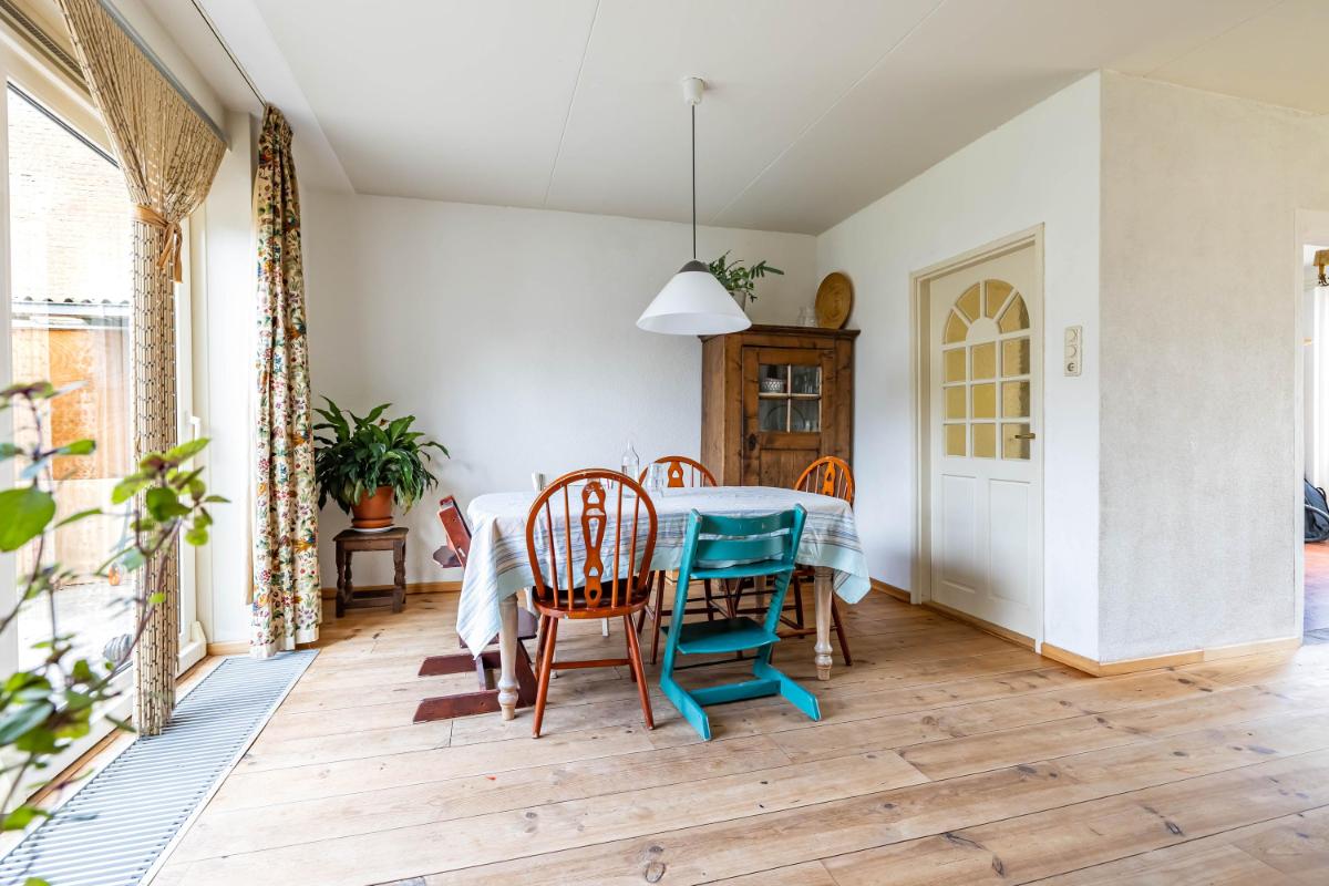 De woonkamer is licht en ruim opgezet en kenmerkt zich door de Z-vorm, waardoor er een natuurlijke scheiding ontstaat tussen het zit- en eetgedeelte. Dit maakt het geheel niet alleen speels, maar ook praktisch in gebruik. De houten planken vloer zorgt hierbij voor een warme en sfeervolle uitstraling, terwijl de grote raampartijen zorgen voor een aangename hoeveelheid daglicht in de gehele ruimte.