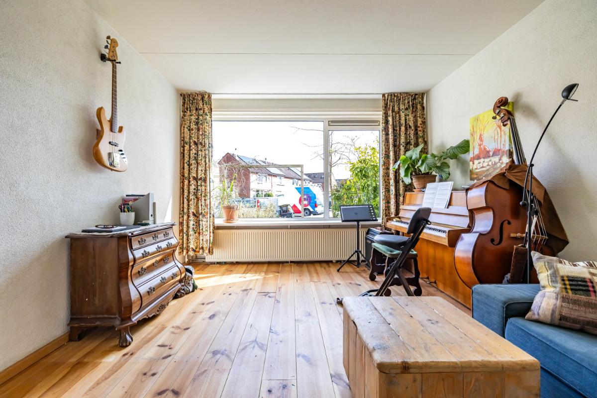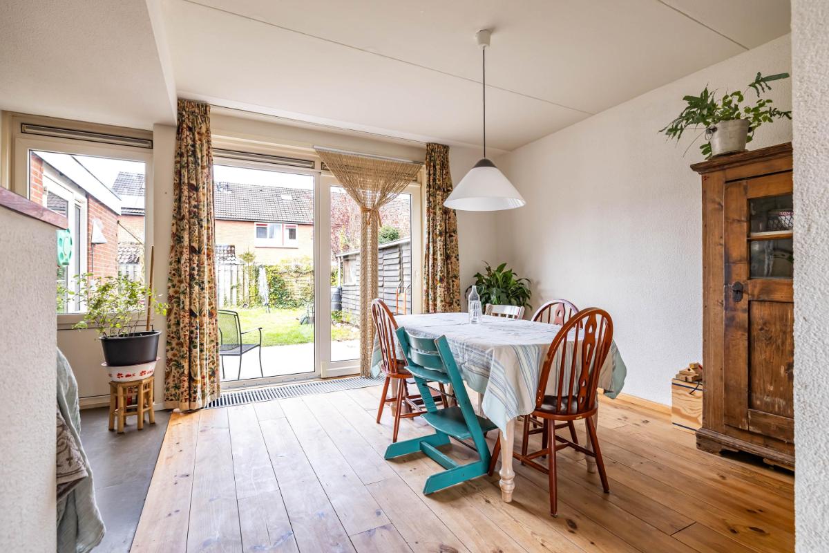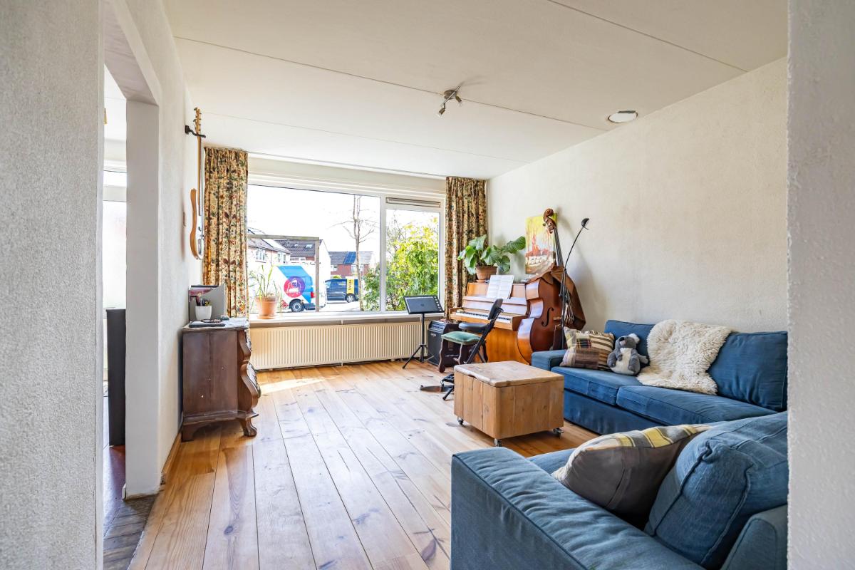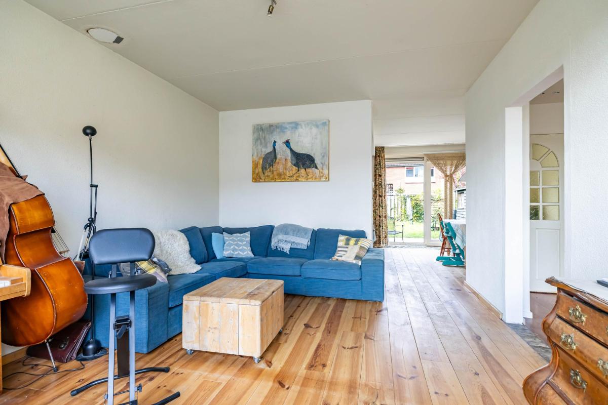 De woonkamer is licht en ruim opgezet en kenmerkt zich door de Z-vorm, waardoor er een natuurlijke scheiding ontstaat tussen het zit- en eetgedeelte. Dit maakt het geheel niet alleen speels, maar ook praktisch in gebruik. De houten planken vloer zorgt hierbij voor een warme en sfeervolle uitstraling, terwijl de grote raampartijen zorgen voor een aangename hoeveelheid daglicht in de gehele ruimte.