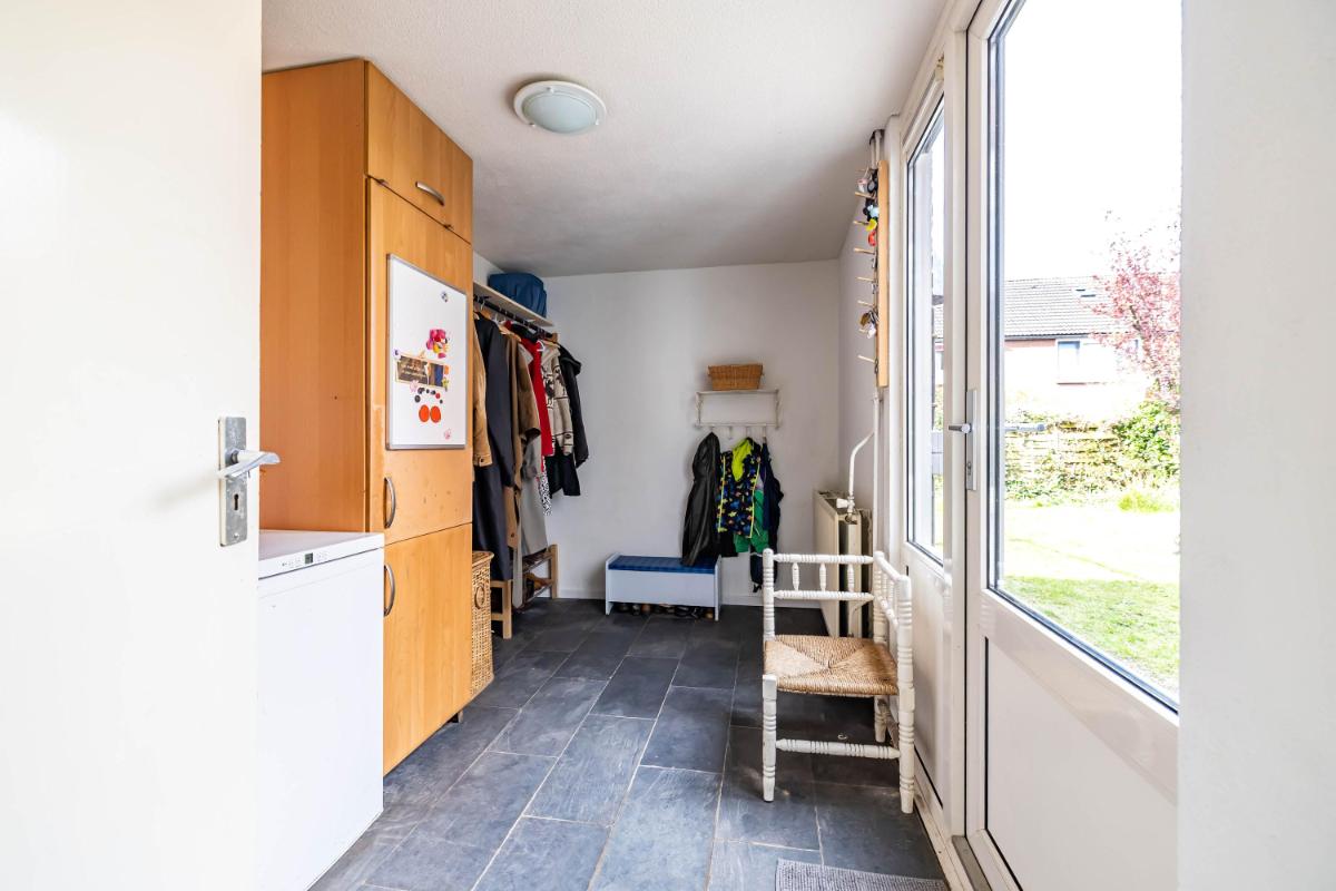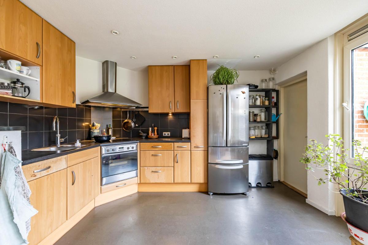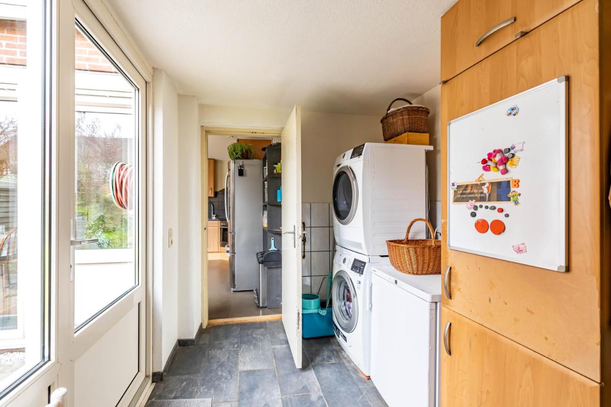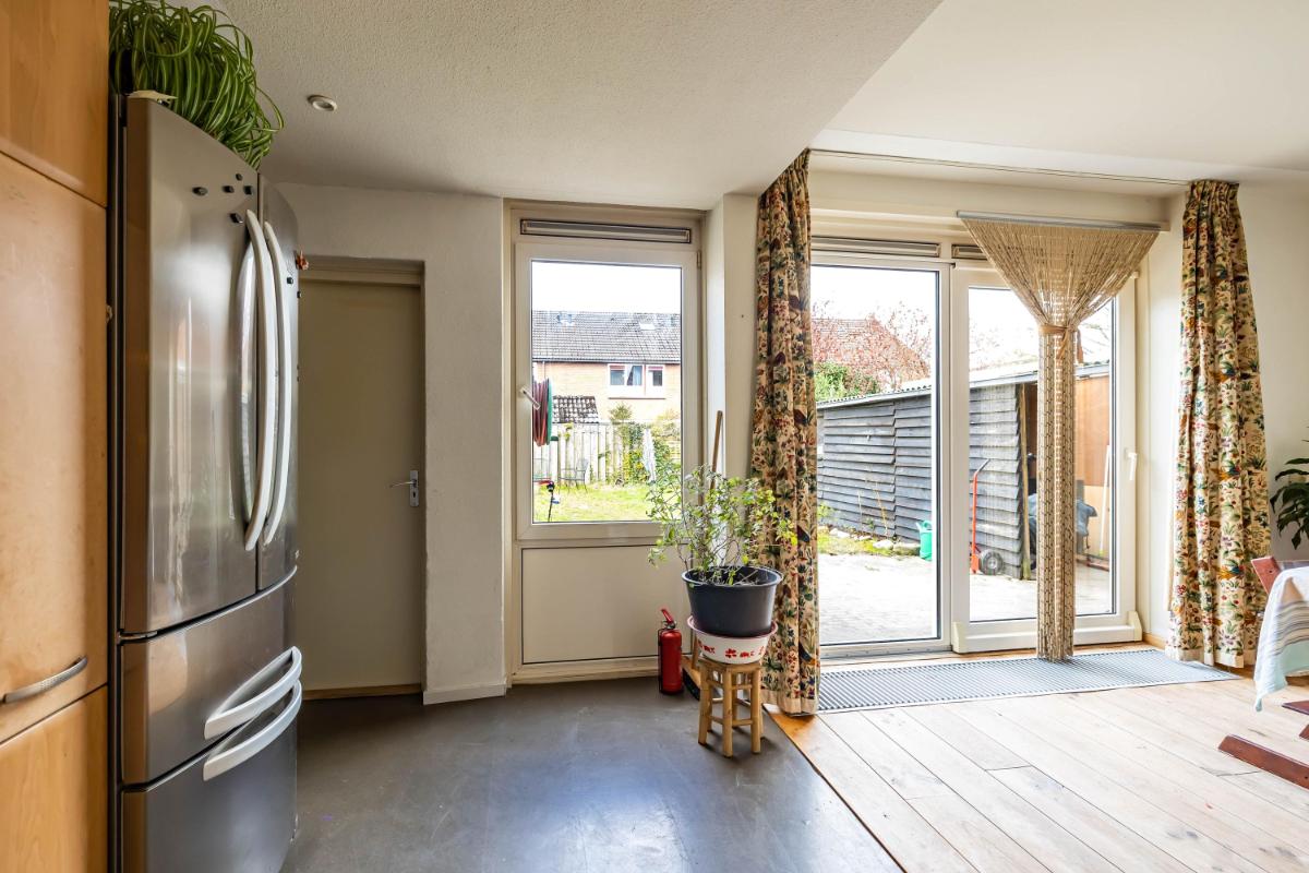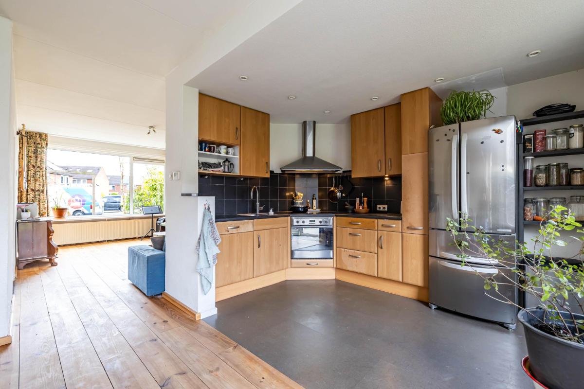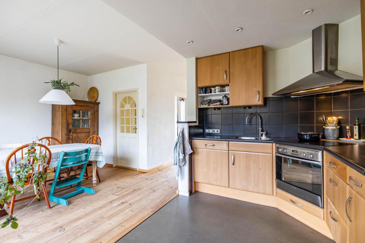 Aan de achterzijde bevindt zich de eethoek, direct grenzend aan de open keuken. De keuken is uitgevoerd met een verzorgd keukenblok en voorzien van een inductiekookplaat, afzuigkap en een Quooker. De grote schuifpui bij de eethoek zorgt voor een fijne lichtinval en een directe verbinding met de tuin. Tevens is hier een convectorput aanwezig, wat zorgt voor een strak afgewerkte ruimte zonder zichtbare radiatoren, een snelle warmteafgifte en de mogelijkheid om er eenvoudig overheen te lopen. Via de keuken bereik je de afgesloten bijkeuken, die is voorzien van een wasmachineaansluiting en extra bergruimte. Vanuit de bijkeuken is eveneens de achtertuin toegankelijk, wat het geheel extra praktisch maakt.
