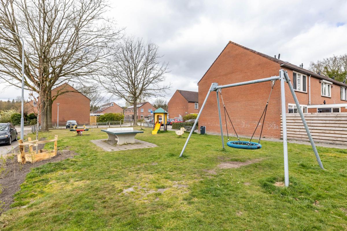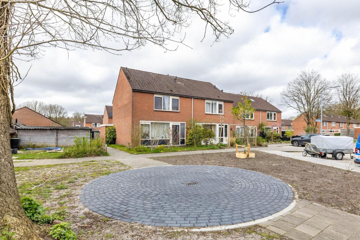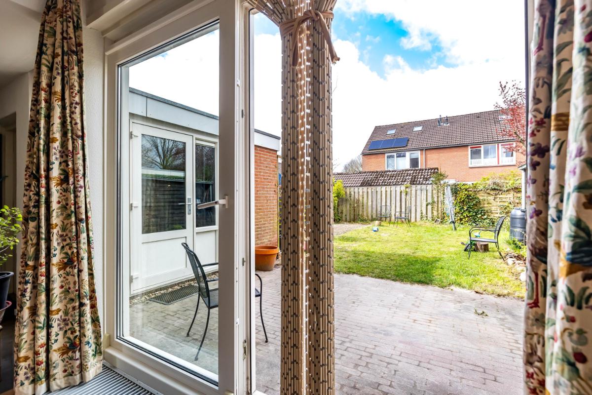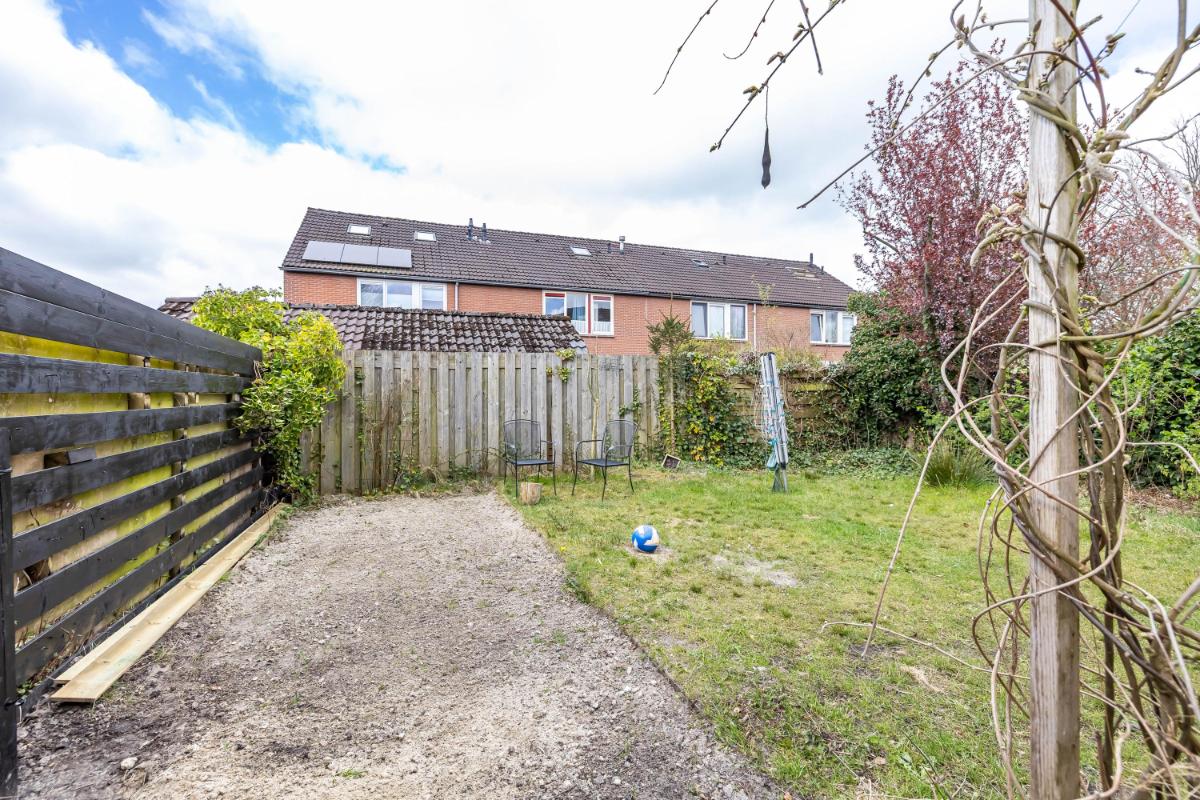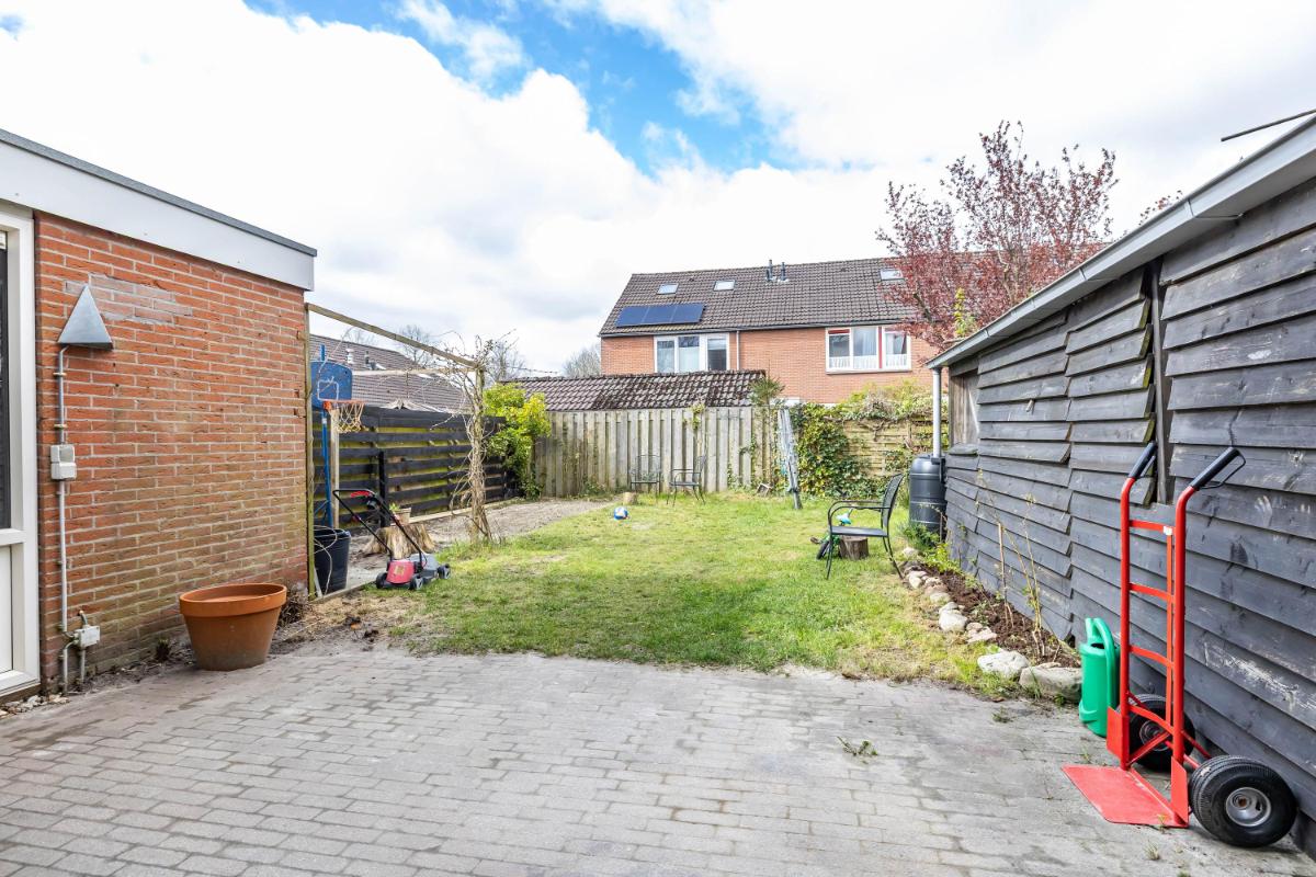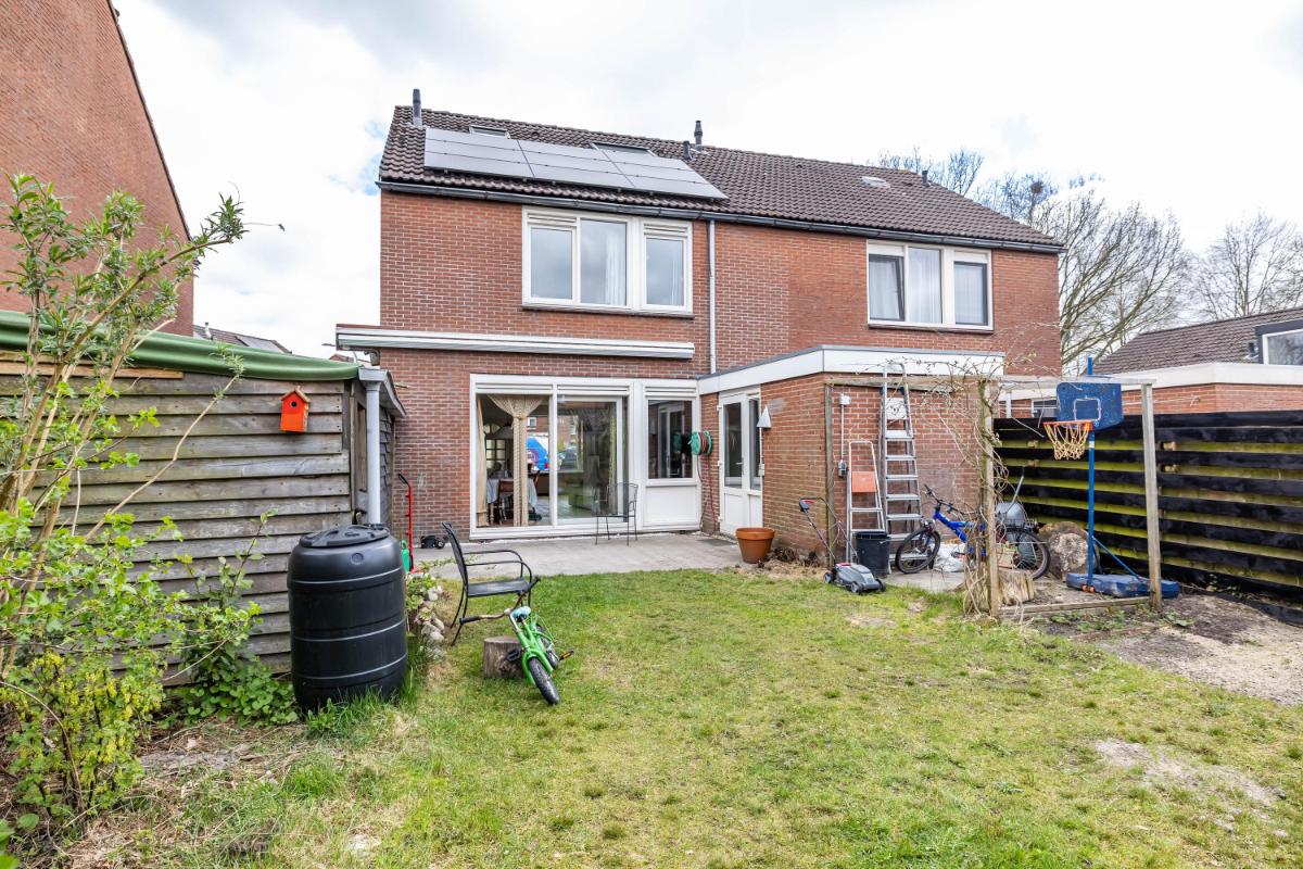 Direct bij de woning aan de achterzijde bevindt zich een betegeld terras waar je heerlijk kunt zitten. Daar is bovendien royale zonwering aanwezig, waardoor je op warme dagen eenvoudig schaduw creëert en comfortabel buiten kunt verblijven. Het overige deel van de tuin is grotendeels voorzien van gazon. Er is volop ruimte om de tuin naar eigen wens verder in te richten, bijvoorbeeld met extra borders en beplanting. Bij de aanleg van de tuin is gekozen voor grotere beplanting vanwege steeds heftigere regenbuien. De (deels eetbare) planten, struiken en bomen kunnen veel water opnemen, waardoor wateroverlast wordt beperkt.