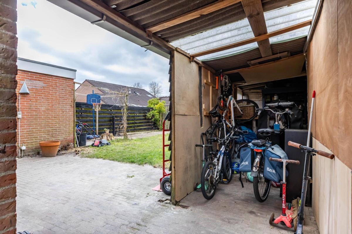 De aanwezige overkapping biedt praktische ruimte voor het stallen van fietsen of het opbergen van tuinspullen.