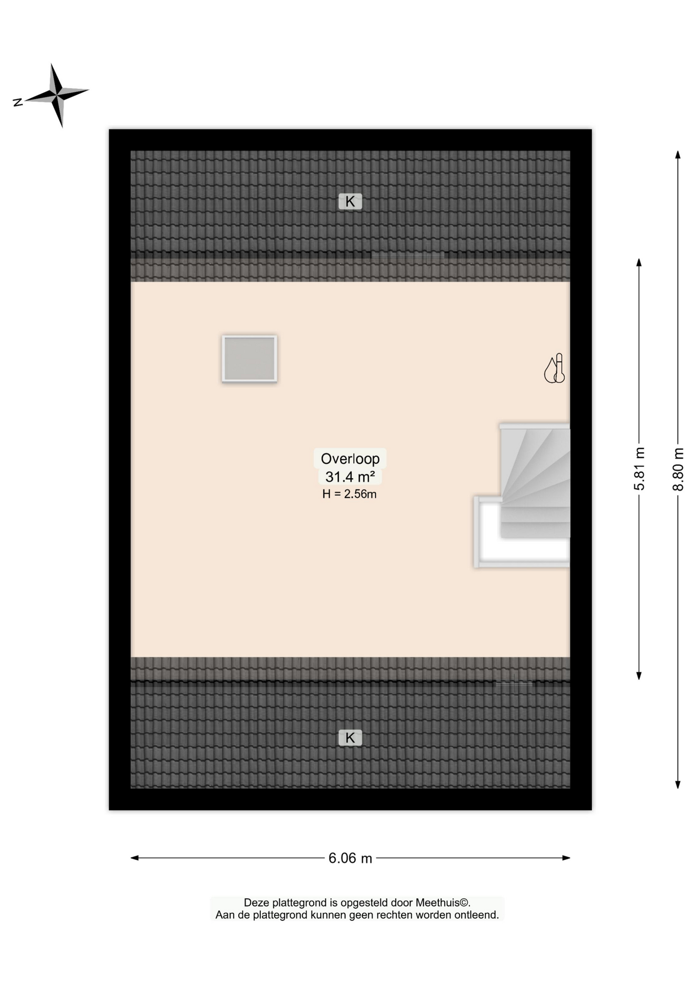 Tweede verdieping De vaste trap leidt naar de royale zolderverdieping van maar liefst circa 31 m². Met een hoogte van ongeveer 2,56 meter, een dakraam voor natuurlijke lichtinval en praktische bergruimte in de knieschotten voelt deze verdieping bijzonder ruim aan, en dat is hij ook!