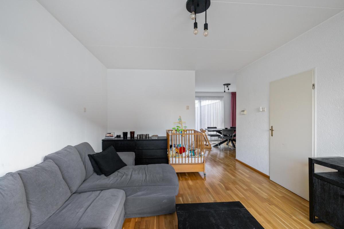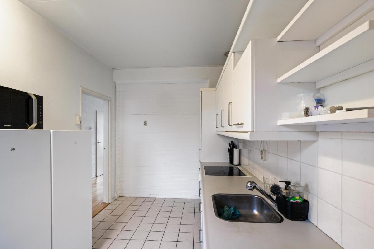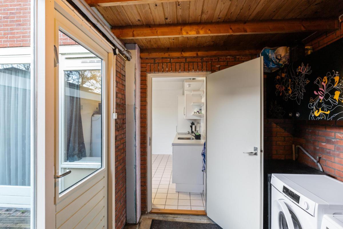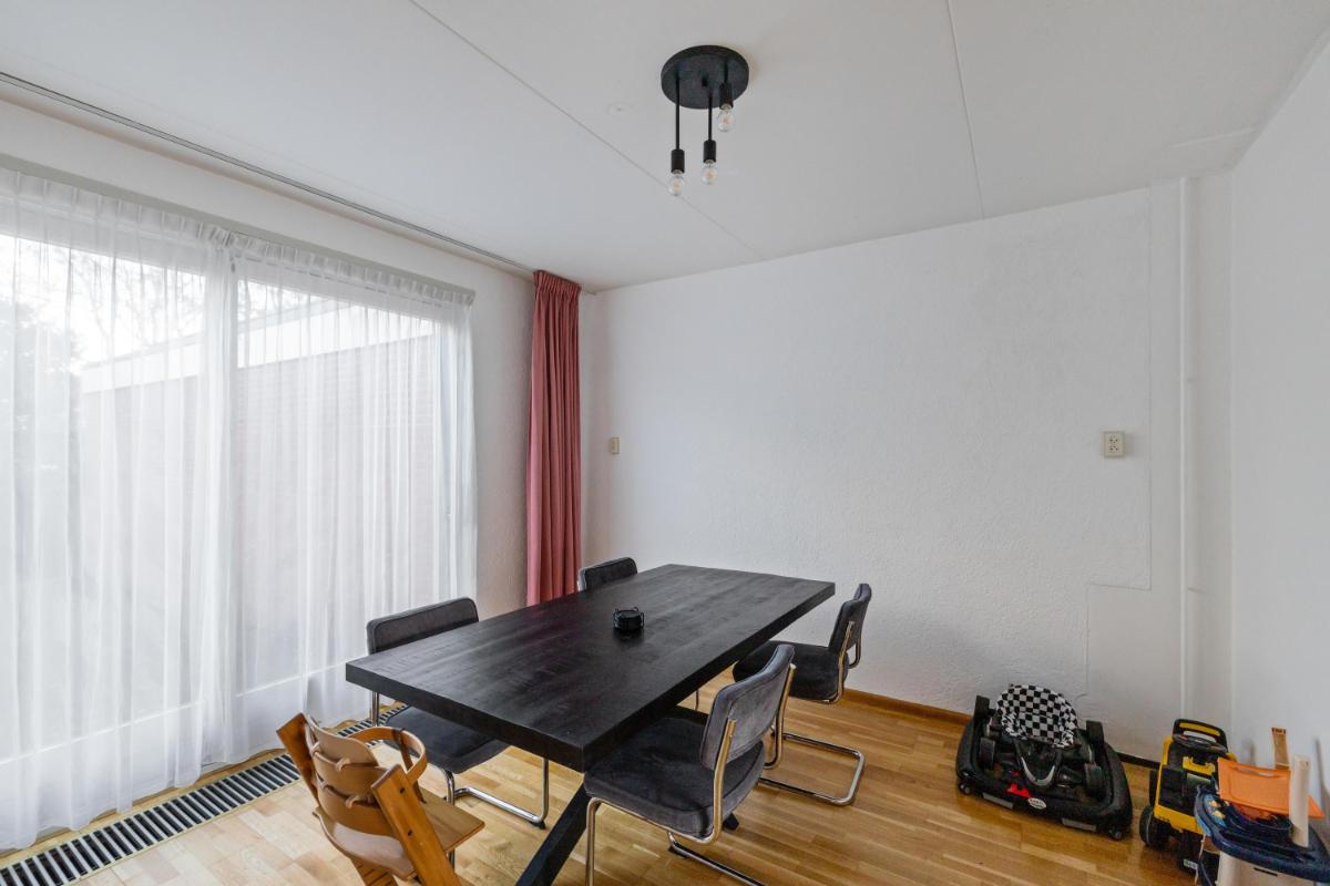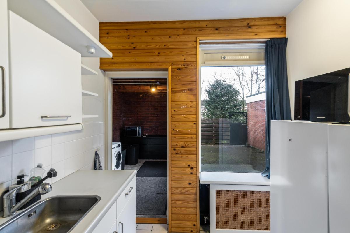 De woonkamer licht en ruim. Aan de achterzijde bevindt zich een grote schuifpui die zorgt voor veel daglicht bij de eethoek en een directe verbinding met de tuin. De dichte keuken ligt eveneens aan de achterzijde en is voorzien van een plavuizenvloer en een eenvoudig maar verzorgd keukenblok met kookplaat en afzuigkap. Aansluitend vind je de praktische bijkeuken met wasmachineaansluiting en toegang tot de achtertuin.