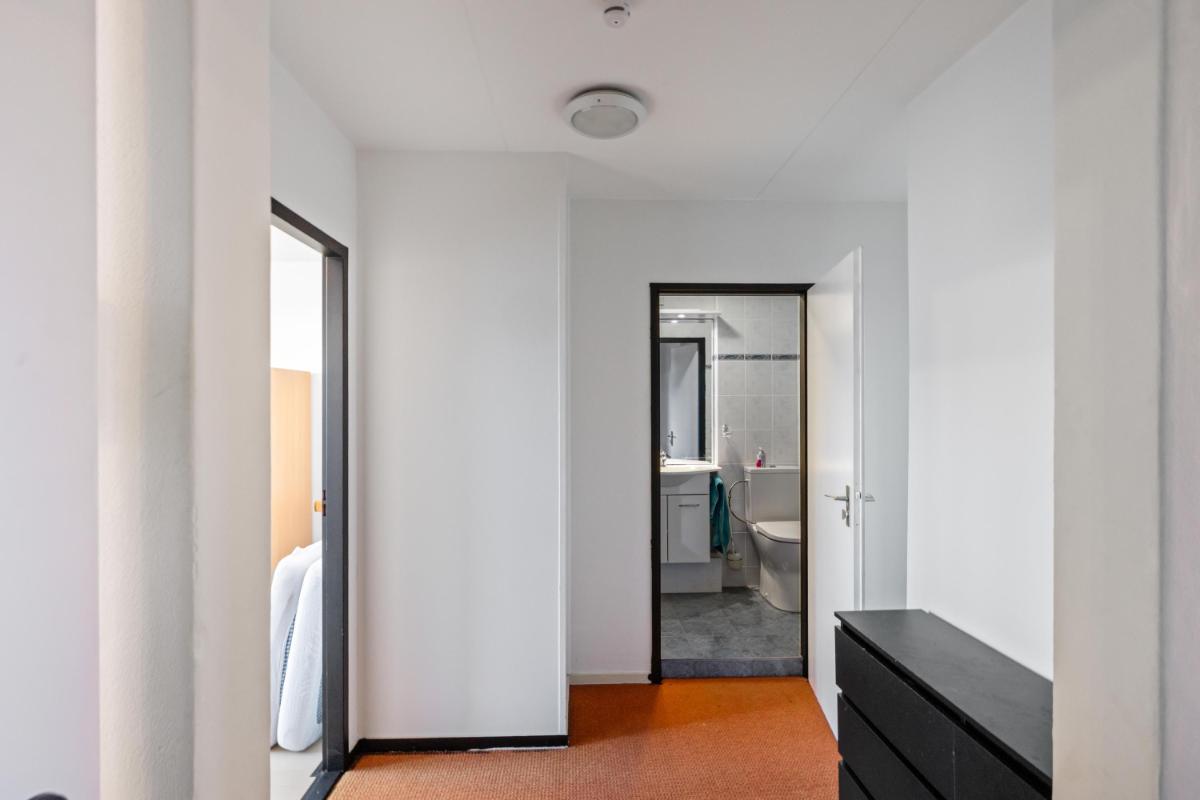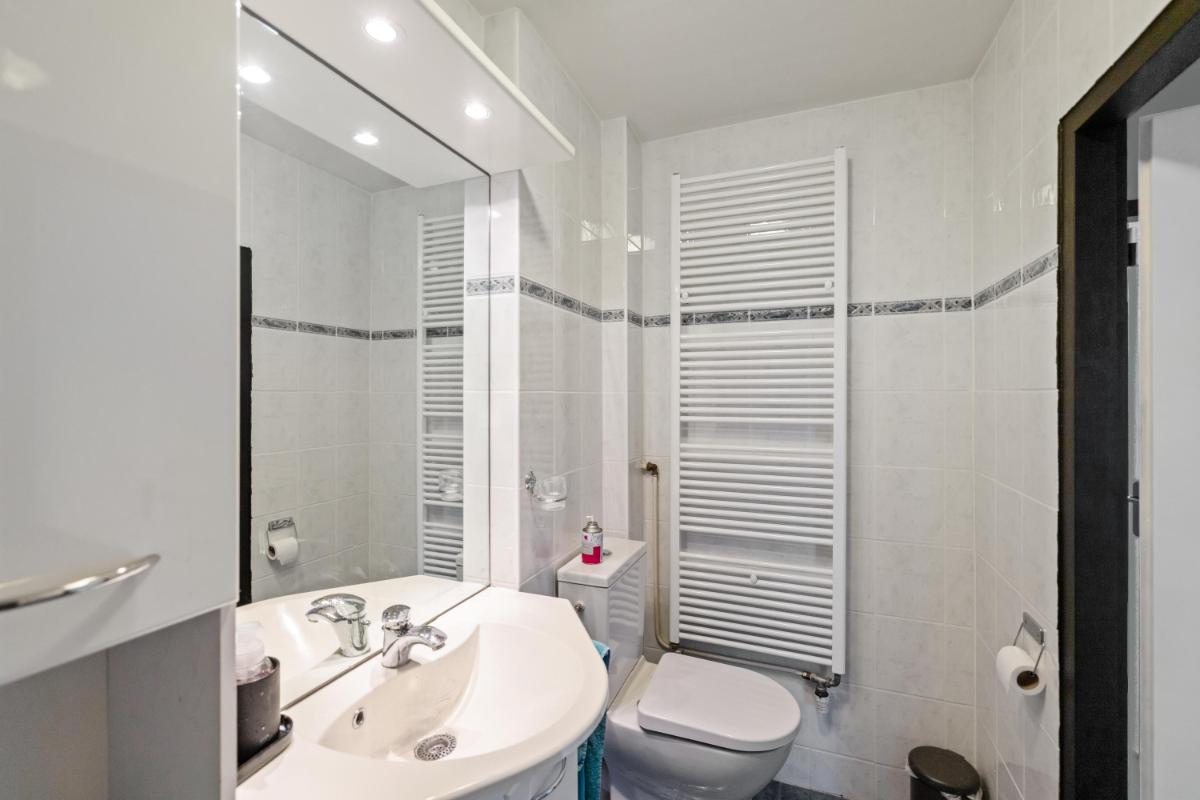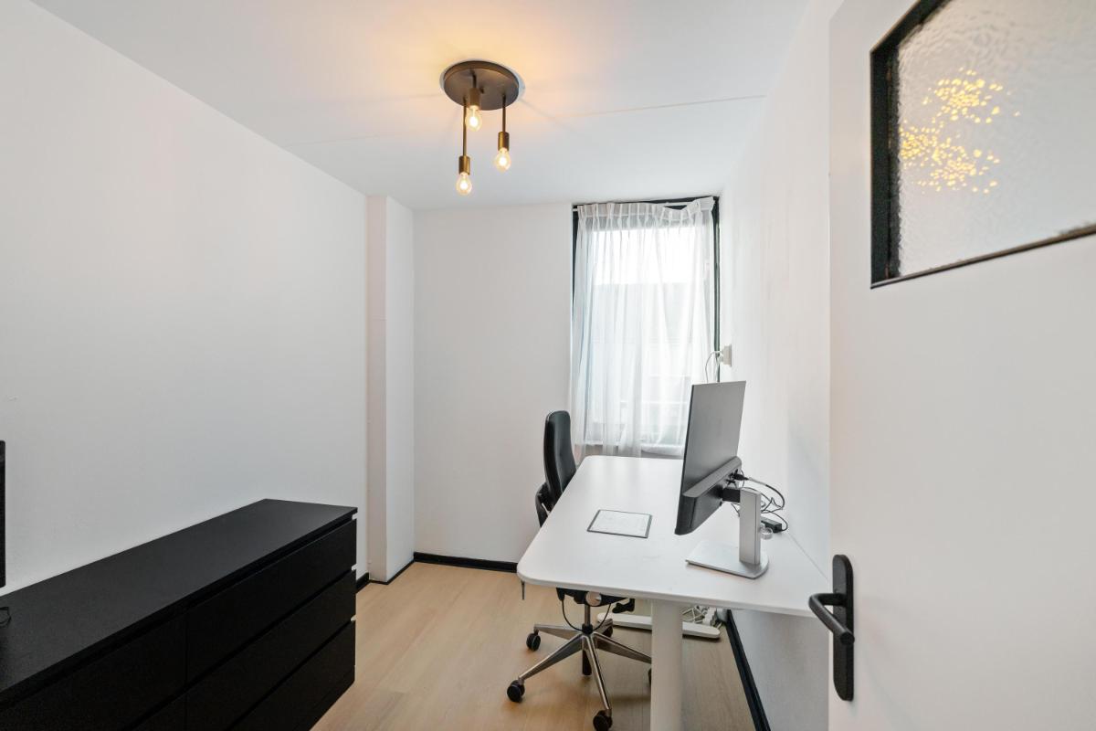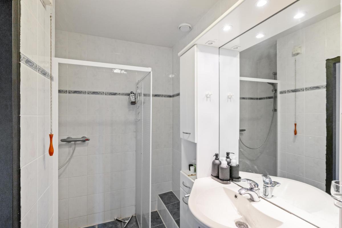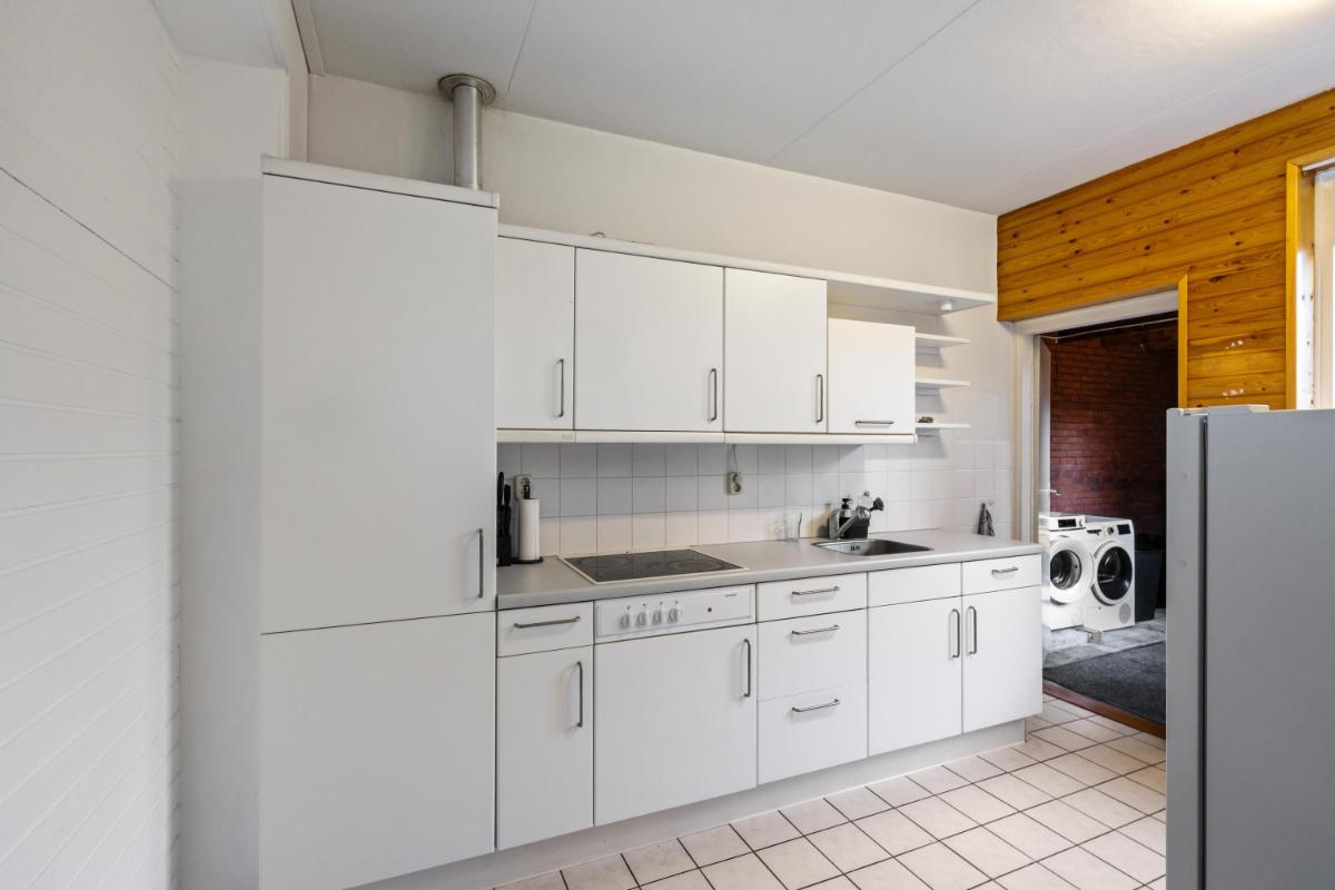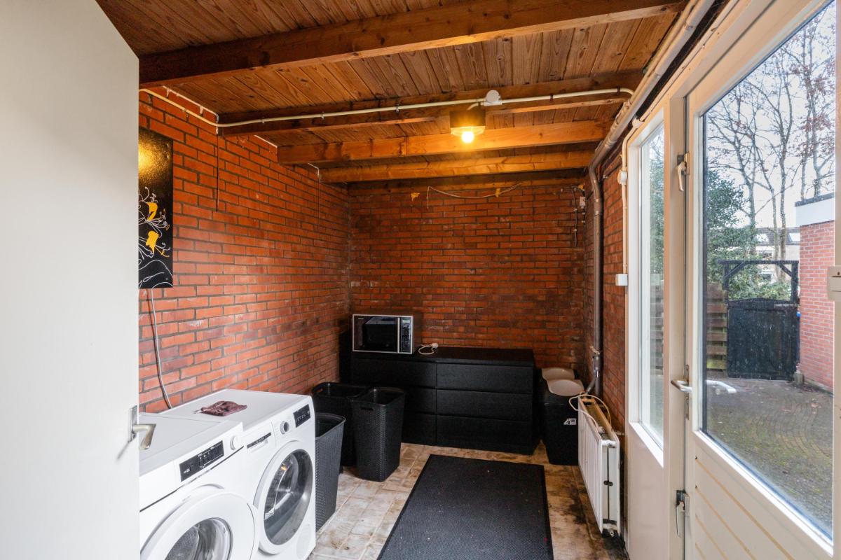 De woonkamer licht en ruim. Aan de achterzijde bevindt zich een grote schuifpui die zorgt voor veel daglicht bij de eethoek en een directe verbinding met de tuin. De dichte keuken ligt eveneens aan de achterzijde en is voorzien van een plavuizenvloer en een eenvoudig maar verzorgd keukenblok met kookplaat en afzuigkap. Aansluitend vind je de praktische bijkeuken met wasmachineaansluiting en toegang tot de achtertuin.