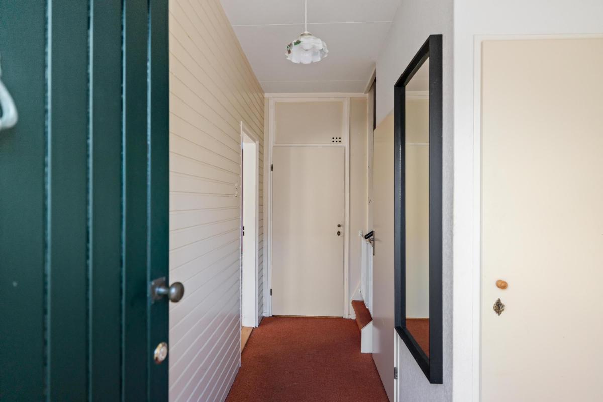 Indeling Begane grond Via de nette, volledig bestrate voortuin bereik je de entree van de woning. In de hal bevinden zich het toilet met fonteintje, de meterkast, een diepe trapkast en de vaste trap naar de eerste verdieping. De vloerbedekking in de hal loopt door op de trap.