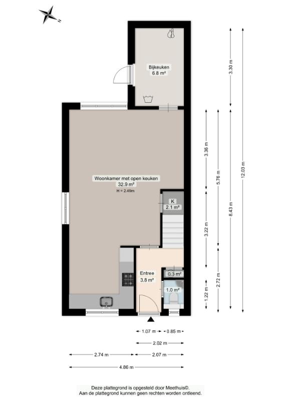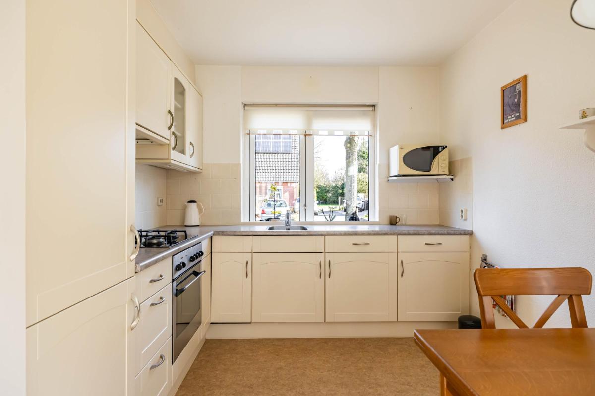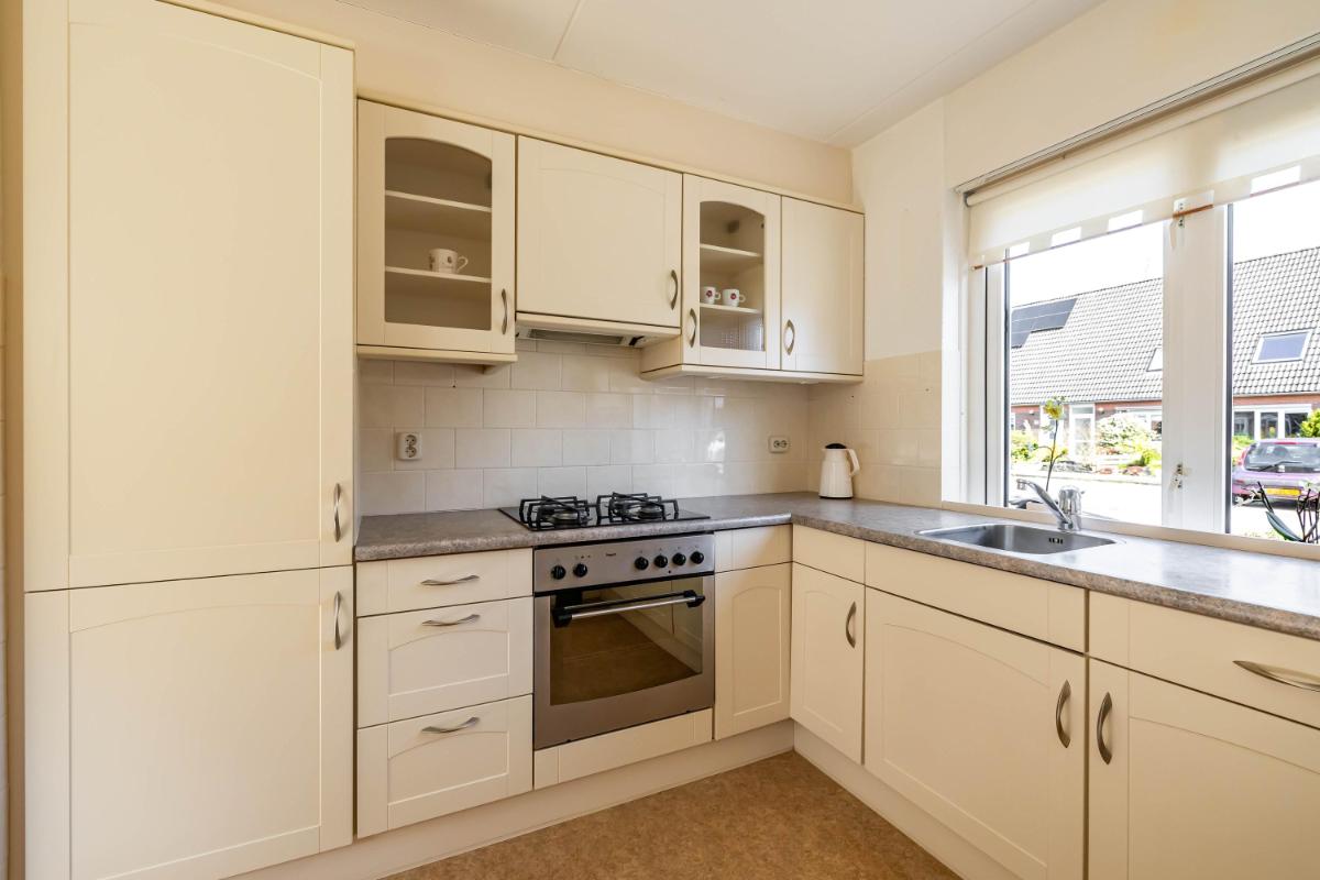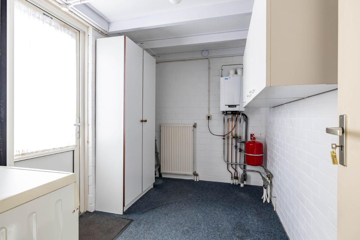 Begane grond Via de entree met hal, meterkast, toilet en trapopgang bereik je de woonkamer. De ruime woonkamer met open L-vormige keuken aan de voorzijde vormt een fijne leefruimte. Onder de trap bevindt zich een praktische provisiekast. Aan de achterzijde van de woning is de bijkeuken gesitueerd, waar zich de witgoedaansluitingen en de cv-ketel bevinden. Vanuit hier heb je directe toegang tot de tuin.