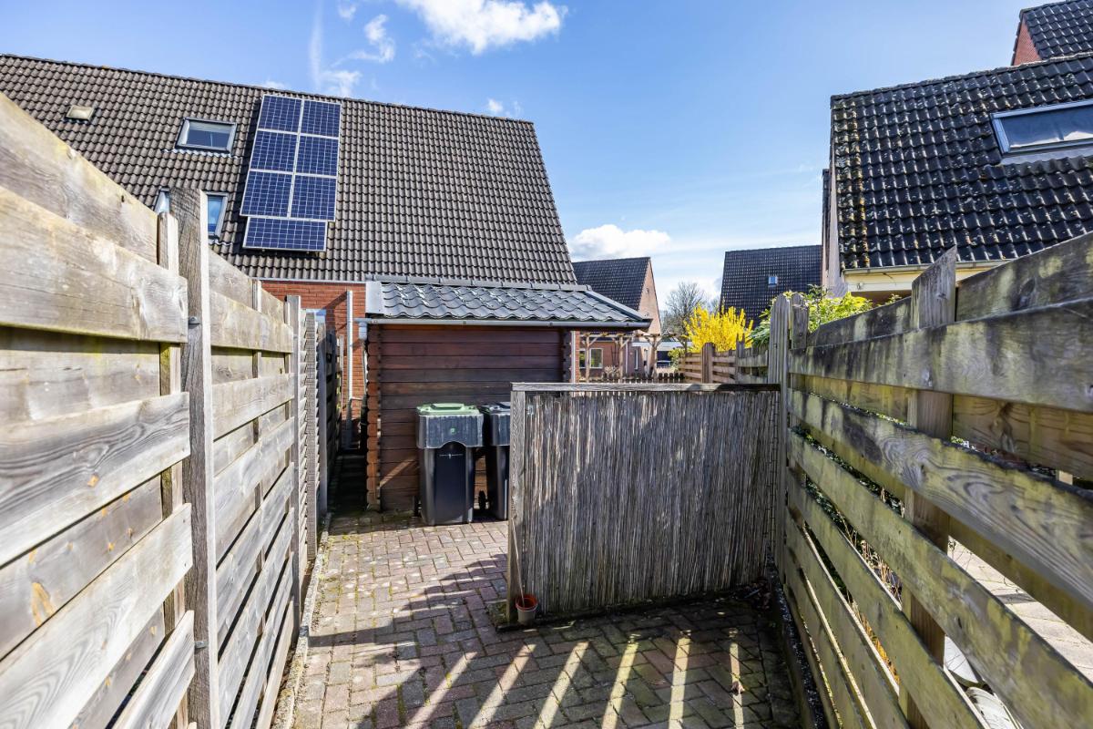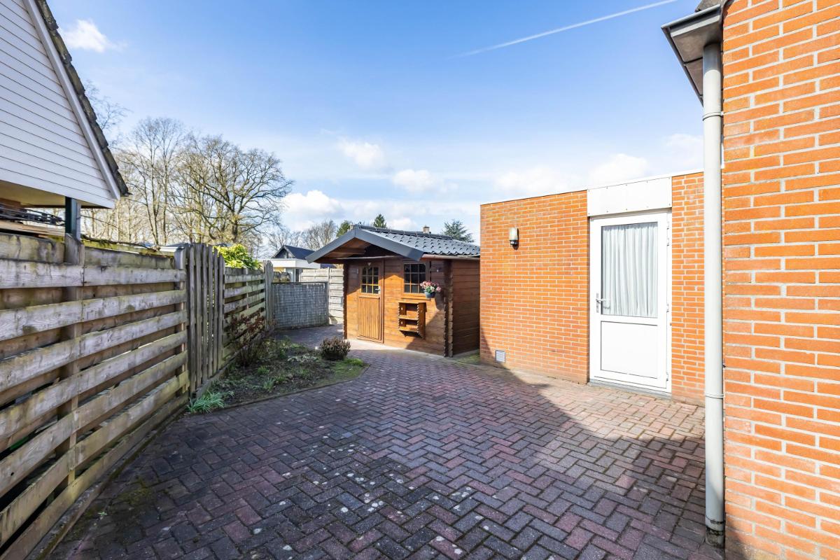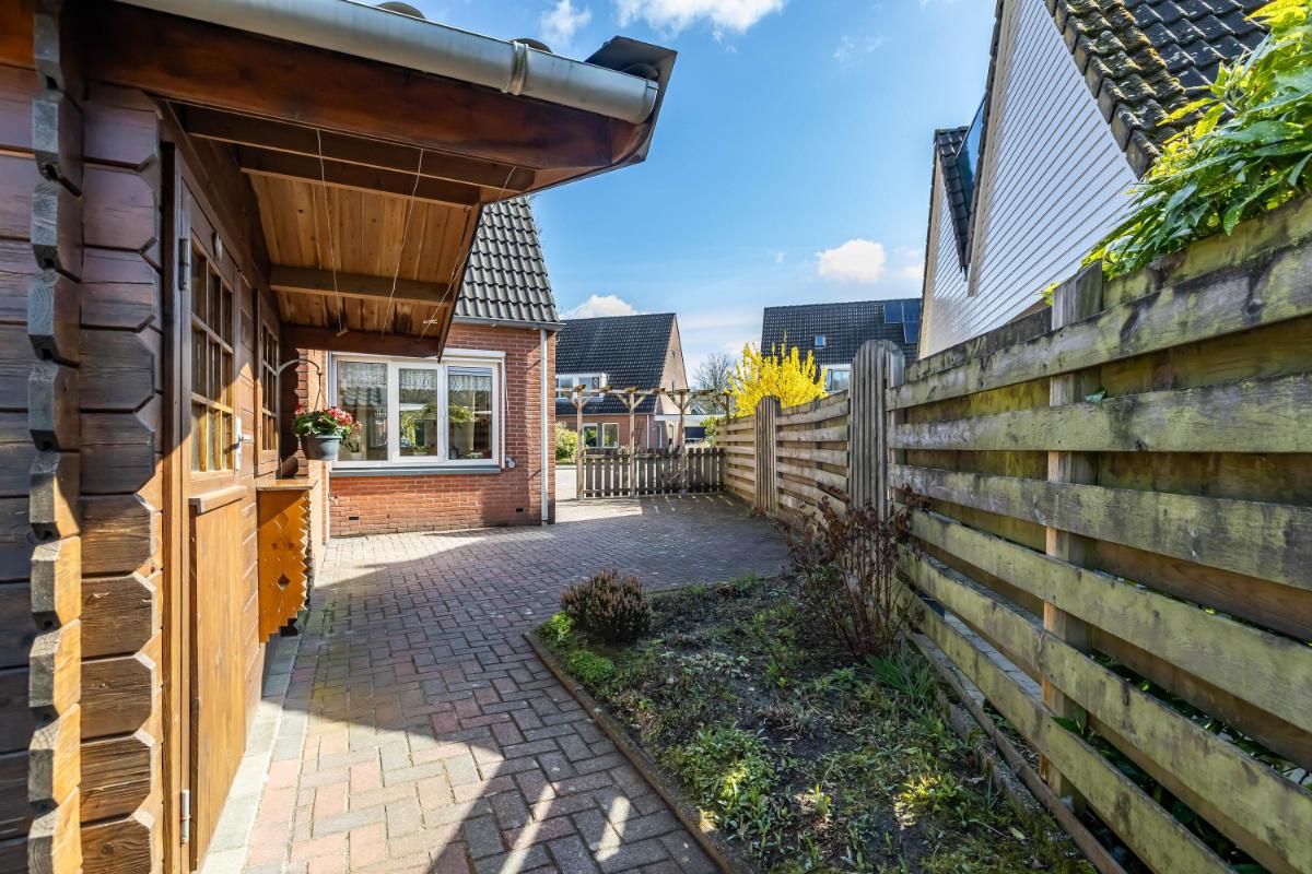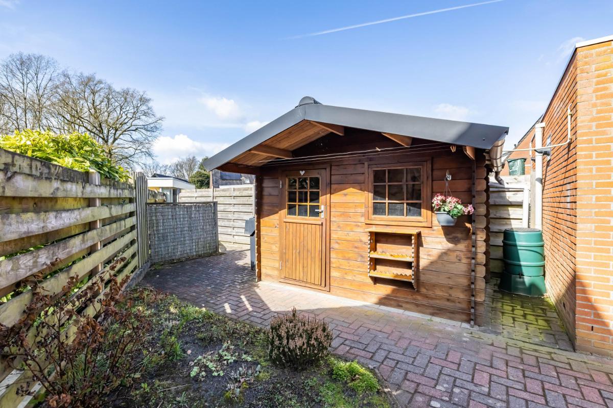 Buitenruimte & tuin De tuin is verzorgd aangelegd en biedt een fijne plek om buiten te zitten. In de achtertuin staat een houten blokhut/berging, ideaal voor het opbergen van fietsen, tuingereedschap of extra opslag.