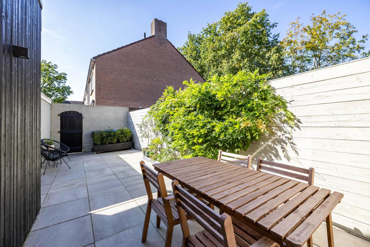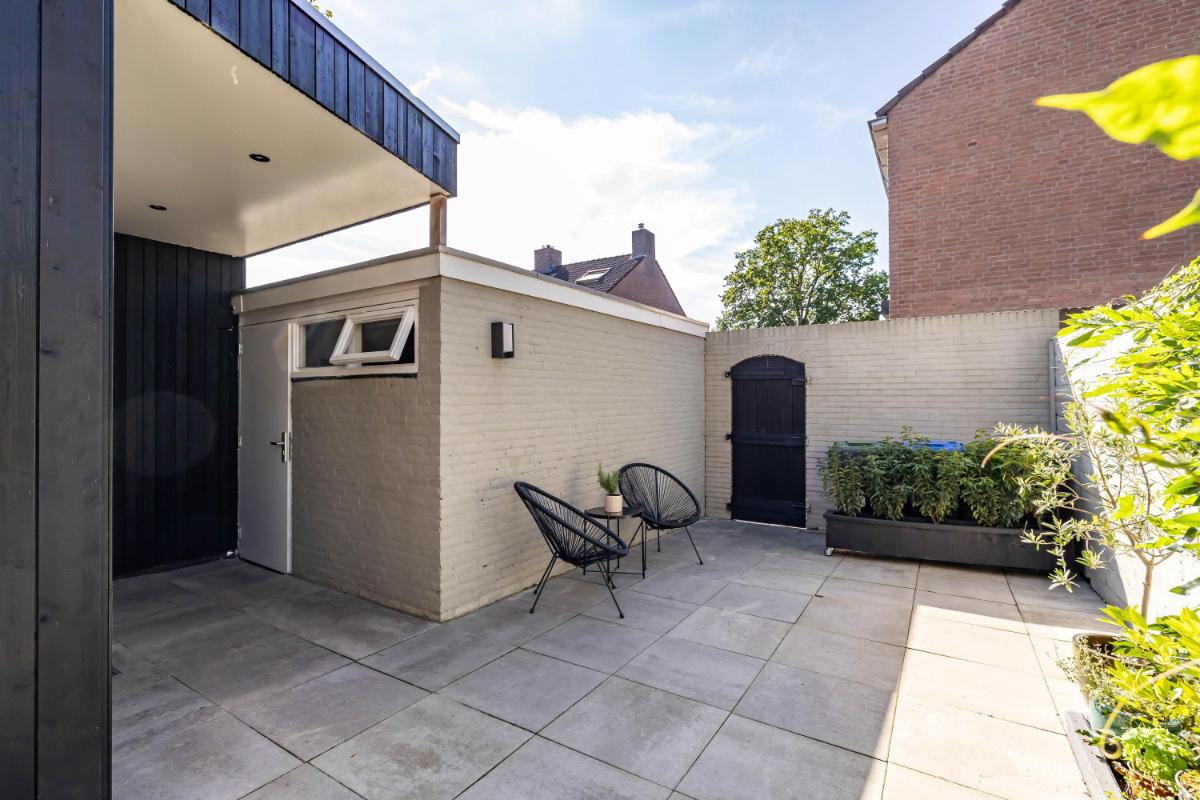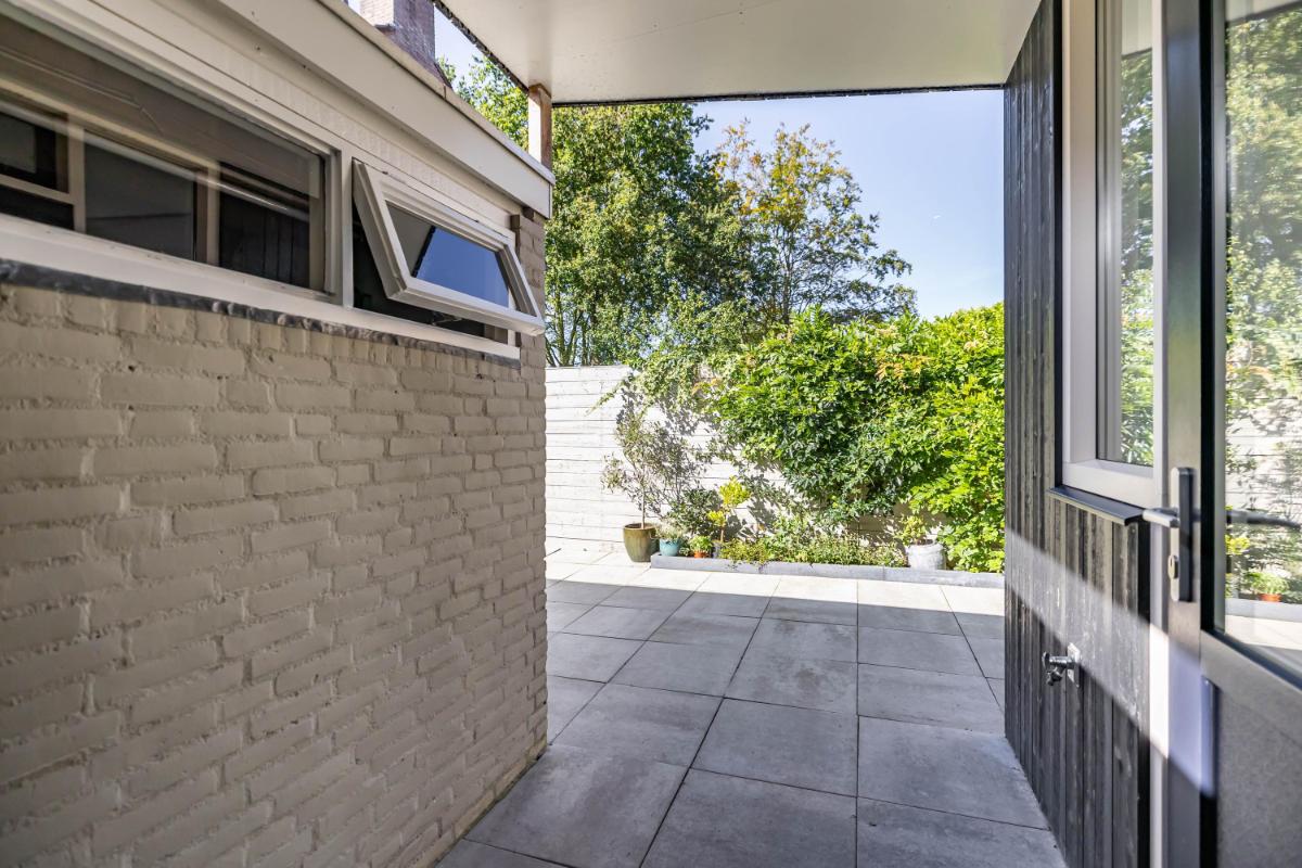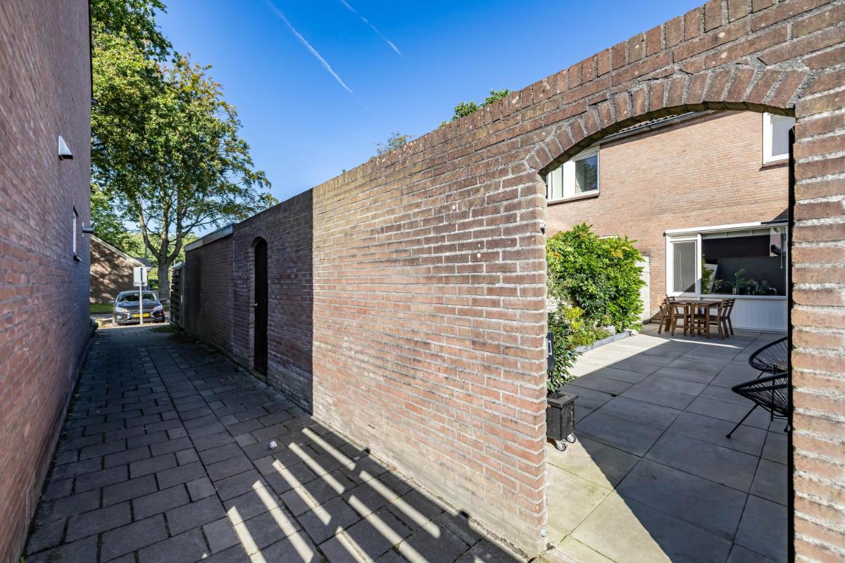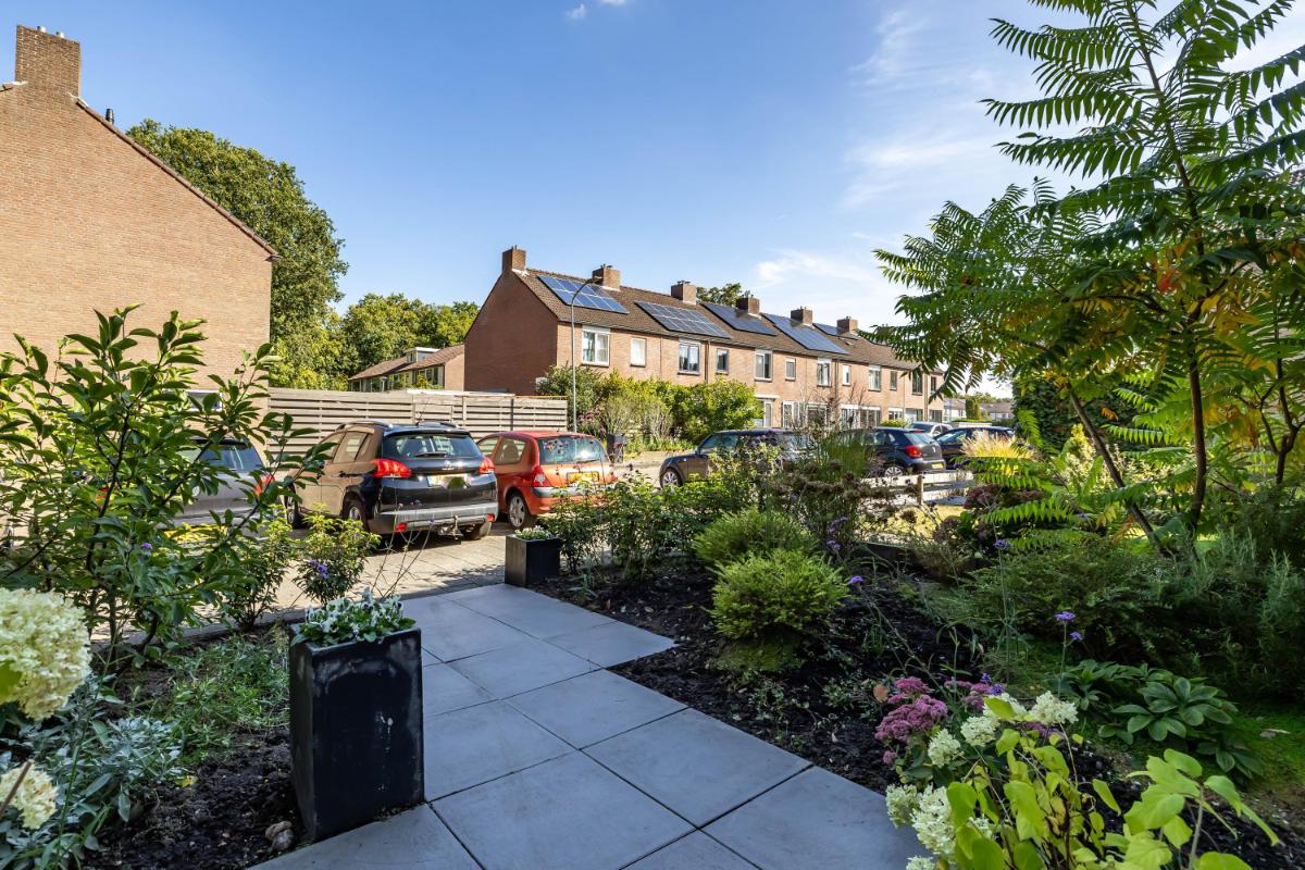 Tuin De zonnige achtertuin is netjes aangelegd een voorzien van sierbestrating en diverse beplanting. Je hebt hier geen directe inkijk maar wél een handige achterom. De stenen berging is droog te bereiken via de overkapping en beschikt over elektra.