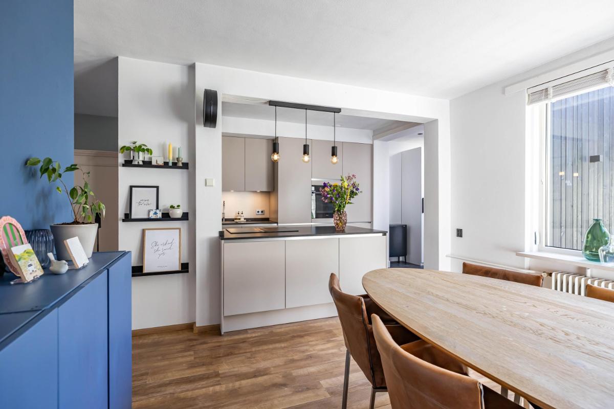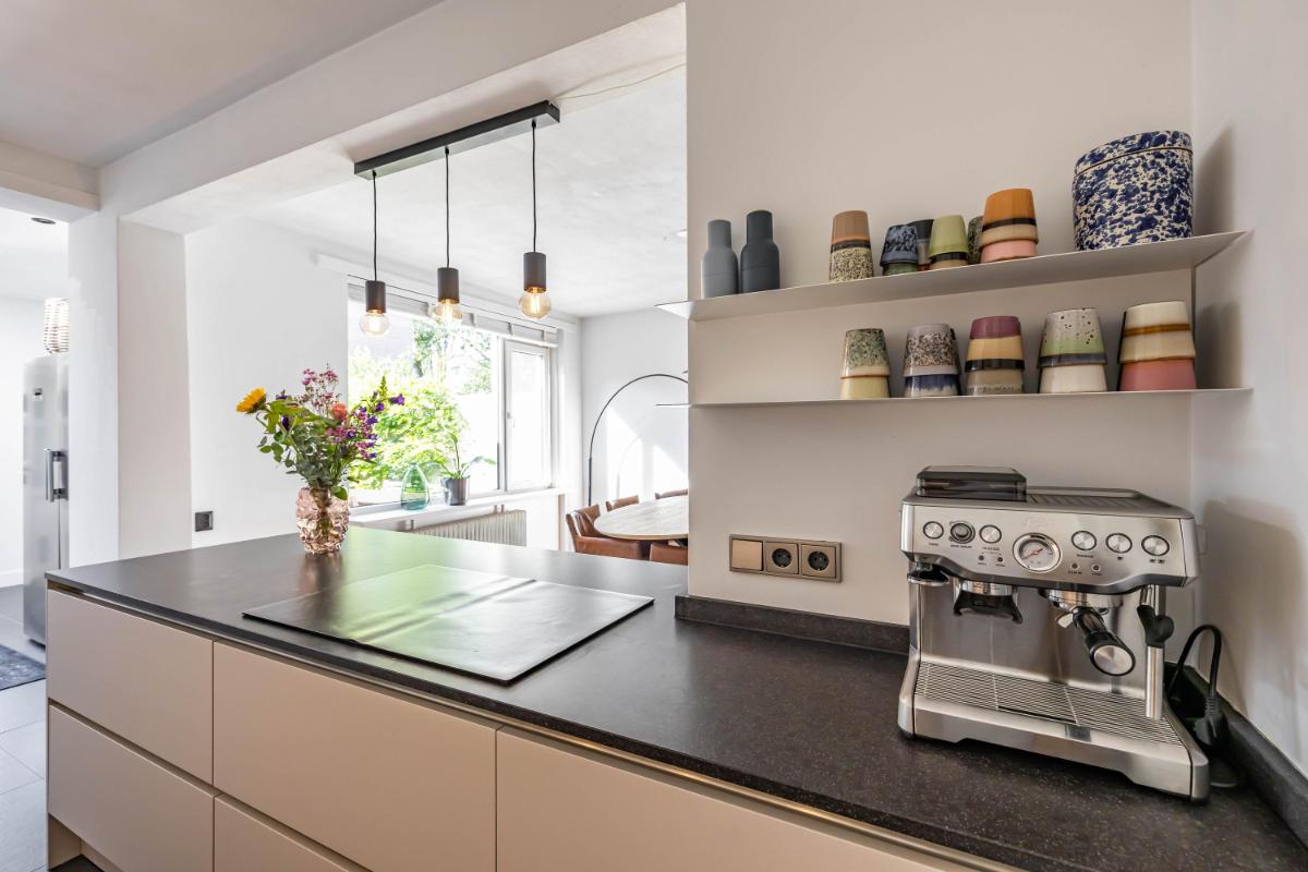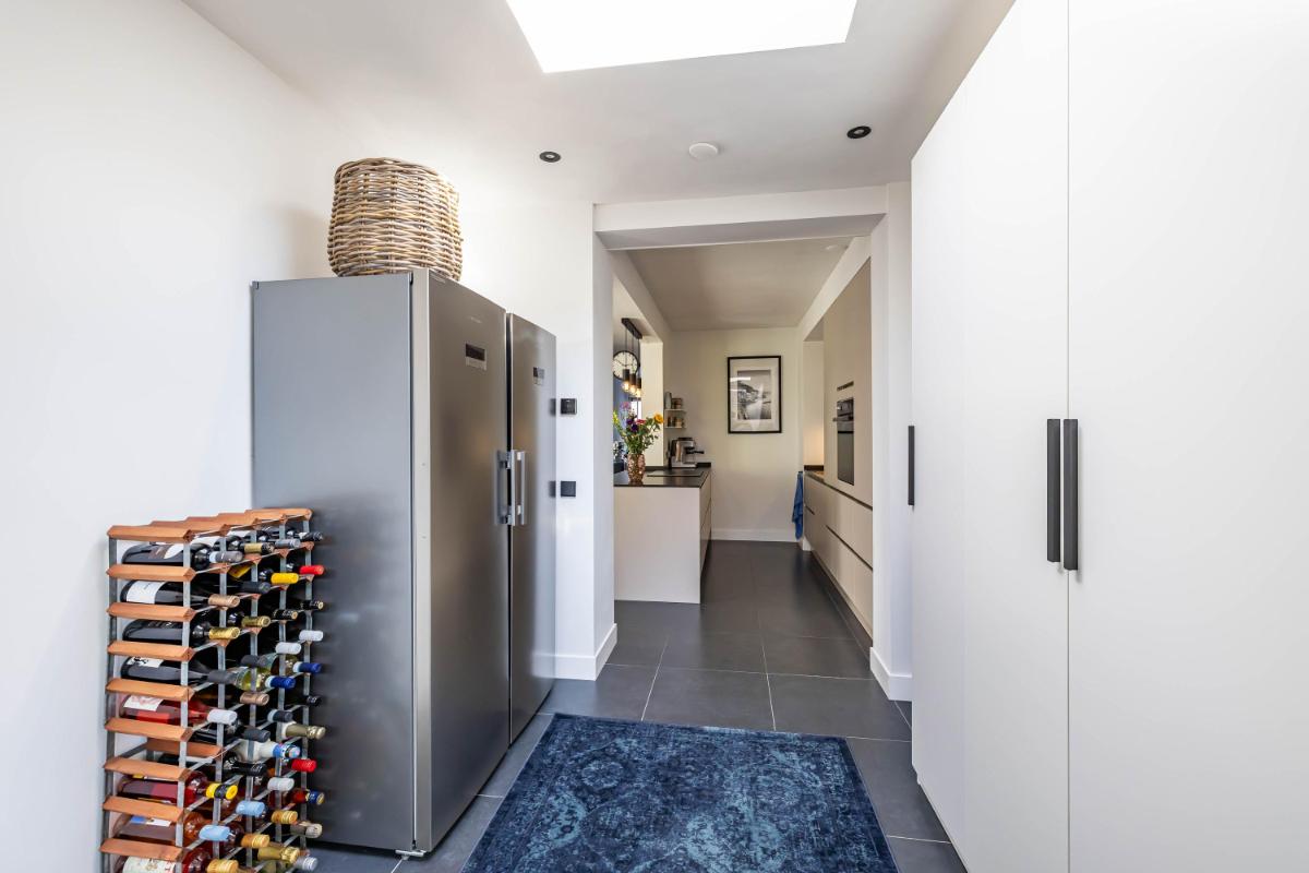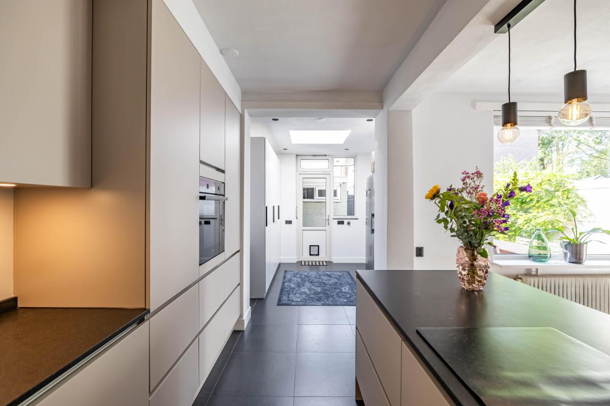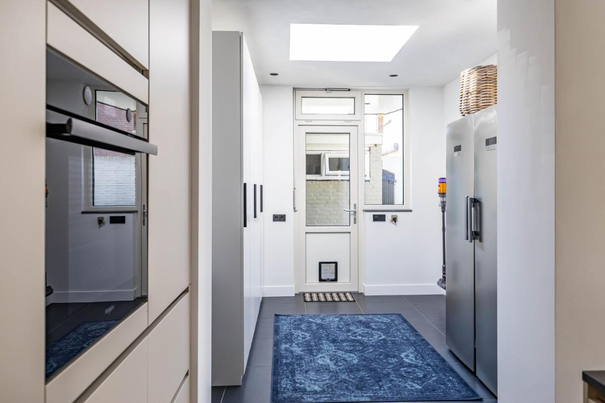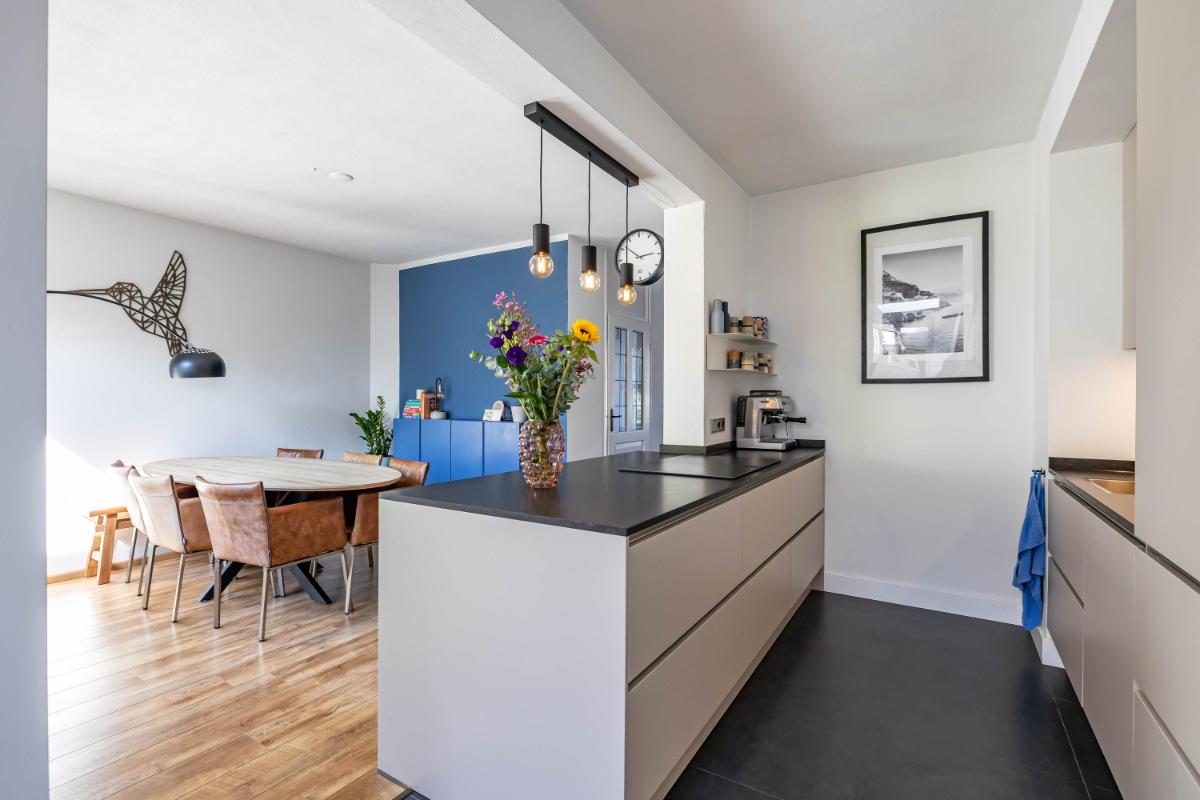 Indeling Begane grond Je parkeert je auto gemakkelijk voor de deur en betreedt de woning via de entree met trapopgang, toiletruimte en trapkast. De sfeervolle woonkamer biedt ruimte voor zowel een gezellige zithoek als een aparte eethoek. De moderne keuken is een echte eyecatcher. Onder andere voorzien van een BORA inductiekookplaat, Quooker en voldoende opbergmogelijkheden, is dit een heerlijke plek om thuis te komen. Aansluitend aan de keuken vind je de aanbouw met bijkeuken. Deze is voorzien van een dakraam en elektrische vloerverwarming voor extra comfort.
