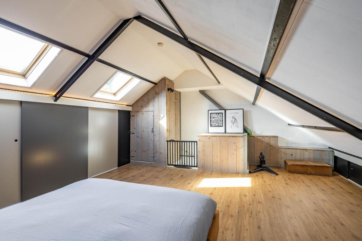 Tweede verdieping Je bereikt de 2e verdieping middels de vaste trapopgang. Deze grote ruimte is heerlijk licht dankzij de 2 dakramen, volledig afgewerkt en biedt mogelijkheden voor een extra slaapkamer, werk- of hobbyruimte. Tevens beschikt deze verdieping over veel extra opbergruimte.