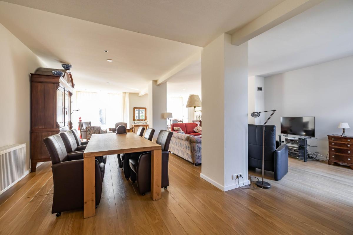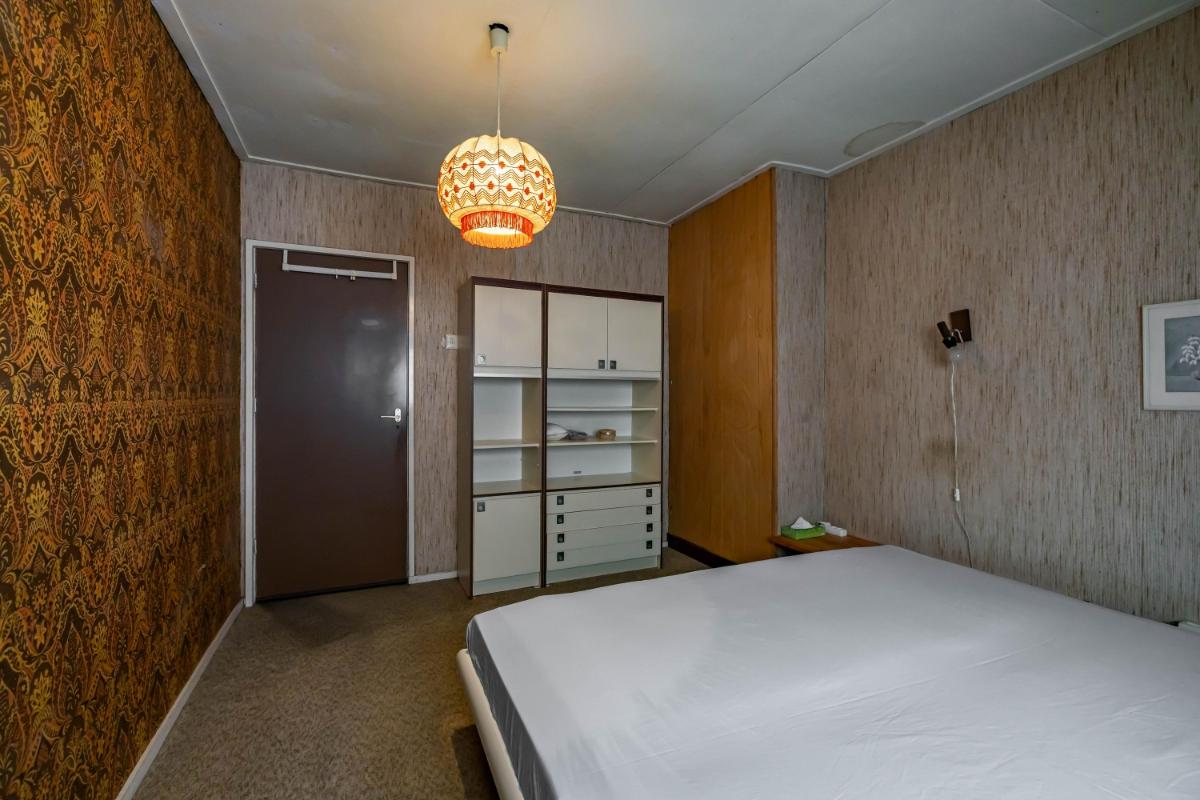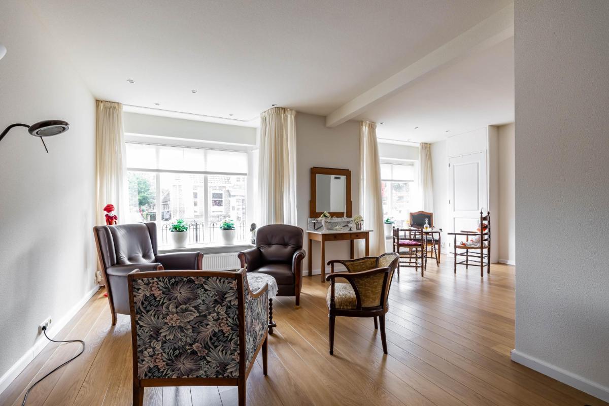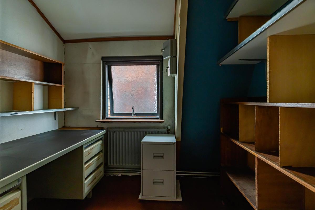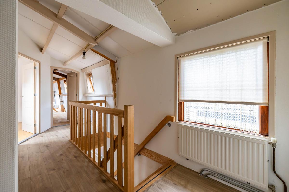 Eerste verdieping Een deel van de verdieping is al grondig gerenoveerd. Hier vindt u een moderne badkamer, een slaapkamer en een royale open ruimte die uitnodigt om als master bedroom of atelier in te richten. Aansluitend ligt een extra kamer die zich uitstekend leent voor een inloopkast of privébadkamer. Het overige deel van de verdieping is nog vrij in te delen en geeft u de mogelijkheid om uw woonwensen waar te maken. Meerdere slaapkamers, een werkkamer of een extra badkamer? Alles is mogelijk. De vroegere woonkamer op deze verdieping heeft authentieke details, zoals een vitrine met glas-in-loodramen en een erkerraam, die voor extra sfeer zorgen.