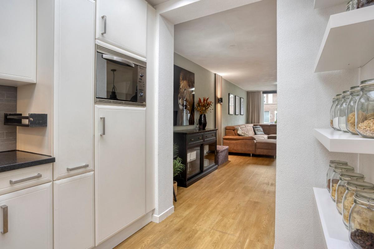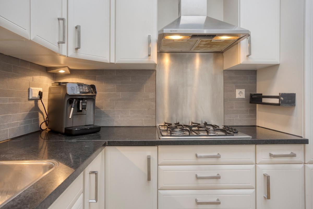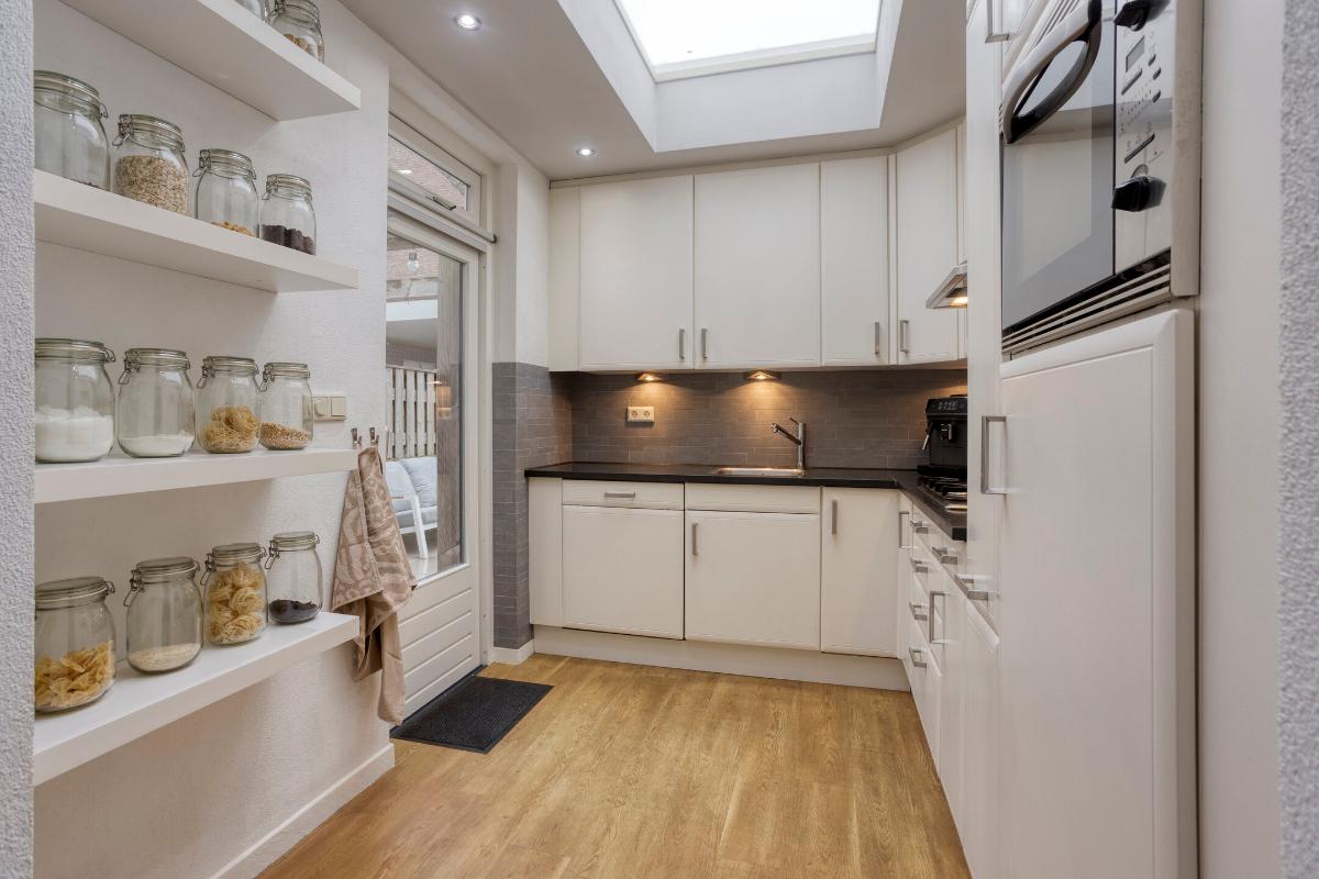 KEUKEN De keuken is geplaatst in de uitbouw. De keuken, in hoekopstelling, is voorzien van inbouwapparatuur, te weten een combi-oven/magnetron, vierpits gaskookplaat, afzuigkap, vaatwasser, koelkast en vriezer. Vanuit de keuken geeft een loopdeur eveneens toegang tot de tuin. Dankzij de lichtkoepel is er extra daglichttoetreding.