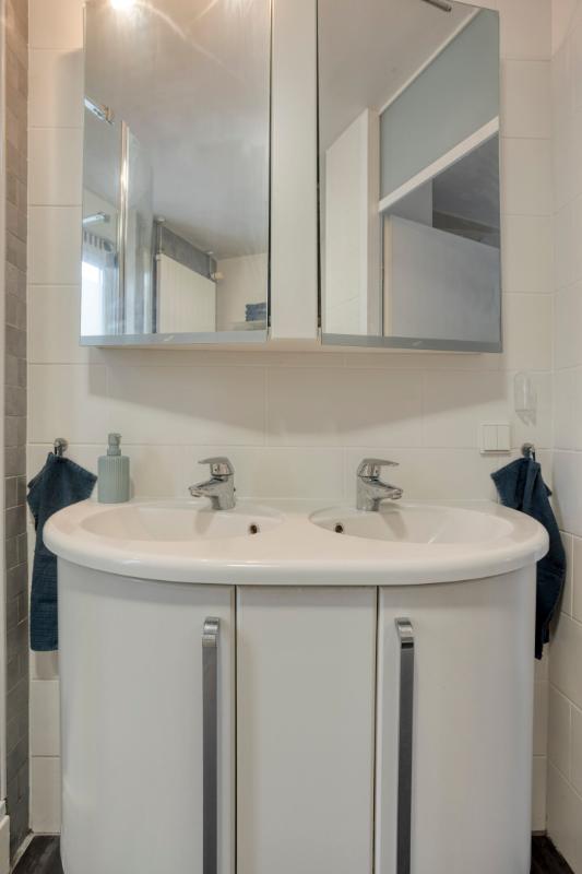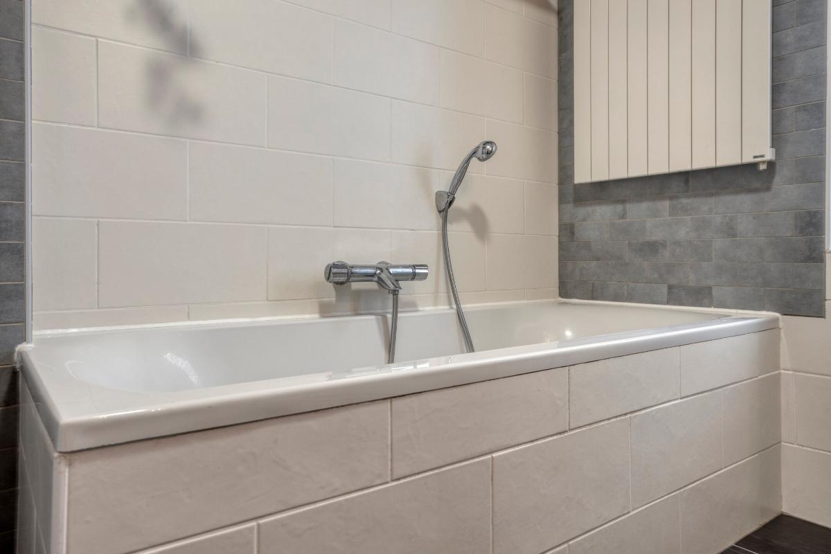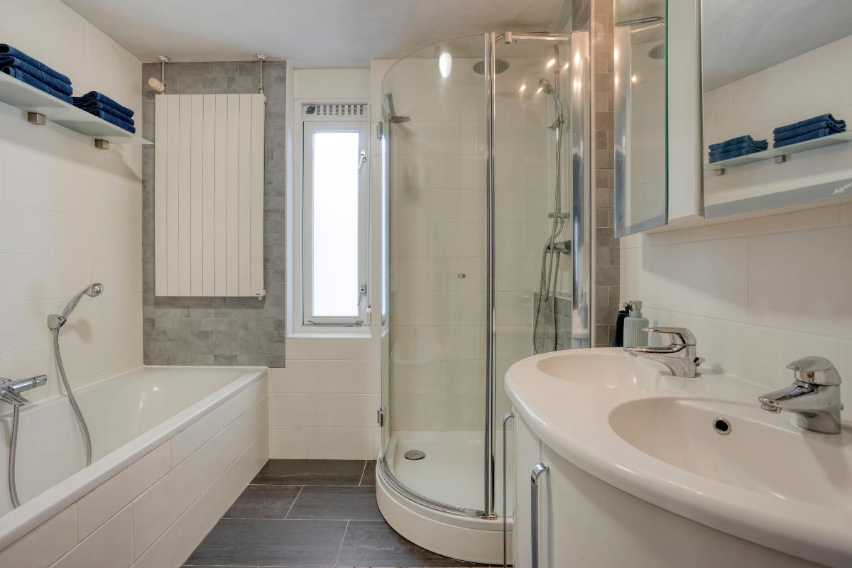 BADKAMER De ruime badkamer is ingedeeld met een ligbad, douchehoek, wandcloset en een dubbele wastafel in meubel. Tevens is er een designradiator aanwezig.