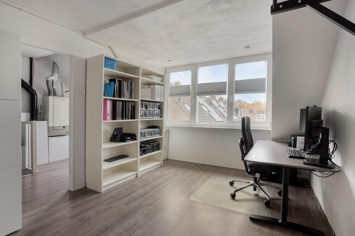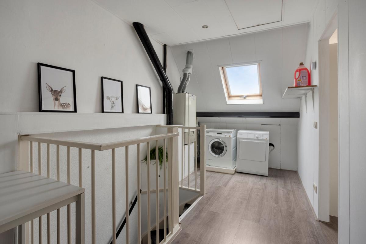 TWEEDE VERDIEPING Bereikbaar middels vaste trap. Deze zolderverdieping bestaat uit een ruime voorzolder en een vierde slaapkamer. De voorzolder beschikt over de opstelplaats van de cv-ketel, aansluitingen voor was- en droogvoorzieningen en een vlizotrap naar de bergzolder/vliering. De vierde slaapkamer is voorzien van een dakkapel. Daarnaast is er extra bergruimte onder de schuine dakdelen aanwezig. De verdieping is afgewerkt met een laminaatvloer, sierpleister wanden en gestucte plafonds.