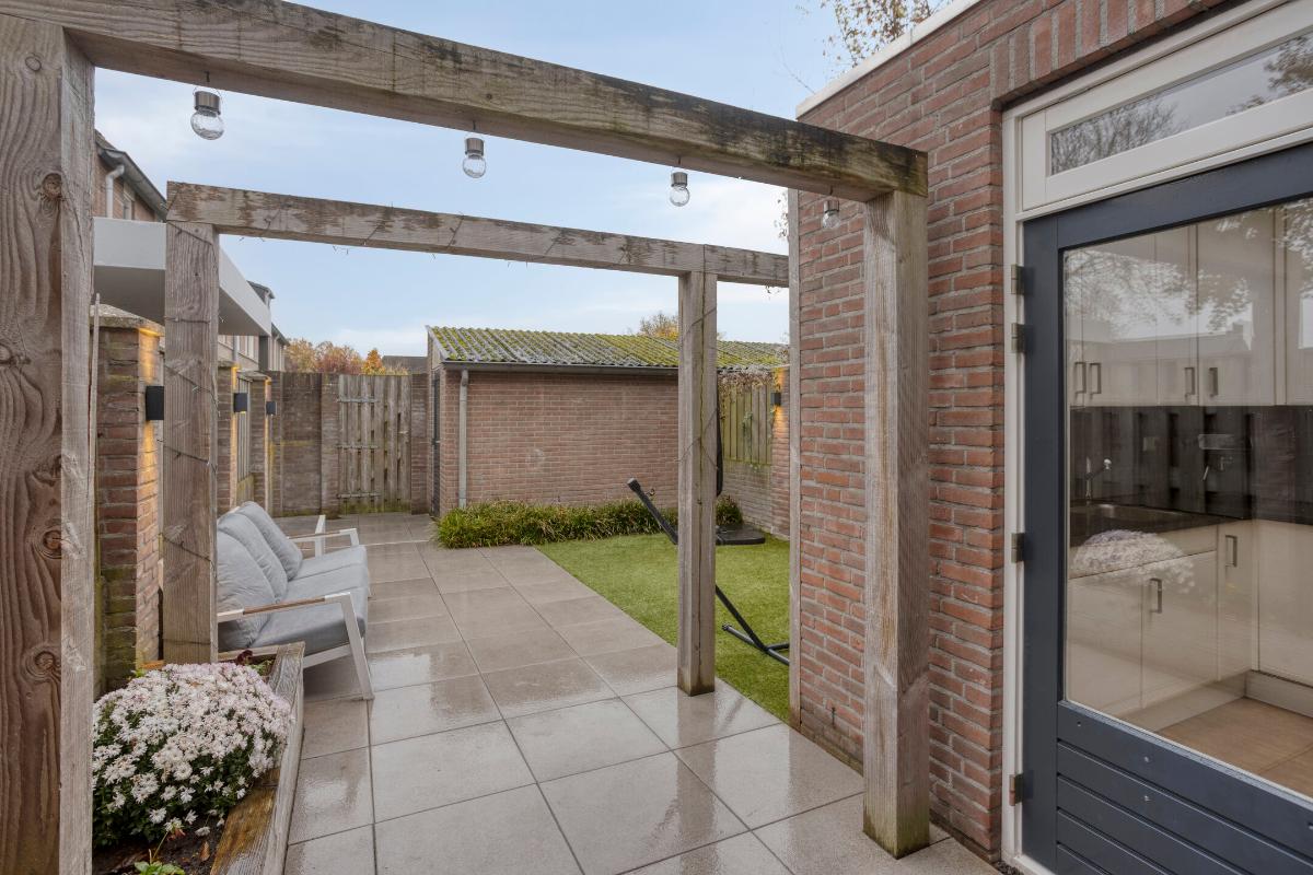 BUITENRUIMTE Onderhoudsarme voortuin bestaande uit een border met beplanting en sierbestrating. De achtertuin is gelegen op het zuidoosten en biedt volop privacy. De tuin bestaat uit sierbestrating, een zonneterras, kunstgazon en borders met beplanting. Tevens is er een vrijstaande stenen berging aanwezig en is er een eigen achterom.
