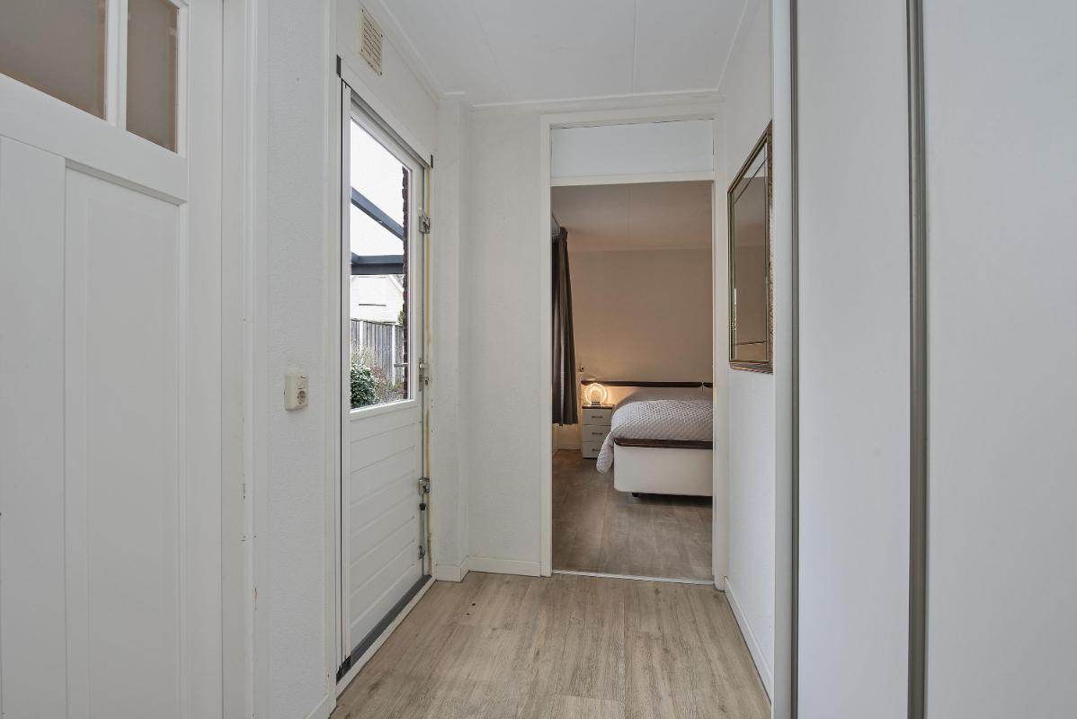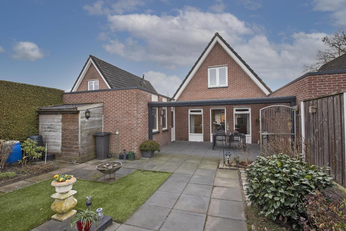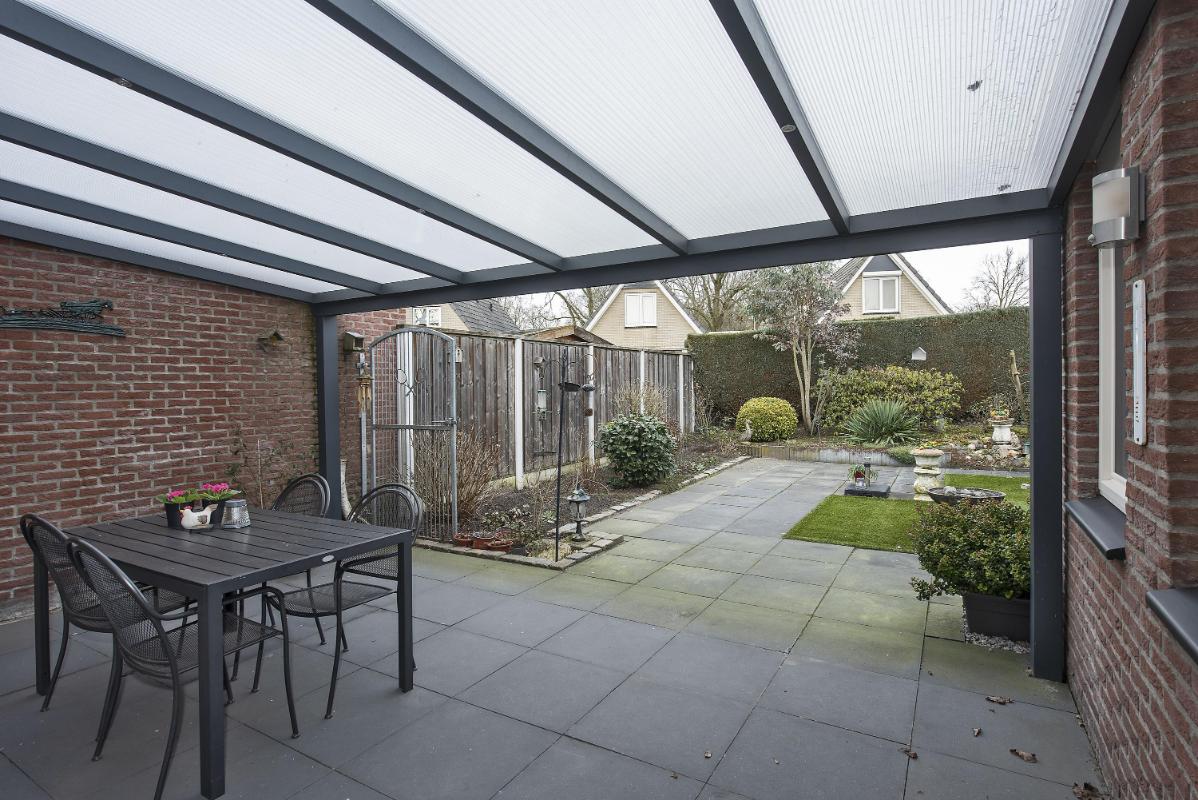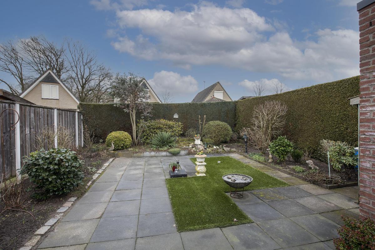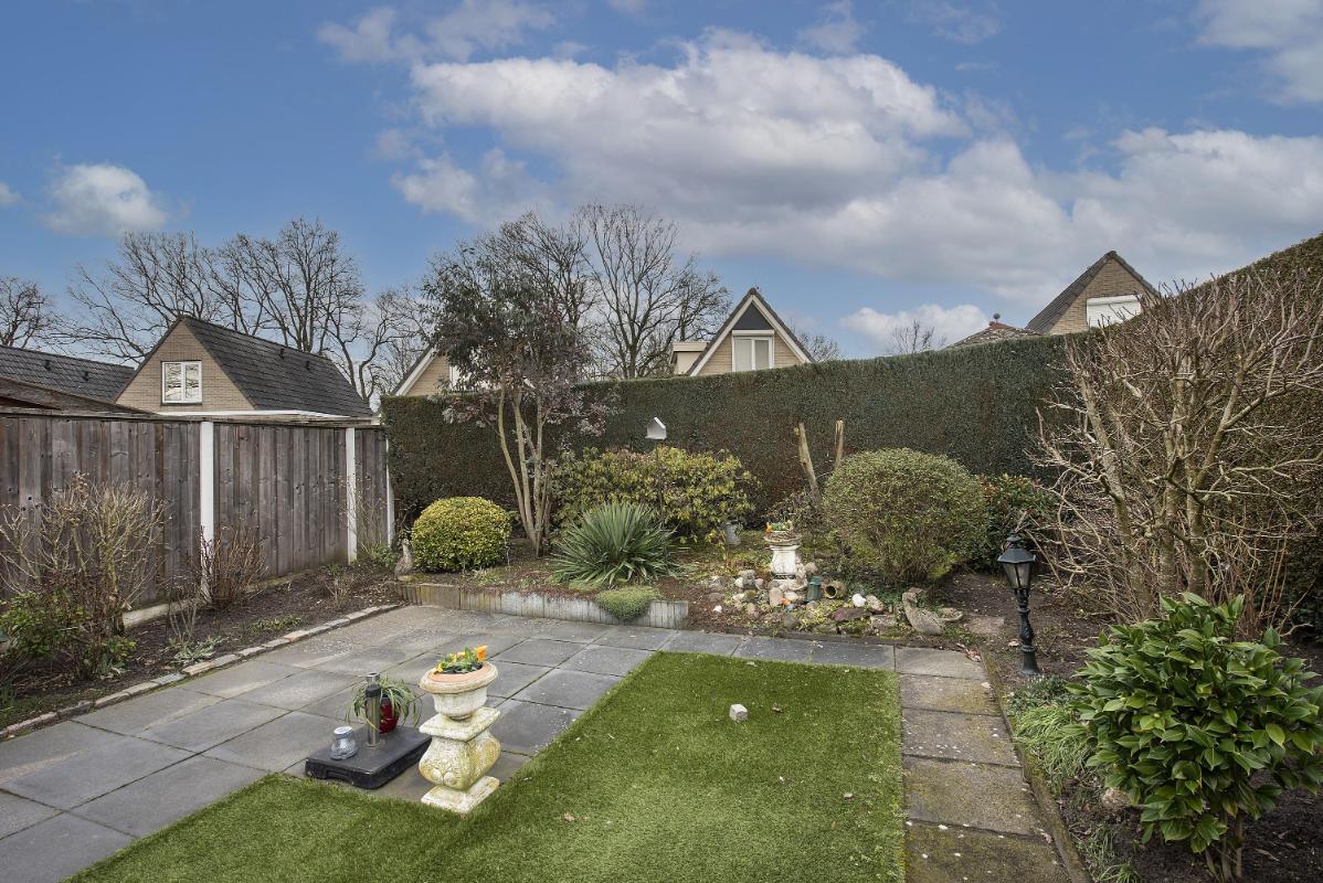 Tuin: Vanuit het achter portaal bereik je de achtertuin, waar direct de ruime veranda opvalt. Deze overkapping biedt een beschutte plek om vroeg in het voorjaar en tot laat in het najaar buiten te zitten, met genoeg ruimte voor een eettafel of een loungeset. De tuin zelf is sfeervol en praktisch aangelegd met bestrating, een groen gazon accent en gevarieerde beplanting langs de randen. De hoge erfafscheiding, bestaande uit een schutting en een dichte haag zorgt voor veel privacy, zodat je hier in alle rust buiten kunt genieten.
