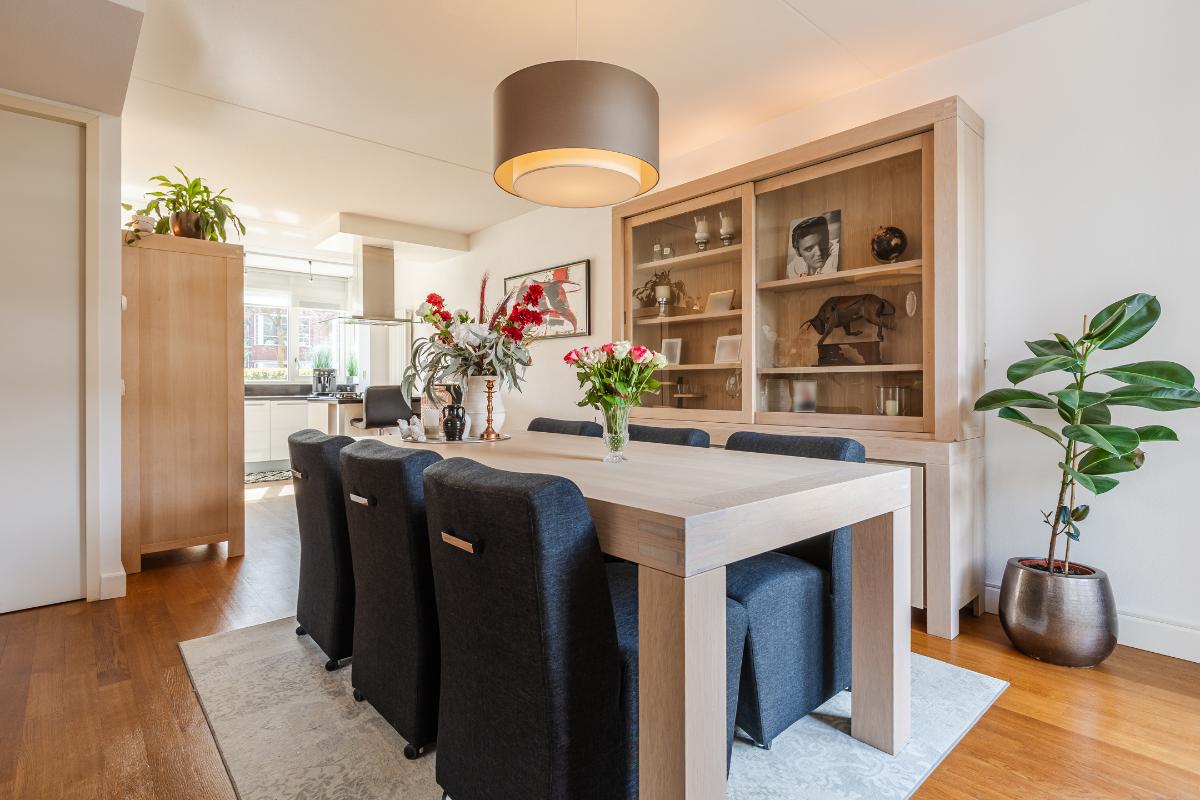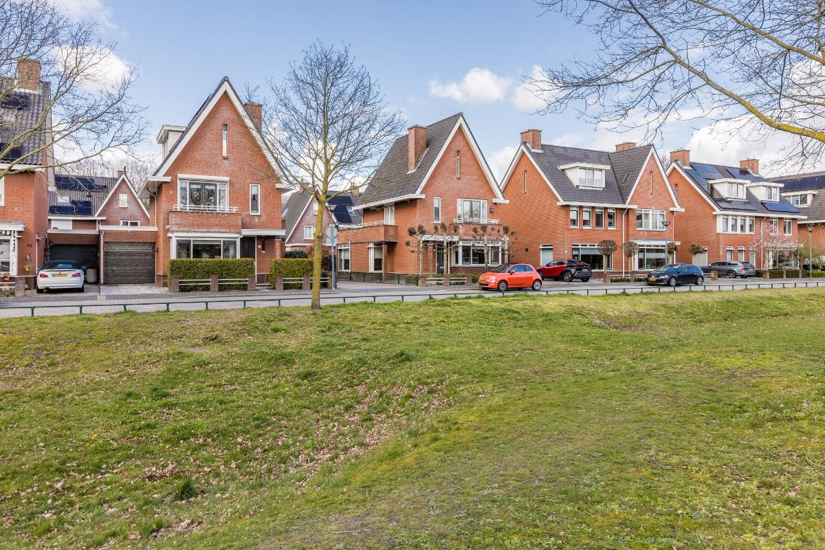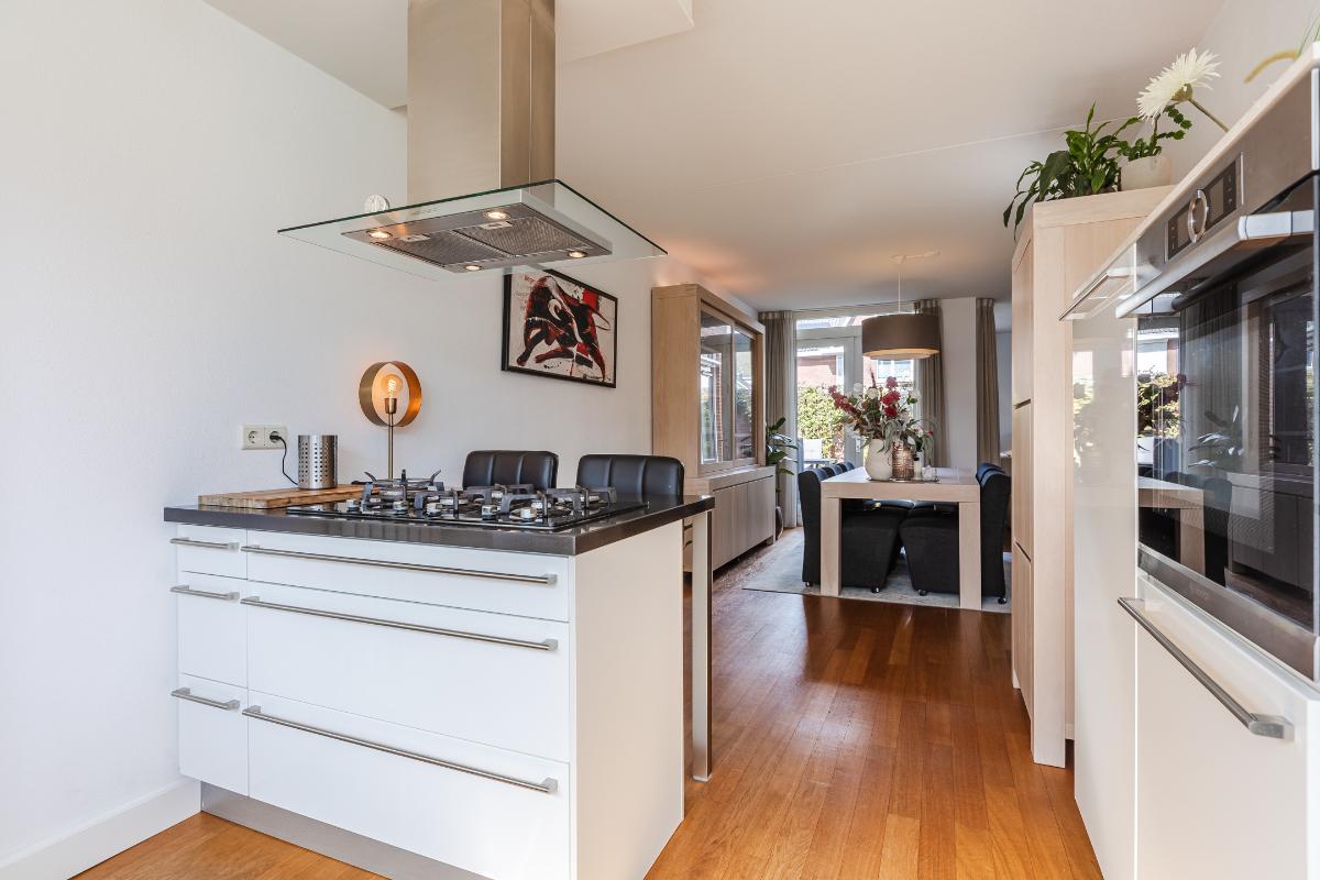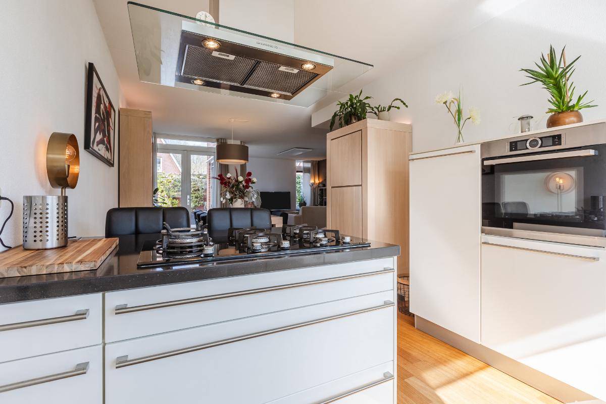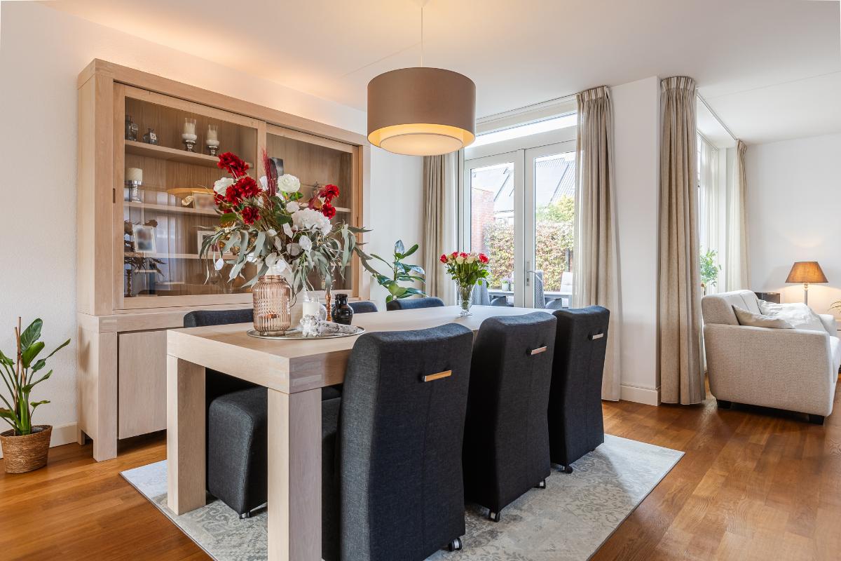 Overdekte entree met volledig betegeld toiletruimte met hang closet en fonteintje, meterkast, trapopgang naar de eerste verdieping en deur naar de woonkamer. De vloer op de begane grond is uitgerust met een houten parketvloer. De wanden zijn voorzien van spachtelputz. Woonkamer met voldoende ruimte voor een gezellige zithoek en openslaande deuren naar de patiotuin. De open keuken is aan de voorzijde gelegen in een erker met een groot raam waardoor men een mooi uitzicht over de brede laan en de bossen in de verte heeft. De keuken is uitgerust met een recht keukenblok met onderkastjes in een lichte kleurstelling, een kookeiland, een natuurstenen/composiet aanrechtblad en voorzien van een vaatwasser (2026), 5 pits gaskookplaat, vrij hangende afzuigkap, combi magnetron en een koelkast.