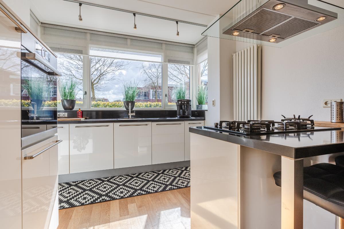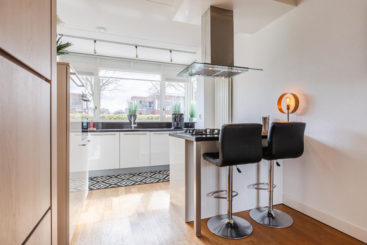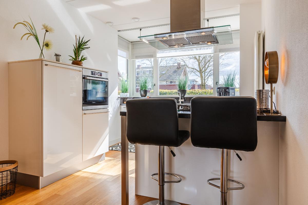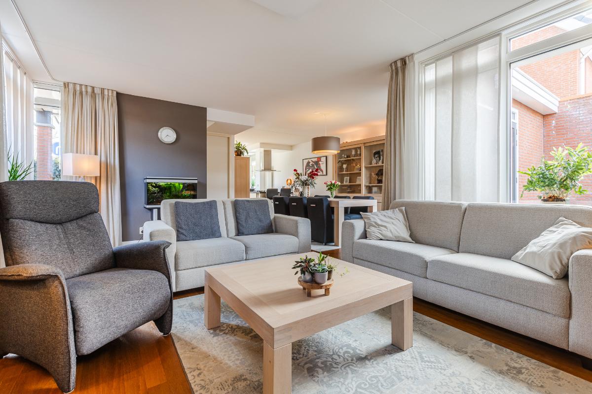 Overdekte entree met volledig betegeld toiletruimte met hang closet en fonteintje, meterkast, trapopgang naar de eerste verdieping en deur naar de woonkamer. De vloer op de begane grond is uitgerust met een houten parketvloer. De wanden zijn voorzien van spachtelputz. Woonkamer met voldoende ruimte voor een gezellige zithoek en openslaande deuren naar de patiotuin. De open keuken is aan de voorzijde gelegen in een erker met een groot raam waardoor men een mooi uitzicht over de brede laan en de bossen in de verte heeft. De keuken is uitgerust met een recht keukenblok met onderkastjes in een lichte kleurstelling, een kookeiland, een natuurstenen/composiet aanrechtblad en voorzien van een vaatwasser (2026), 5 pits gaskookplaat, vrij hangende afzuigkap, combi magnetron en een koelkast.