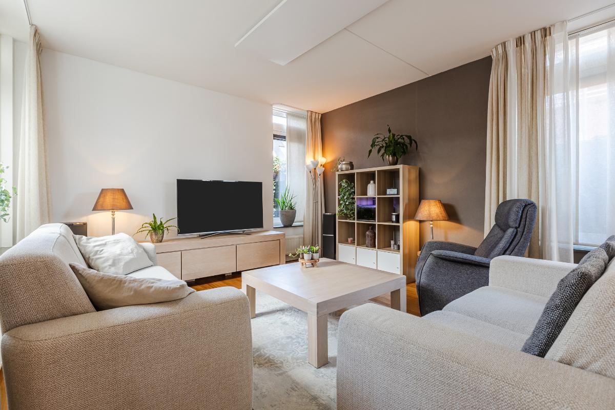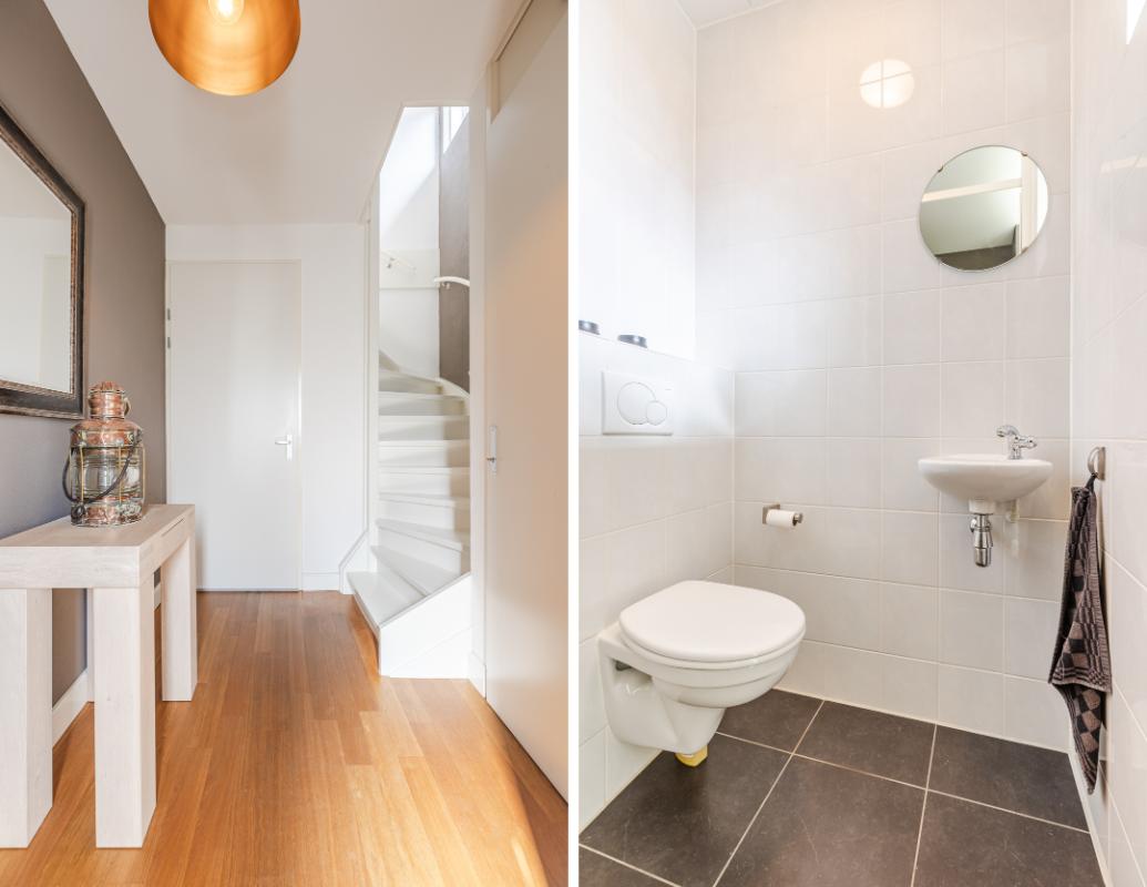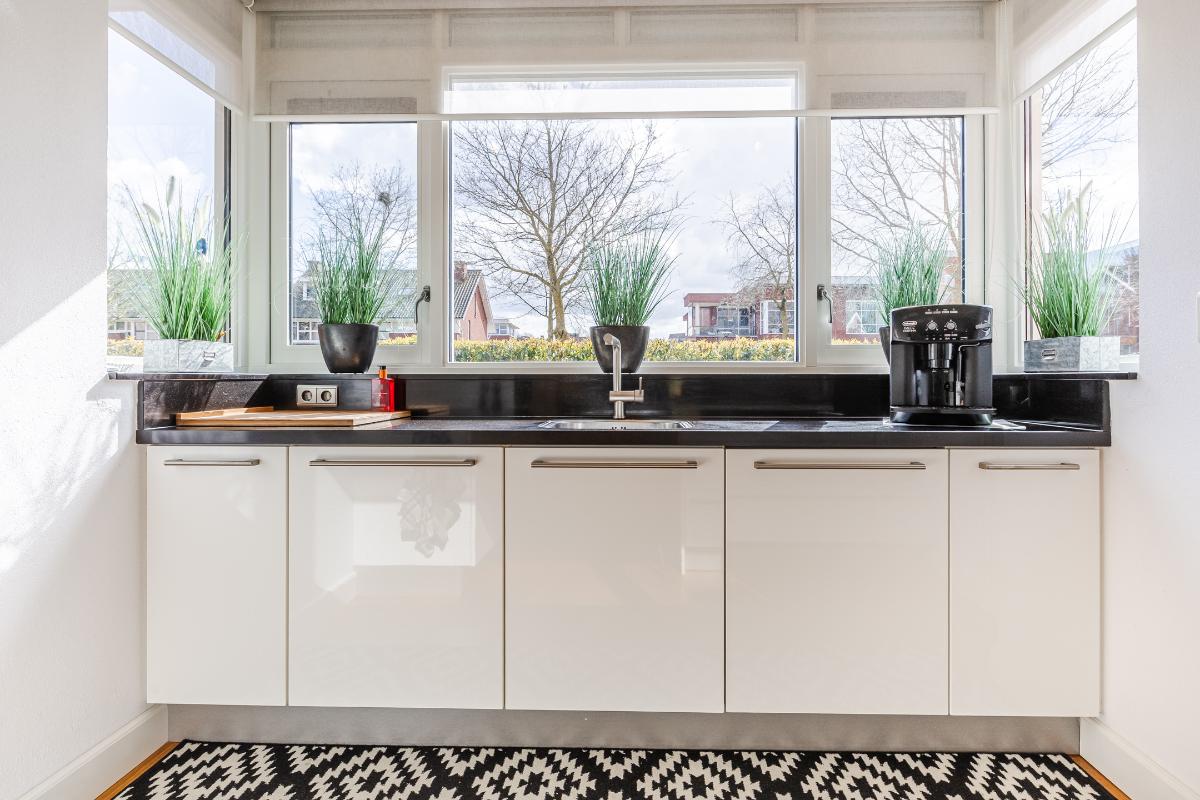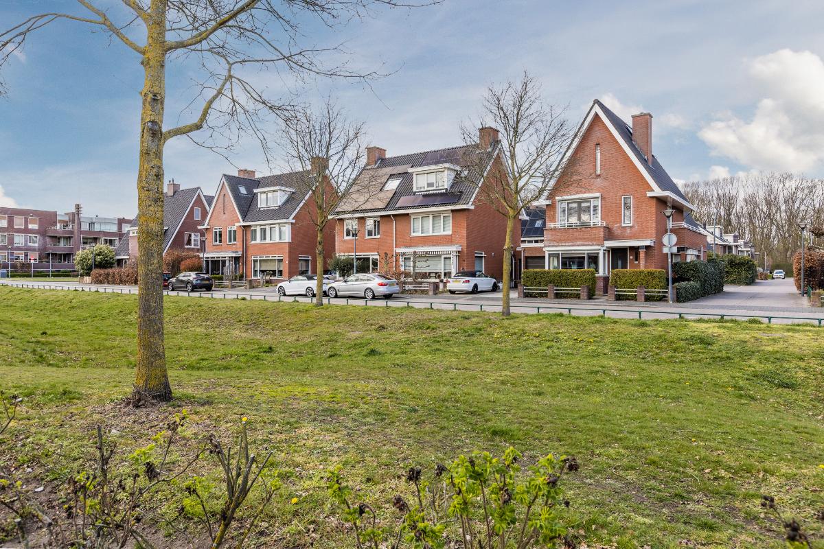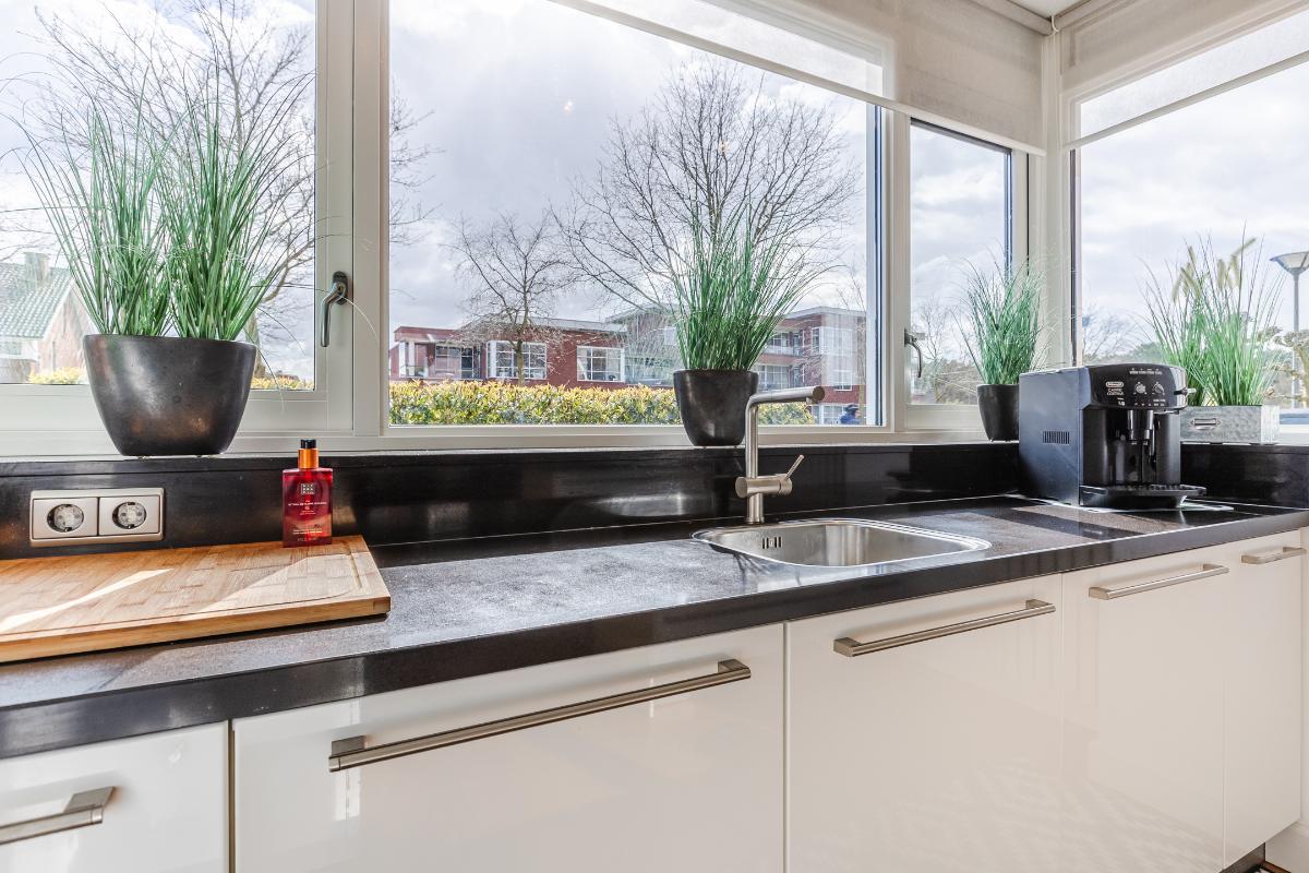 Overdekte entree met volledig betegeld toiletruimte met hang closet en fonteintje, meterkast, trapopgang naar de eerste verdieping en deur naar de woonkamer. De vloer op de begane grond is uitgerust met een houten parketvloer. De wanden zijn voorzien van spachtelputz. Woonkamer met voldoende ruimte voor een gezellige zithoek en openslaande deuren naar de patiotuin. De open keuken is aan de voorzijde gelegen in een erker met een groot raam waardoor men een mooi uitzicht over de brede laan en de bossen in de verte heeft. De keuken is uitgerust met een recht keukenblok met onderkastjes in een lichte kleurstelling, een kookeiland, een natuurstenen/composiet aanrechtblad en voorzien van een vaatwasser (2026), 5 pits gaskookplaat, vrij hangende afzuigkap, combi magnetron en een koelkast.
