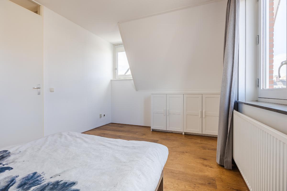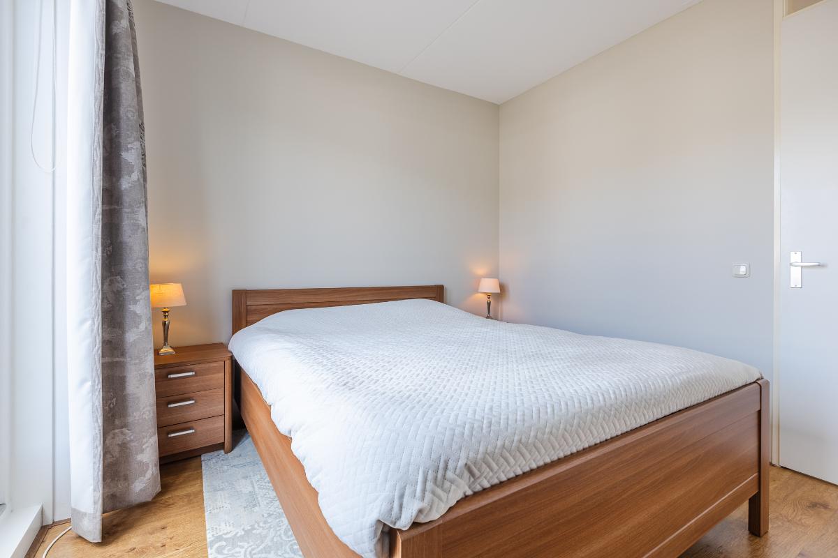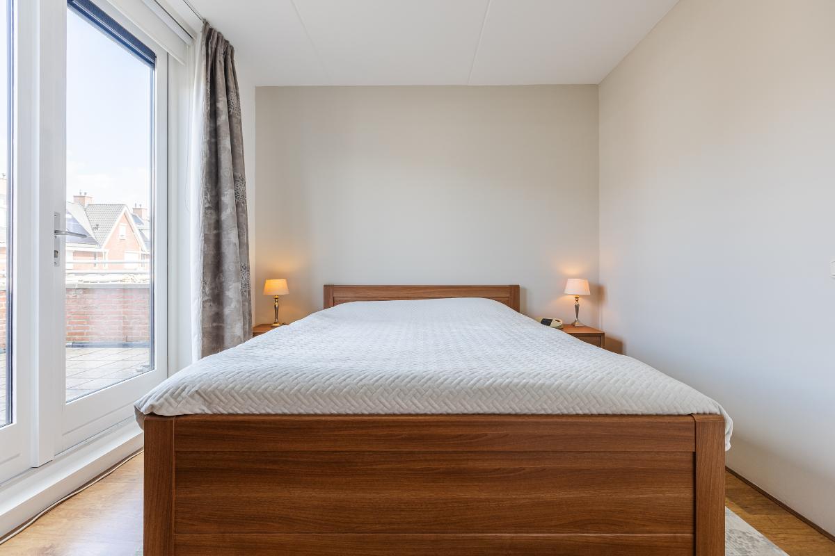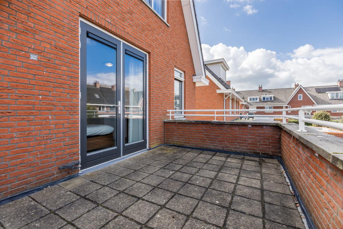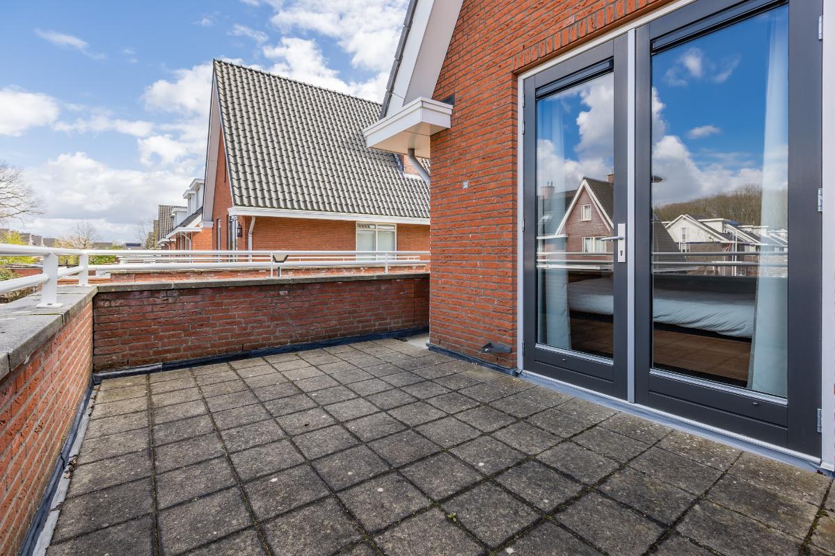 Overloop met trapopgang naar de tweede verdieping, toegang tot 2 slaapkamers en de badkamer. Slaapkamer voor met openslaande deuren naar het balkon en een rolluik. De master biedt toegang tot het ruime dakterras. De badkamer is geheel betegeld en uitgerust met een ligbad, aparte douchecabine, toilet en een wastafel. De slaapkamers en overloop zijn voorzien van een laminaat vloer, de wanden zijn voorzien van spachtelputz.