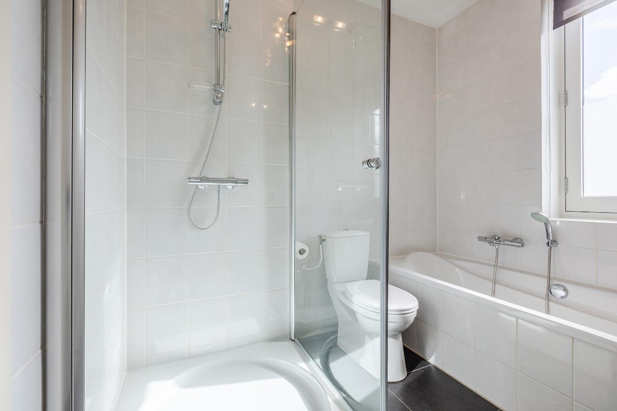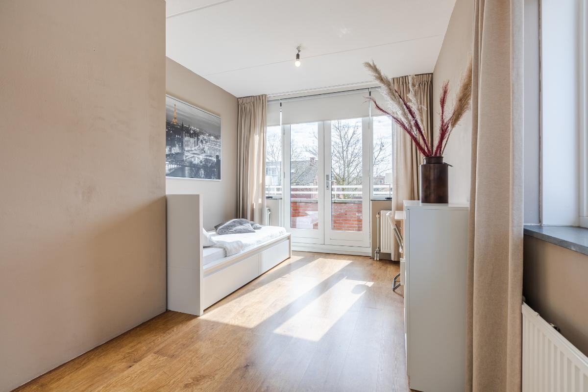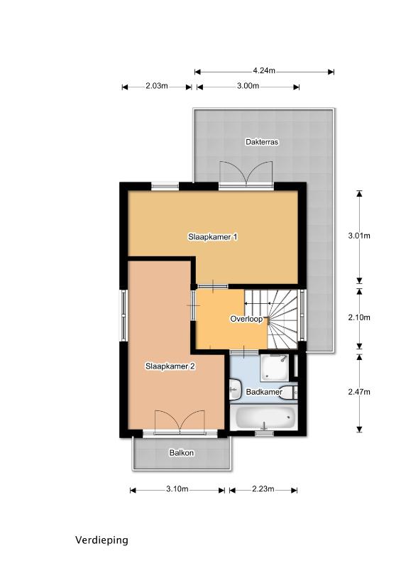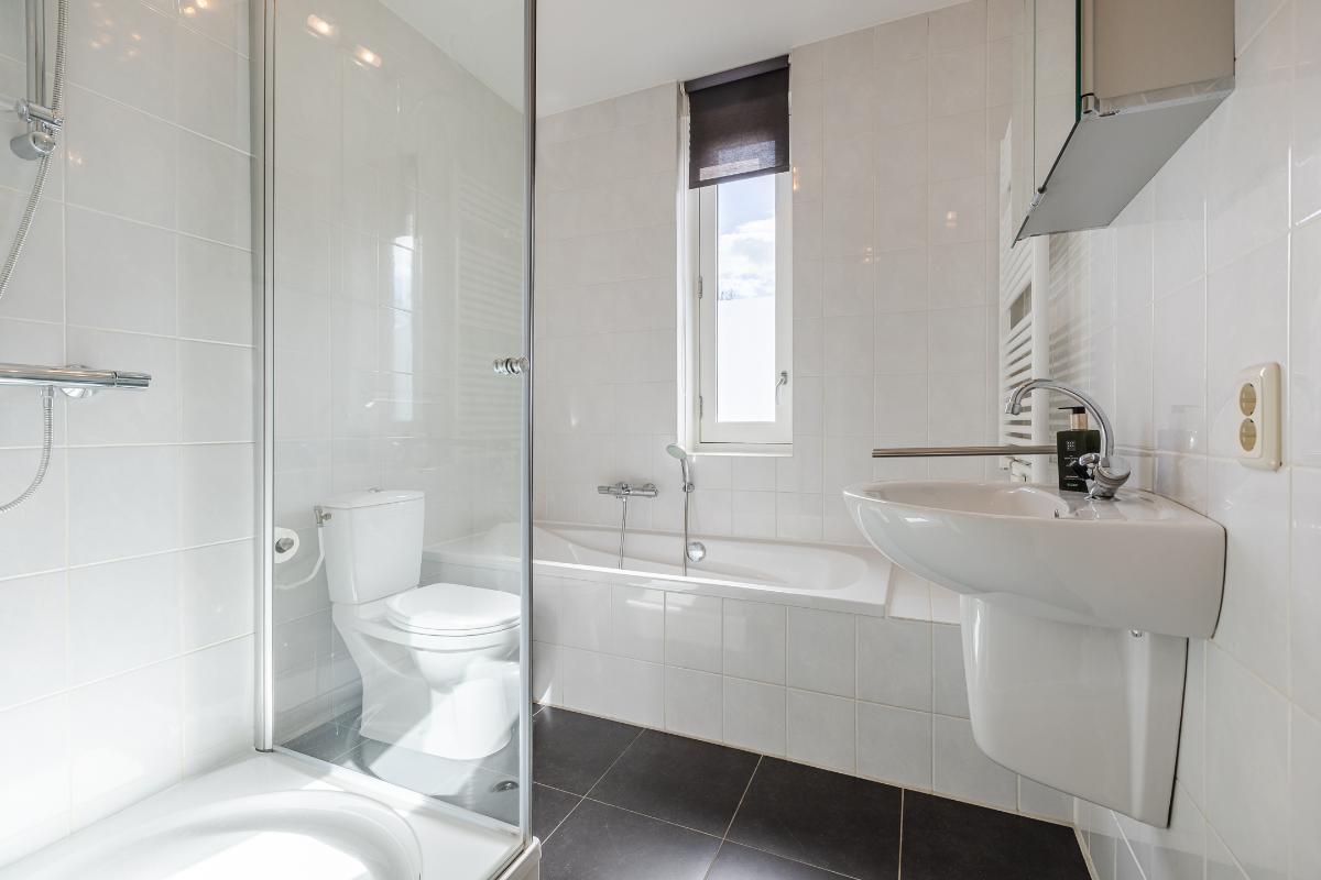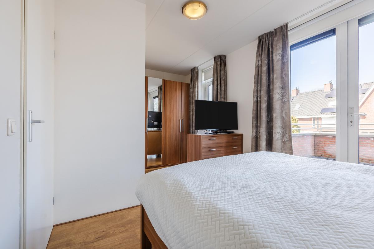 Overloop met trapopgang naar de tweede verdieping, toegang tot 2 slaapkamers en de badkamer. Slaapkamer voor met openslaande deuren naar het balkon en een rolluik. De master biedt toegang tot het ruime dakterras. De badkamer is geheel betegeld en uitgerust met een ligbad, aparte douchecabine, toilet en een wastafel. De slaapkamers en overloop zijn voorzien van een laminaat vloer, de wanden zijn voorzien van spachtelputz.