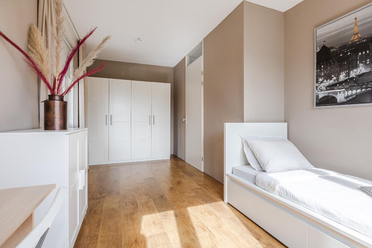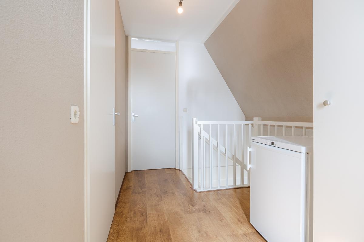 Deze is via een vaste trap bereikbaar en bestaat uit een overloop met aansluiting t.b.v. de wasapparatuur en de cv-combi, vlizotrap naar de bergzolder en toegang tot de slaapkamers. Beide slaapkamers beschikken over een gedeeld dakkapel. De vloer is uitgerust met een laminaatvloer, de wanden zijn voorzien van stucwerk.