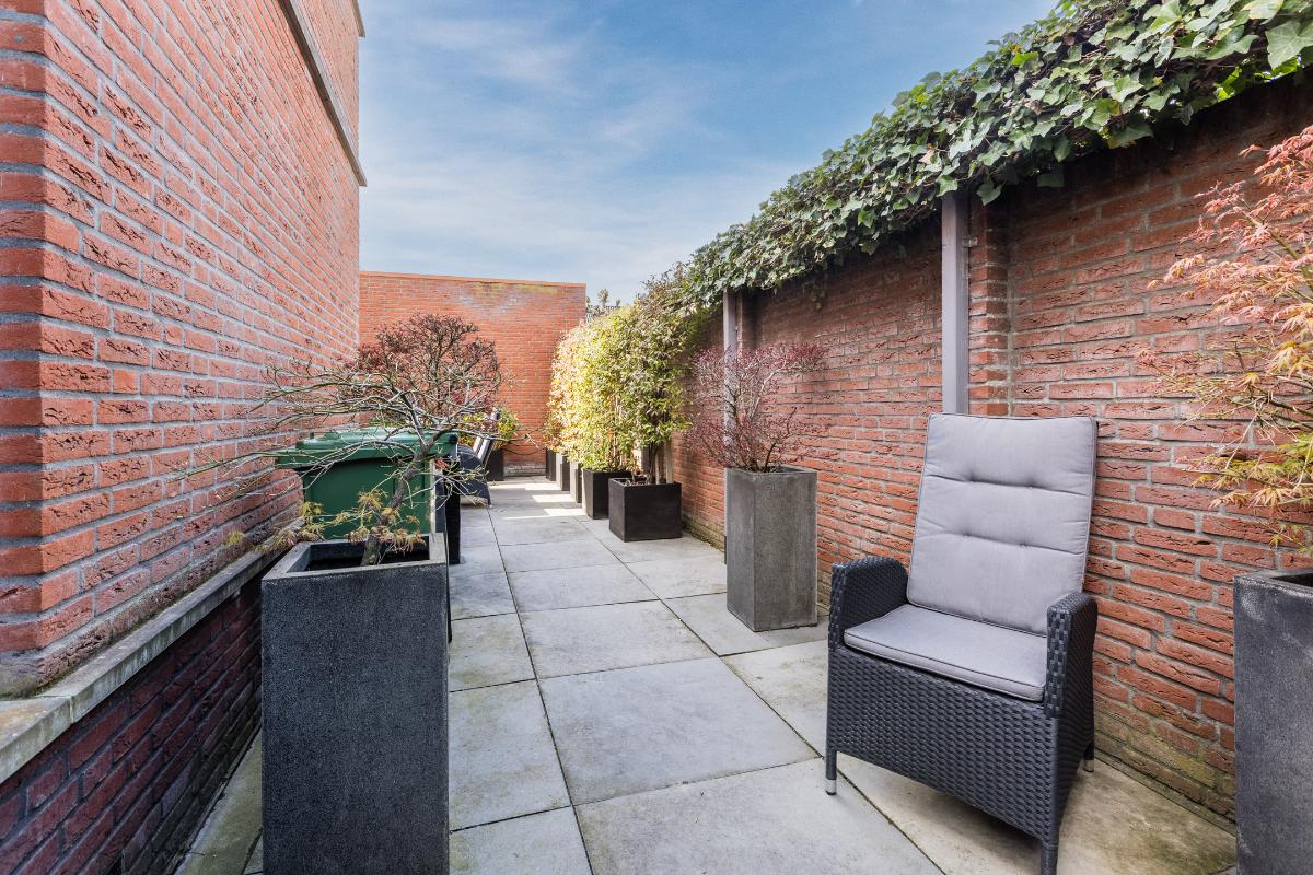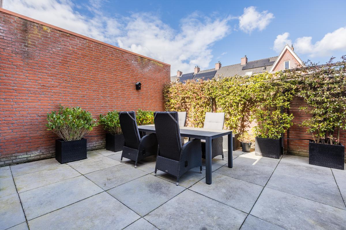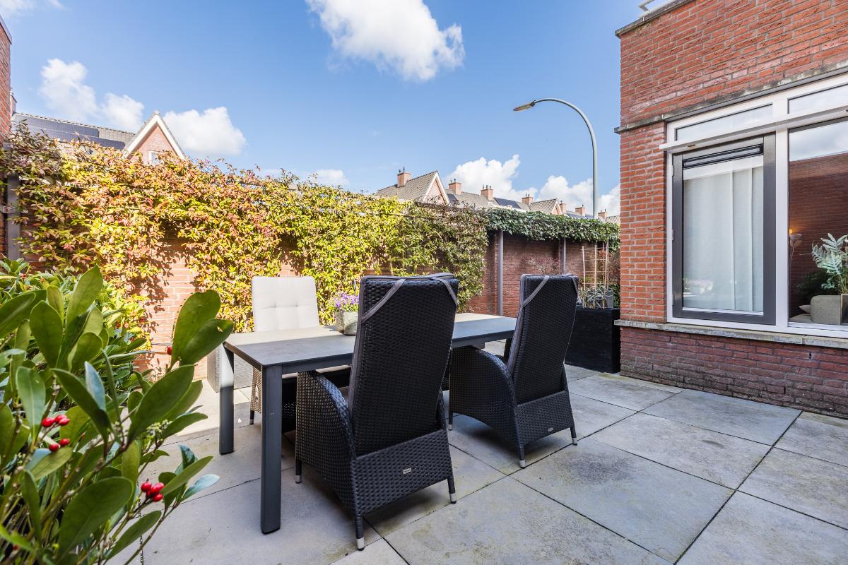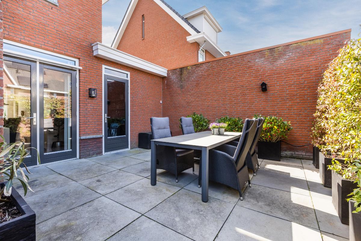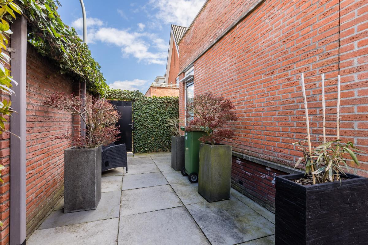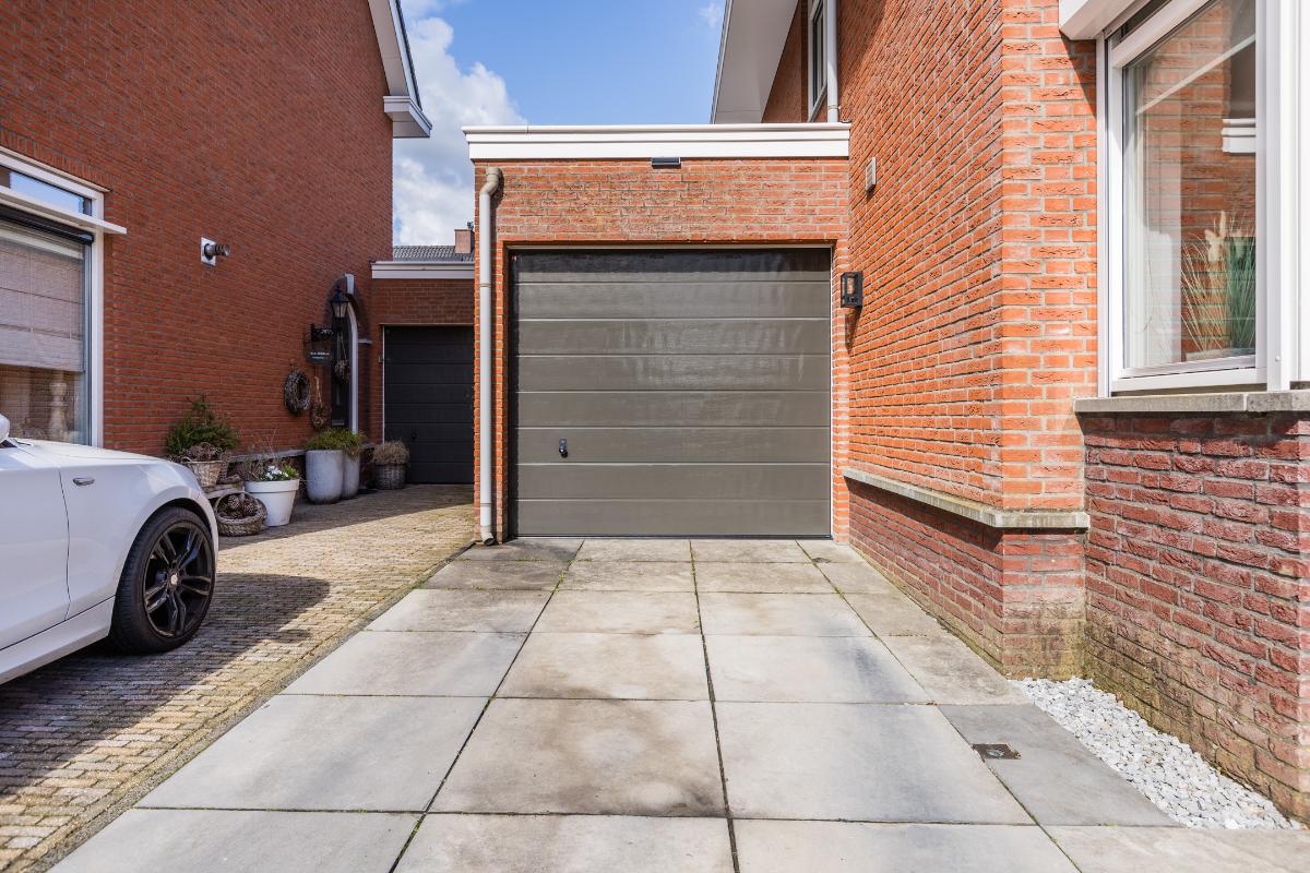 De garage is voorzien van een tegelvloer, elektrische sectionaal deur en loopdeur naar de patio. De patiotuin is geheel ommuurd, uitgerust met natuurstenen terrastegels. Poort met achterom. Buitenkraan voor en achter.