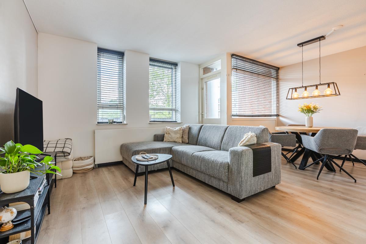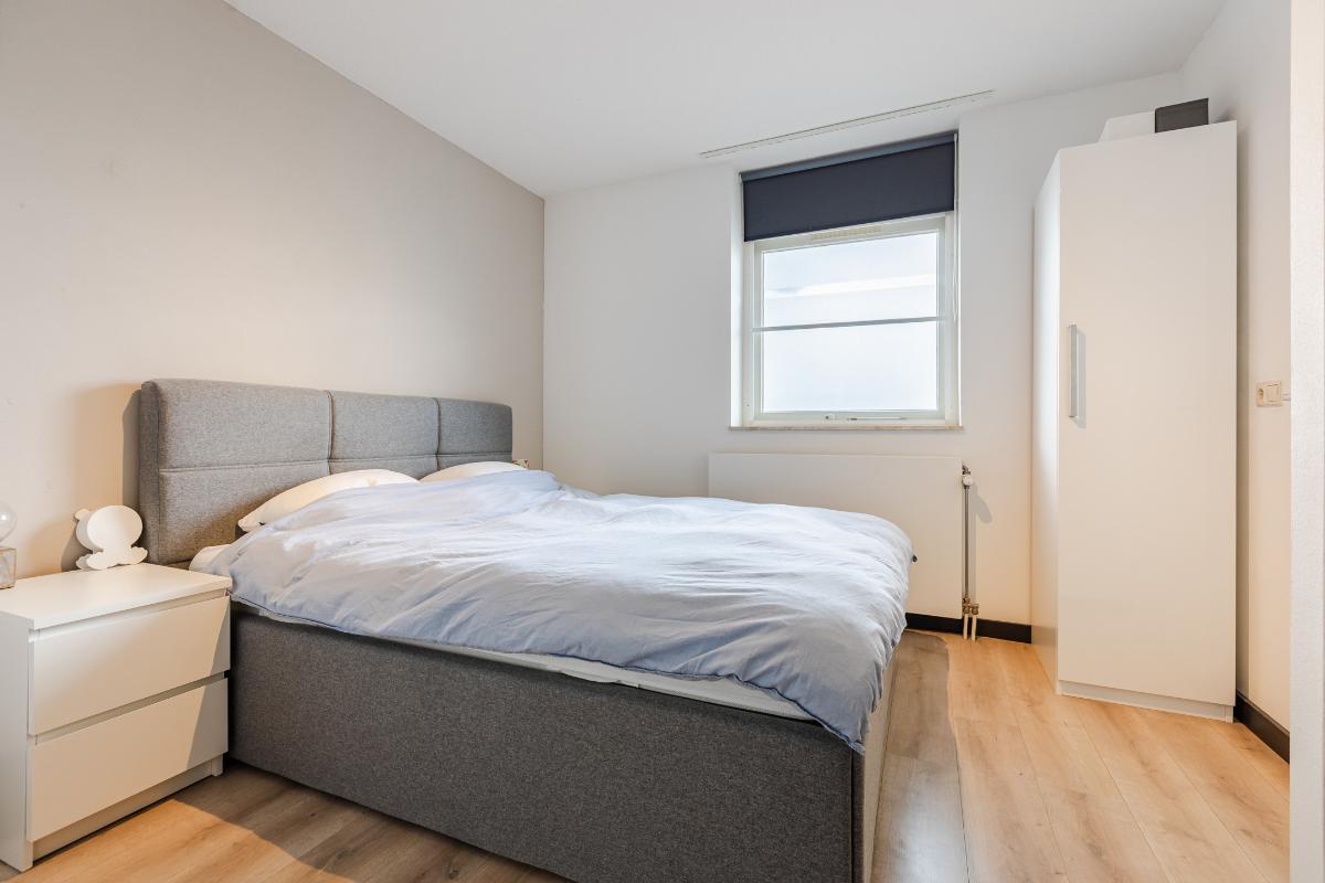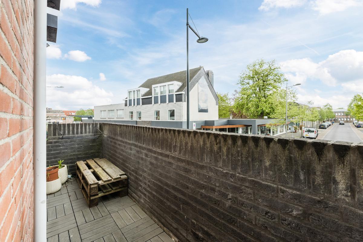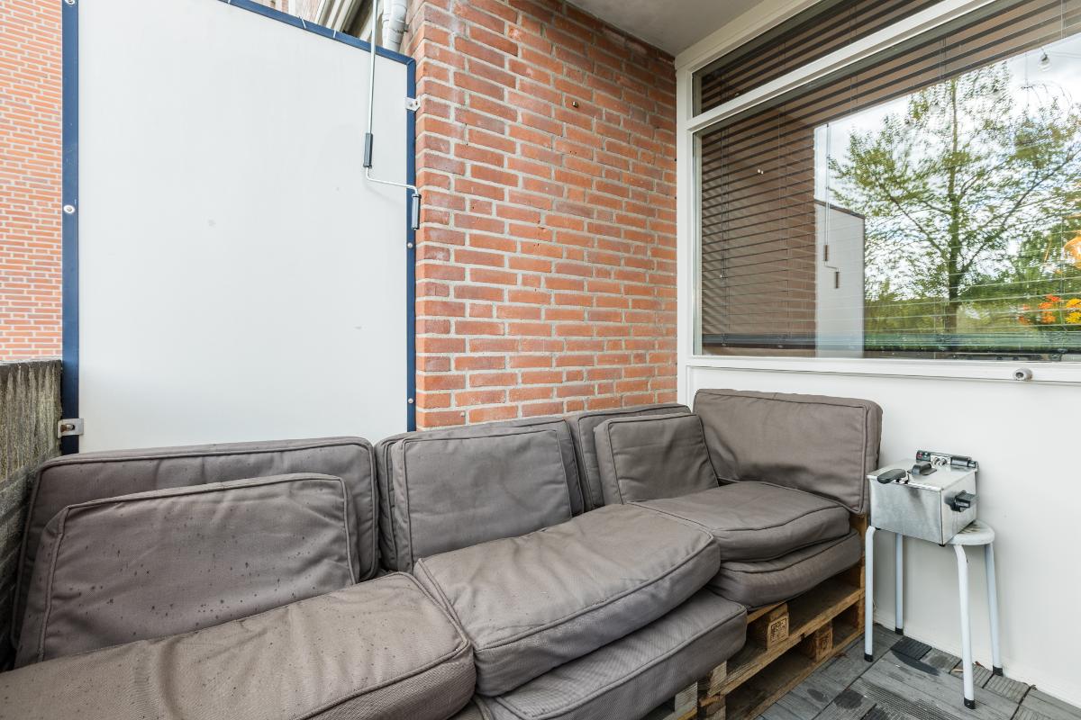 1e Verdieping: Overloop met meterkast, voorraadkast, cv-ruimte met wasmachineaansluiting en toilet met fonteintje; woonkamer met toegang tot het balkon; open keuken (ca. 2006) welke is voorzien van diverse onder- en bovenkastjes en diverse inbouwapparatuur zoals een afzuigkap, kookplaat, vaatwasser en koelkast. Slaapkamer aan de achterzijde. Badkamer met wastafel en douchecabine (ca. 2006). Balkon gelegen op het zuiden.