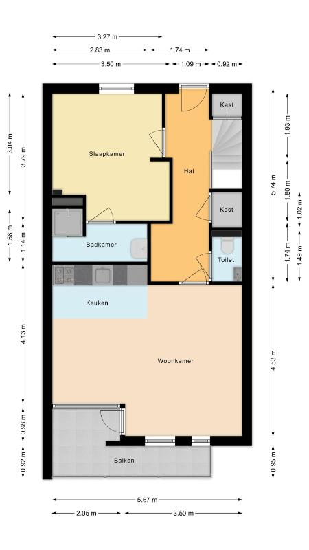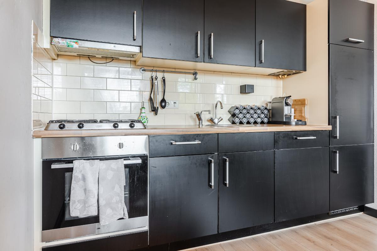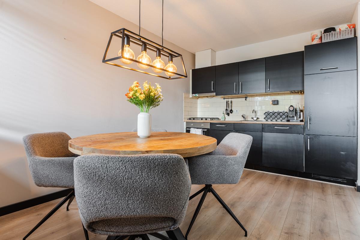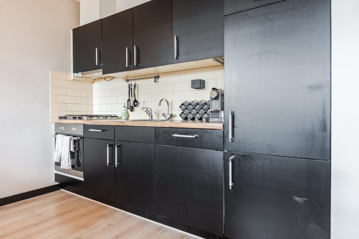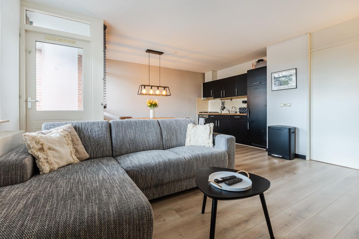 1e Verdieping: Overloop met meterkast, voorraadkast, cv-ruimte met wasmachineaansluiting en toilet met fonteintje; woonkamer met toegang tot het balkon; open keuken (ca. 2006) welke is voorzien van diverse onder- en bovenkastjes en diverse inbouwapparatuur zoals een afzuigkap, kookplaat, vaatwasser en koelkast. Slaapkamer aan de achterzijde. Badkamer met wastafel en douchecabine (ca. 2006). Balkon gelegen op het zuiden.