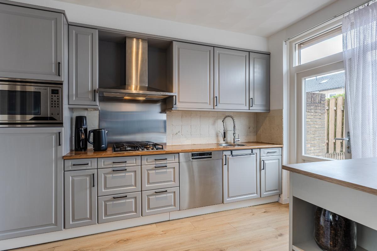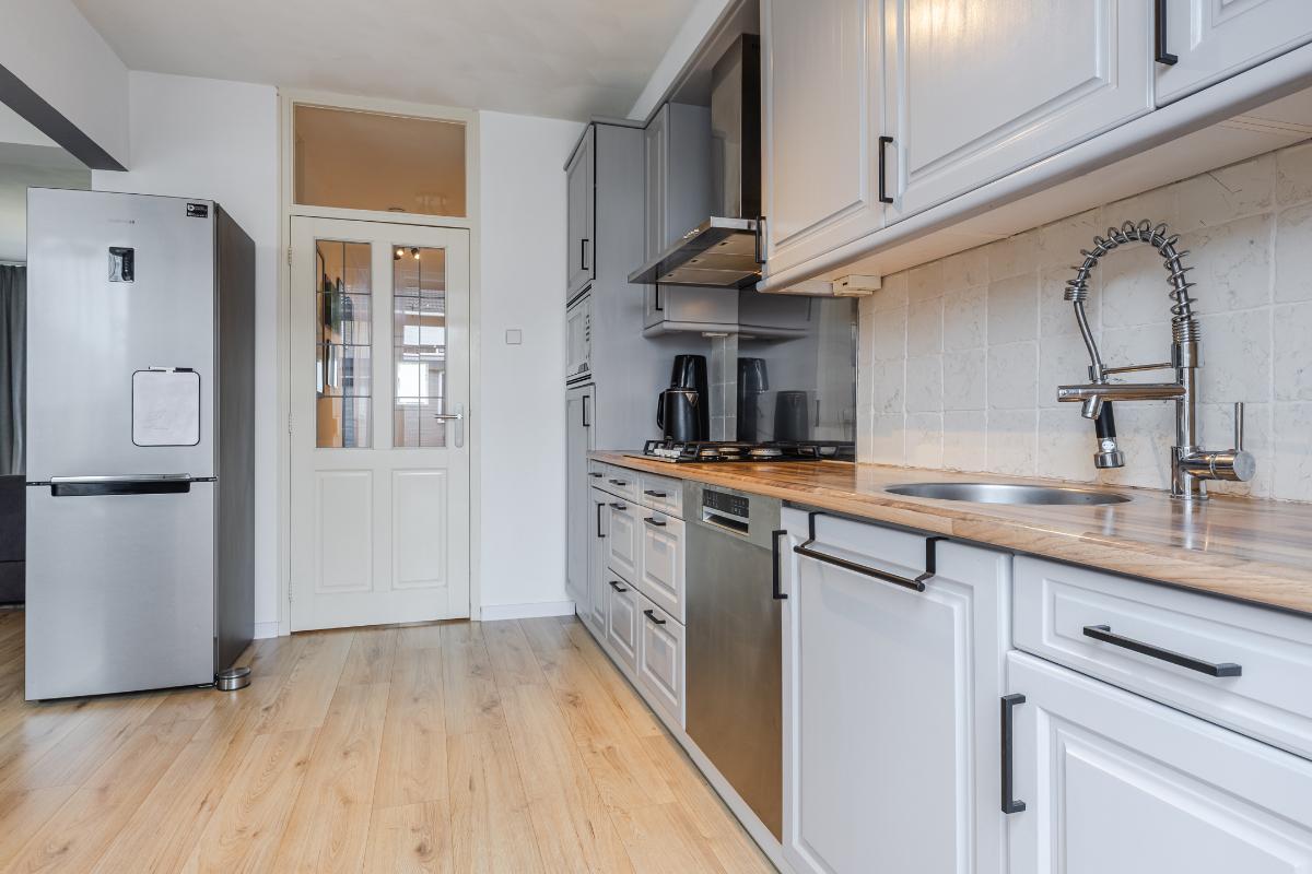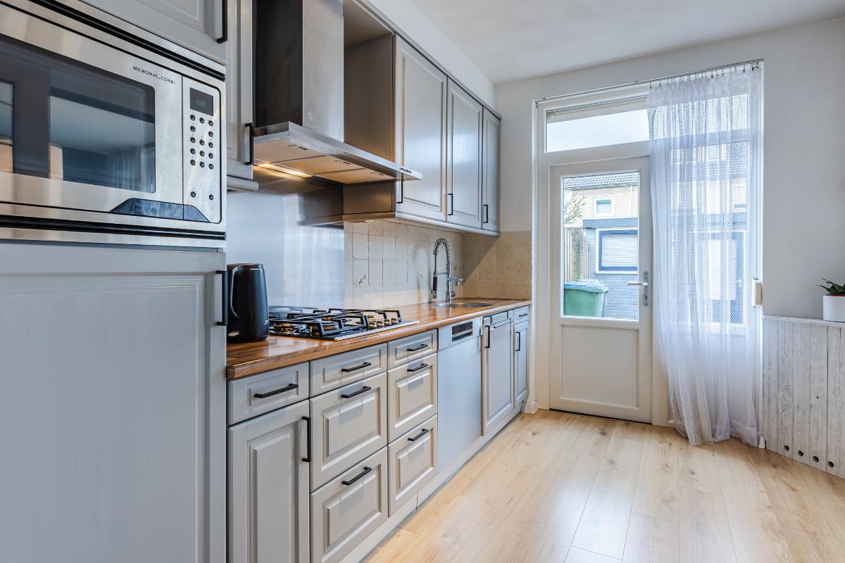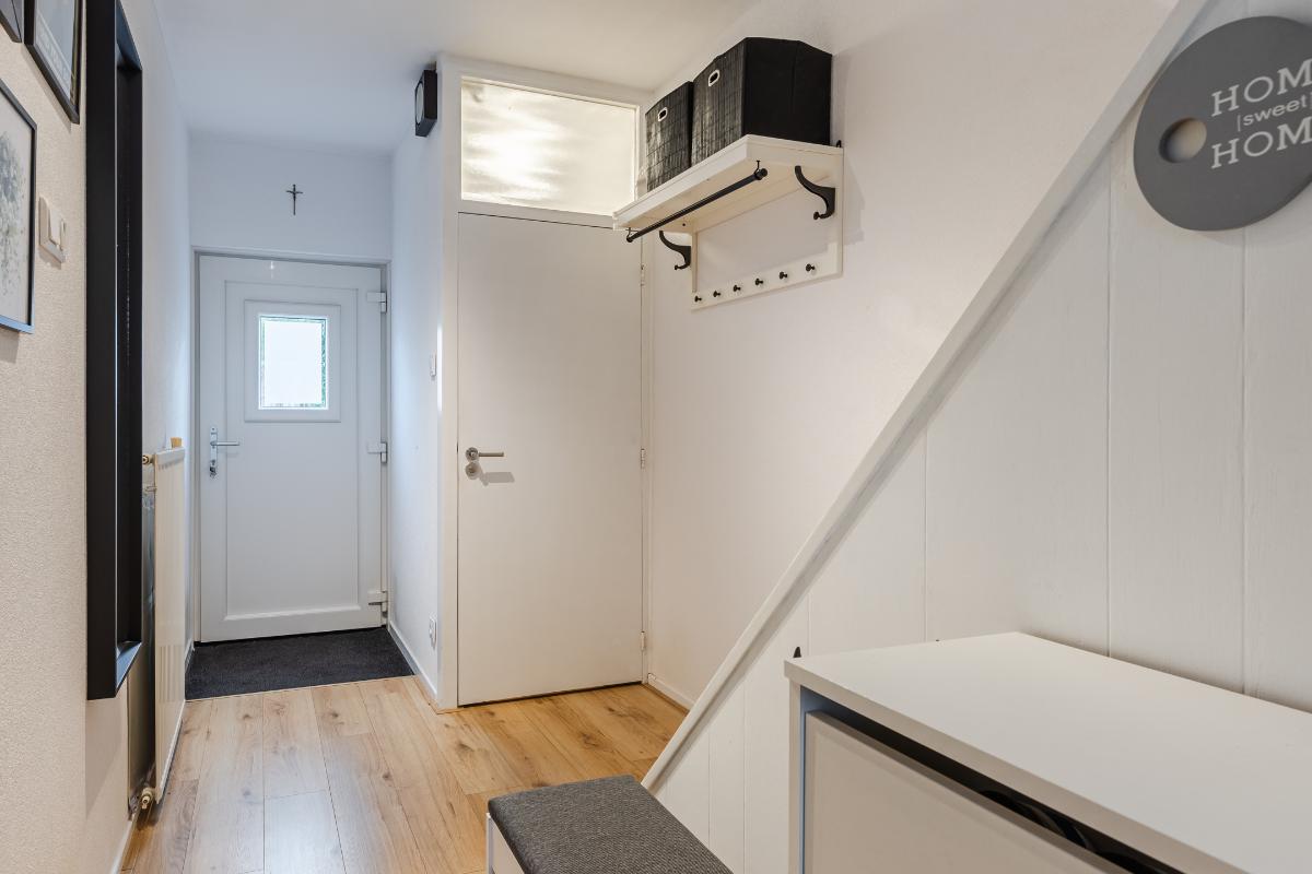 Indeling: Entree, hal met toiletruimte en trapkast. Vanuit de hal betreed je de open keuken. De keuken beschikt over gasstel, afzuigkap, een vaatwasser en een combi-magnetron. De vrijstaande koelkast/vriezer wordt ter overname aangeboden. In open verbinding de doorzon woonkamer. Deze ruimte is perfect voor gezellige avonden met het gezin of vrienden. Vloer begane grond is v.v. een fraaie laminaat. Wanden gestuct.