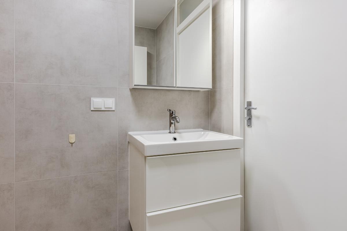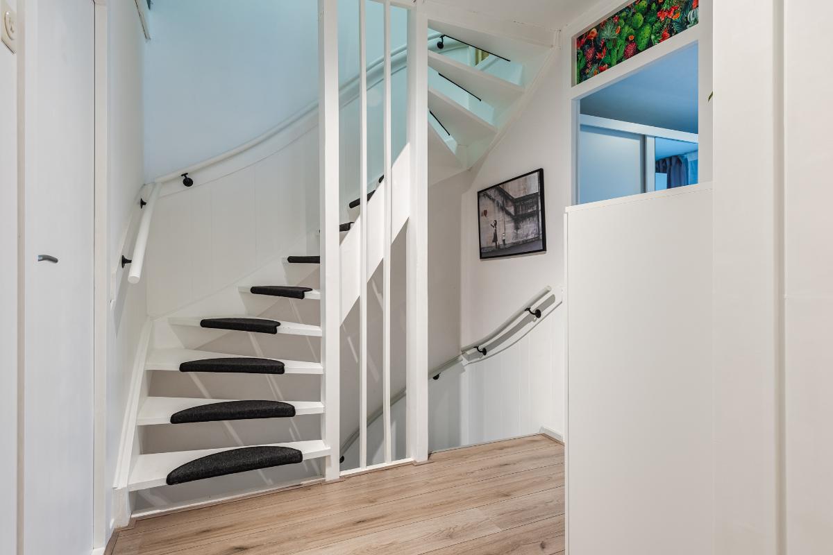 1e Verdieping: Overloop. Op de eerste verdieping bevinden zich 4 van de 5 slaapkamers. Ook de moderne volledig betegelde badkamer (2022) bevindt zich op deze verdieping. Deze is voorzien van een toilet, in loop douche en wastafel. Vloer 1e verdieping is v.v. laminaat. Wanden gestuct.