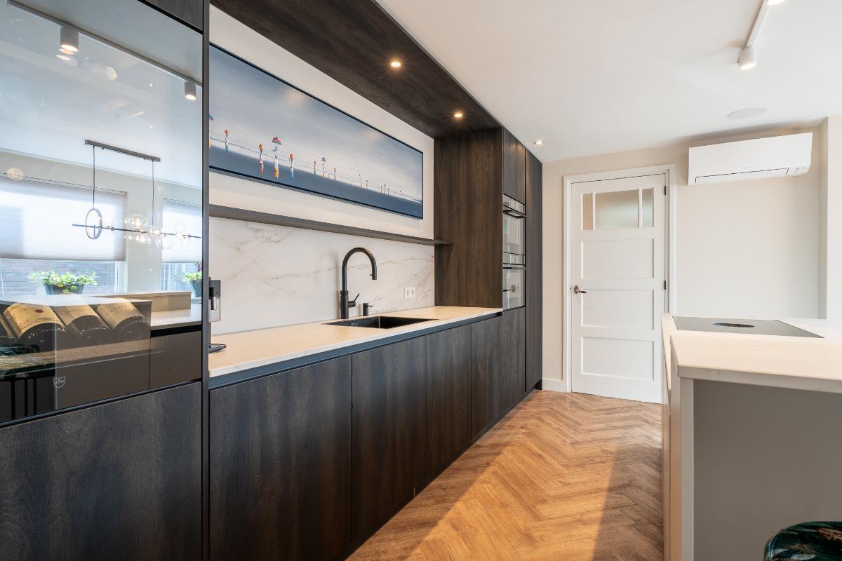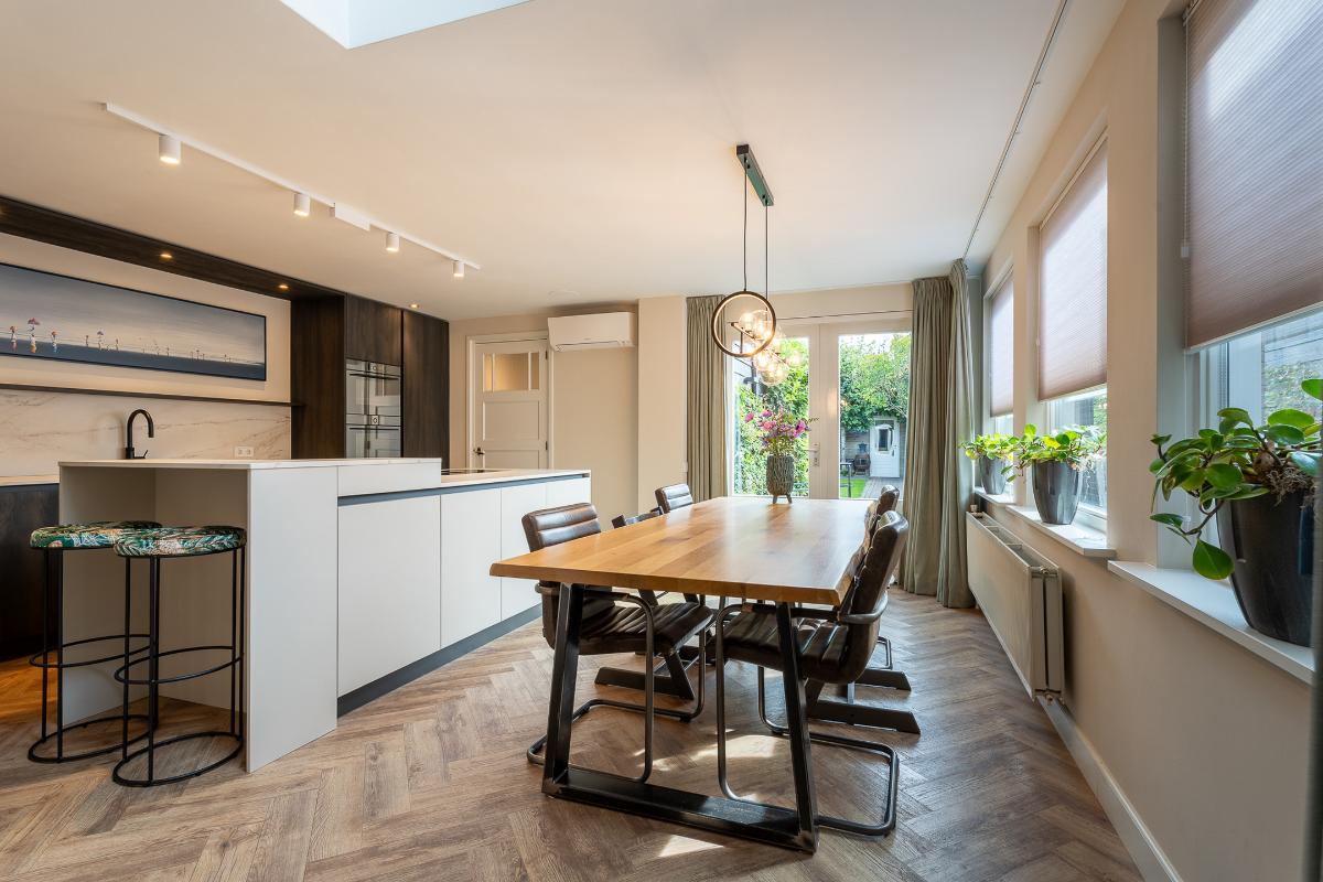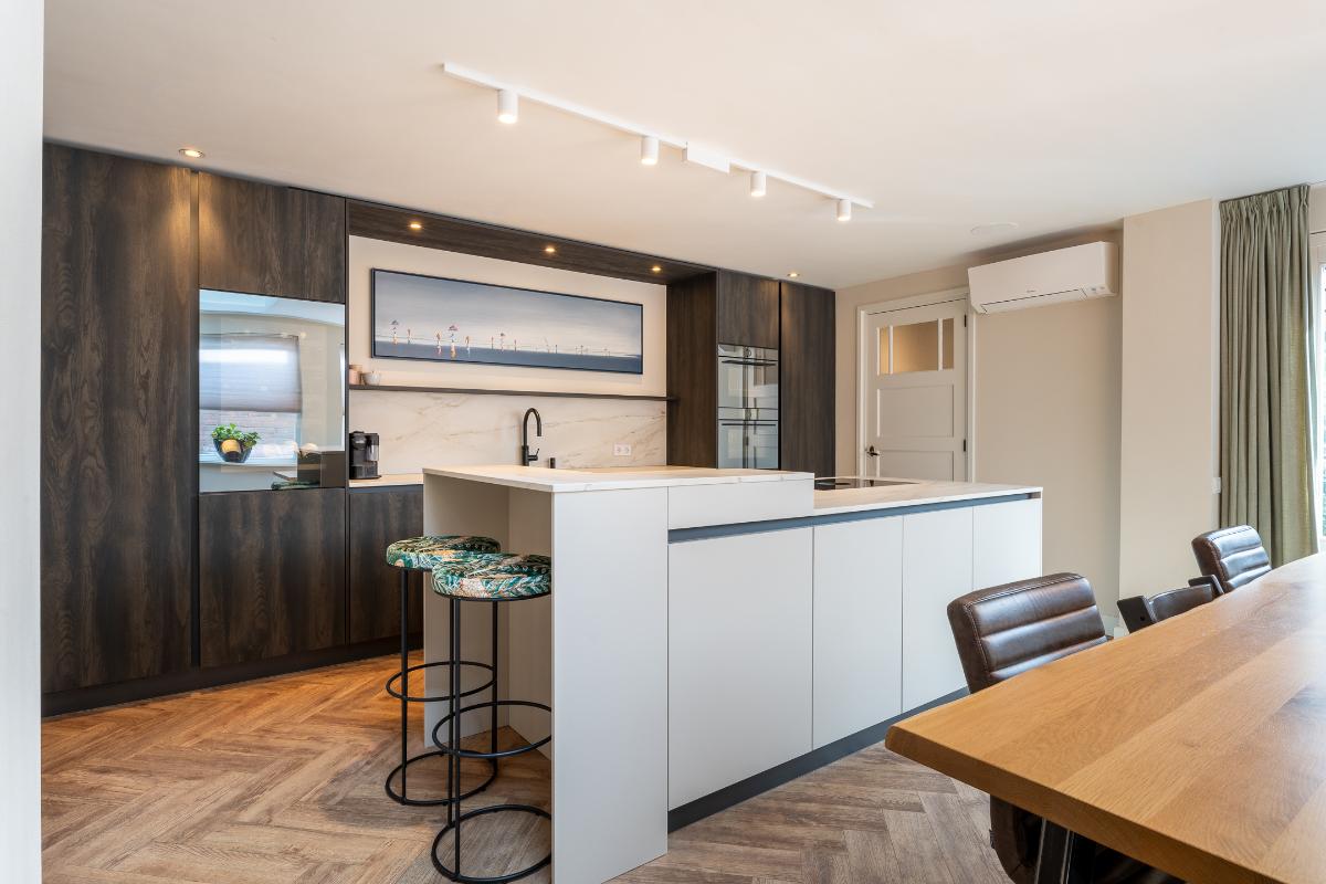 KEUKEN De luxe uitgevoerde en complete leefkeuken (ca. 27m²) met kook-/ziteiland is voorzien van alle gemakken en tijdloos ingericht. In de keuken ligt eveneens een mooie visgraat pvc vloer en zijn de wanden/plafond voorzien van strak stucwerk. Daarnaast beschikt deze ruimte over een airconditioning. Doordat slim gebruikt is gemaakt van de vele kozijnen is in deze ruimte enorm veel daglichttoetreding en een ruimtelijk effect gecreëerd. De keuken beschikt over A-merk inbouwapparatuur waaronder; een Bora inductiekookplaat met downdraft afzuiging, stoomoven, oven, wijnklimaatkast, vaatwasser, koelkast, vriezer, Quooker en vele opberglades en kasten. Vanuit de keuken is een doorloop naar de waskamer of kan de tuin bereikt worden middels de openslaande tuindeuren.