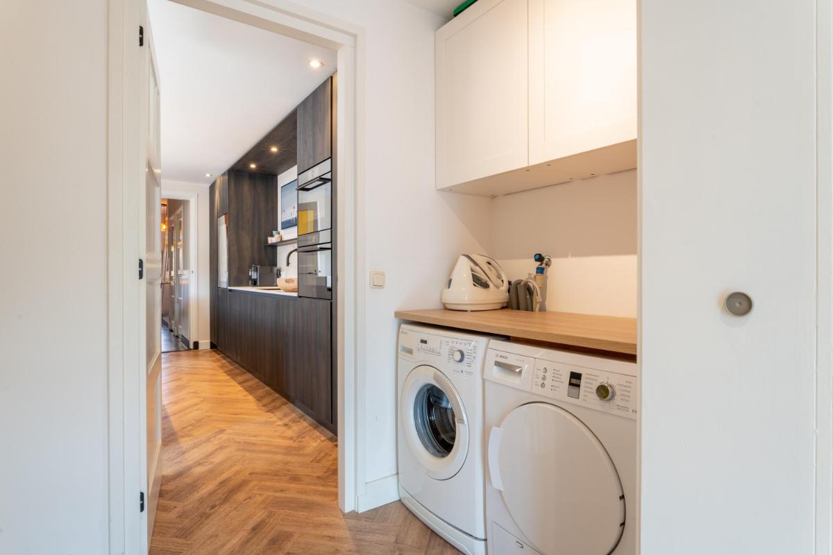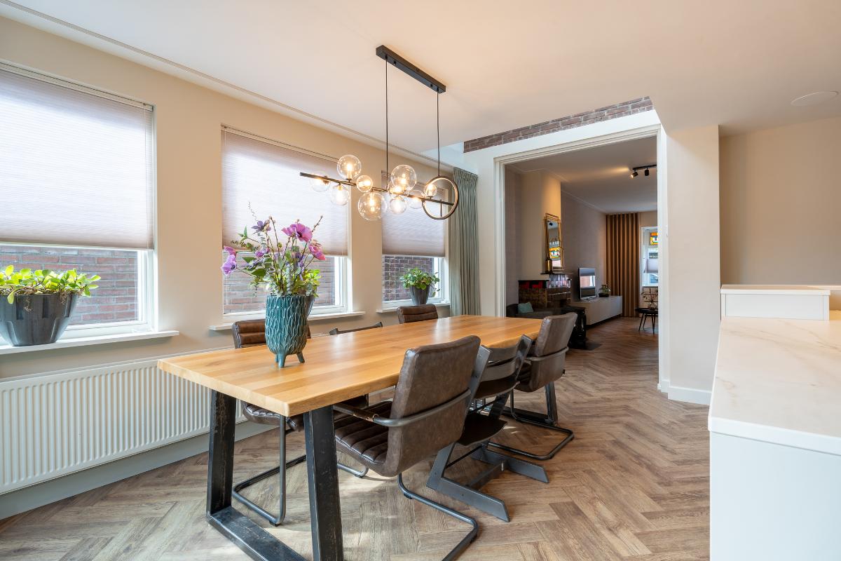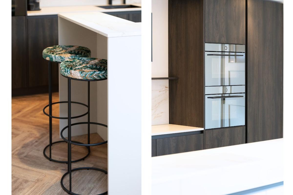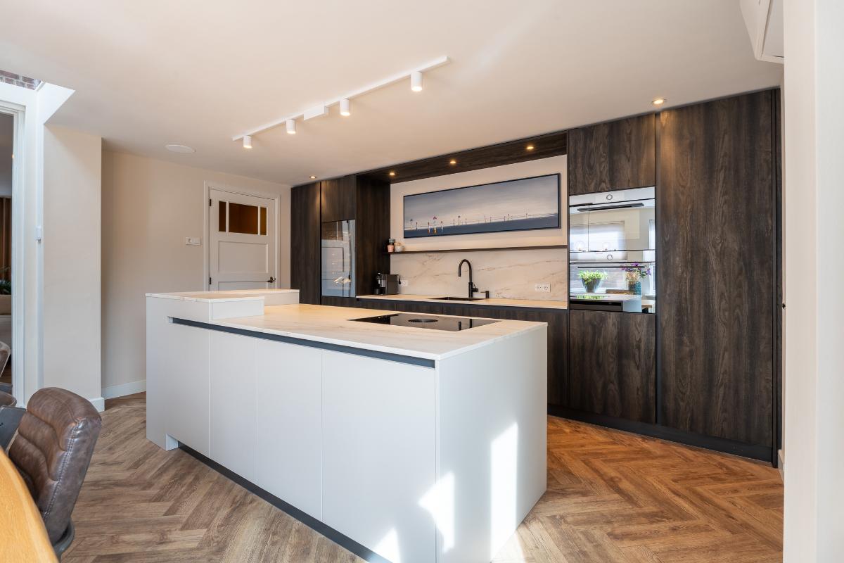 KEUKEN De luxe uitgevoerde en complete leefkeuken (ca. 27m²) met kook-/ziteiland is voorzien van alle gemakken en tijdloos ingericht. In de keuken ligt eveneens een mooie visgraat pvc vloer en zijn de wanden/plafond voorzien van strak stucwerk. Daarnaast beschikt deze ruimte over een airconditioning. Doordat slim gebruikt is gemaakt van de vele kozijnen is in deze ruimte enorm veel daglichttoetreding en een ruimtelijk effect gecreëerd. De keuken beschikt over A-merk inbouwapparatuur waaronder; een Bora inductiekookplaat met downdraft afzuiging, stoomoven, oven, wijnklimaatkast, vaatwasser, koelkast, vriezer, Quooker en vele opberglades en kasten. Vanuit de keuken is een doorloop naar de waskamer of kan de tuin bereikt worden middels de openslaande tuindeuren.