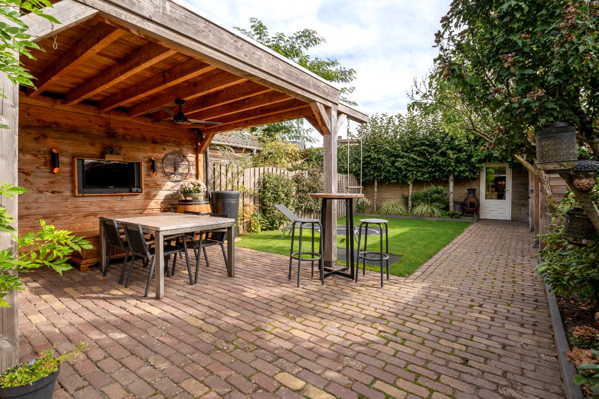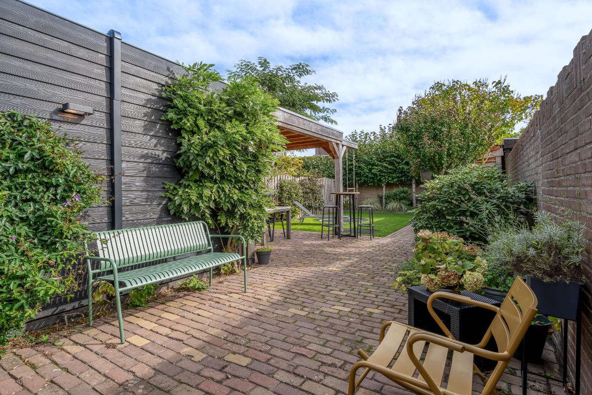 TUIN De verzorgd aangelegde, privacybiedende achtertuin is op het oosten gelegen en voorzien van een terras aan de woning, overkapping, gazon, diverse borders met vaste beplanting, leibomen, trampoline, houthok, fruitbomen en een regenton. Aan de achterzijde is de garage bereikbaar, deze wordt gehuurd en is optioneel over te nemen. Naast de woning ligt een looppad naar de voorzijde van de woning/straat.
