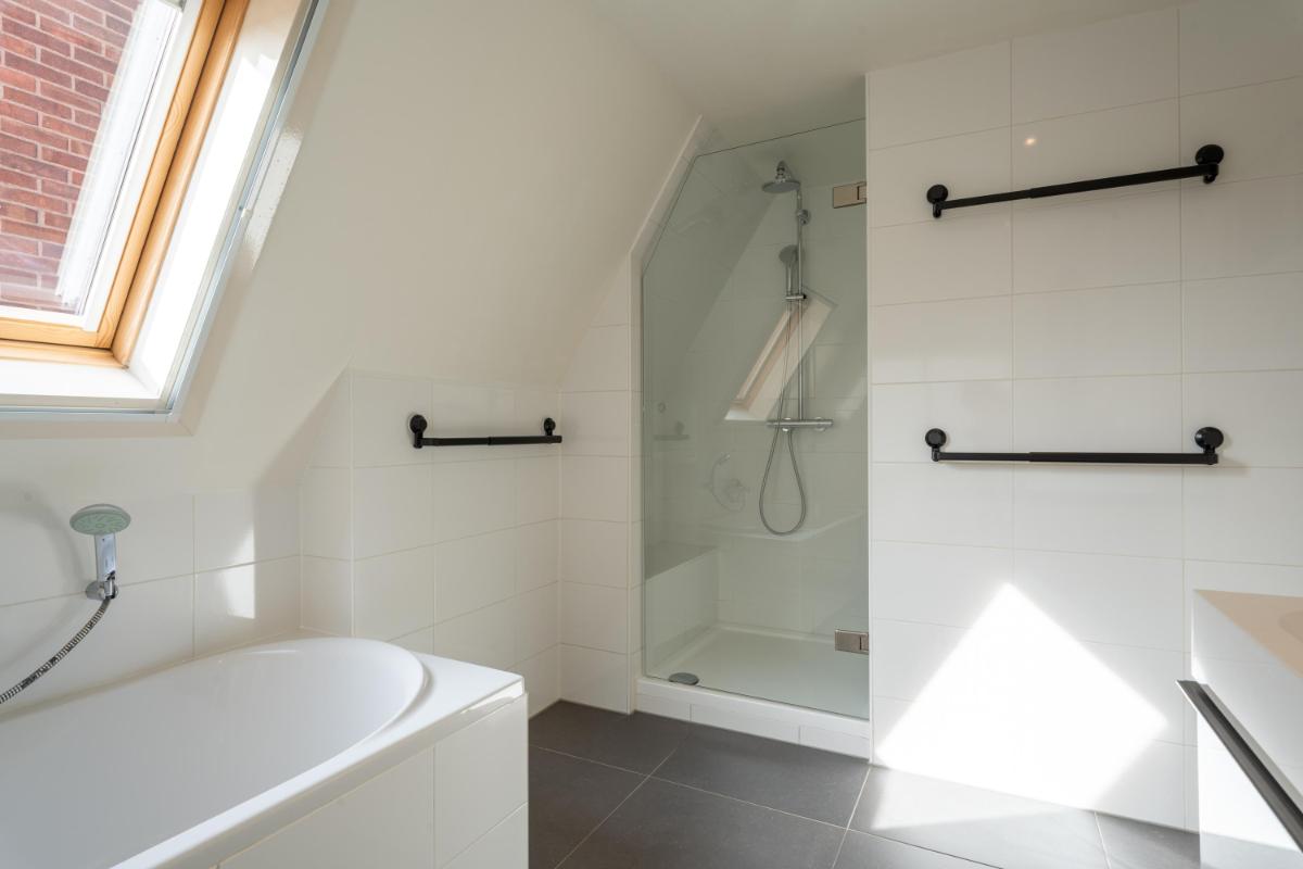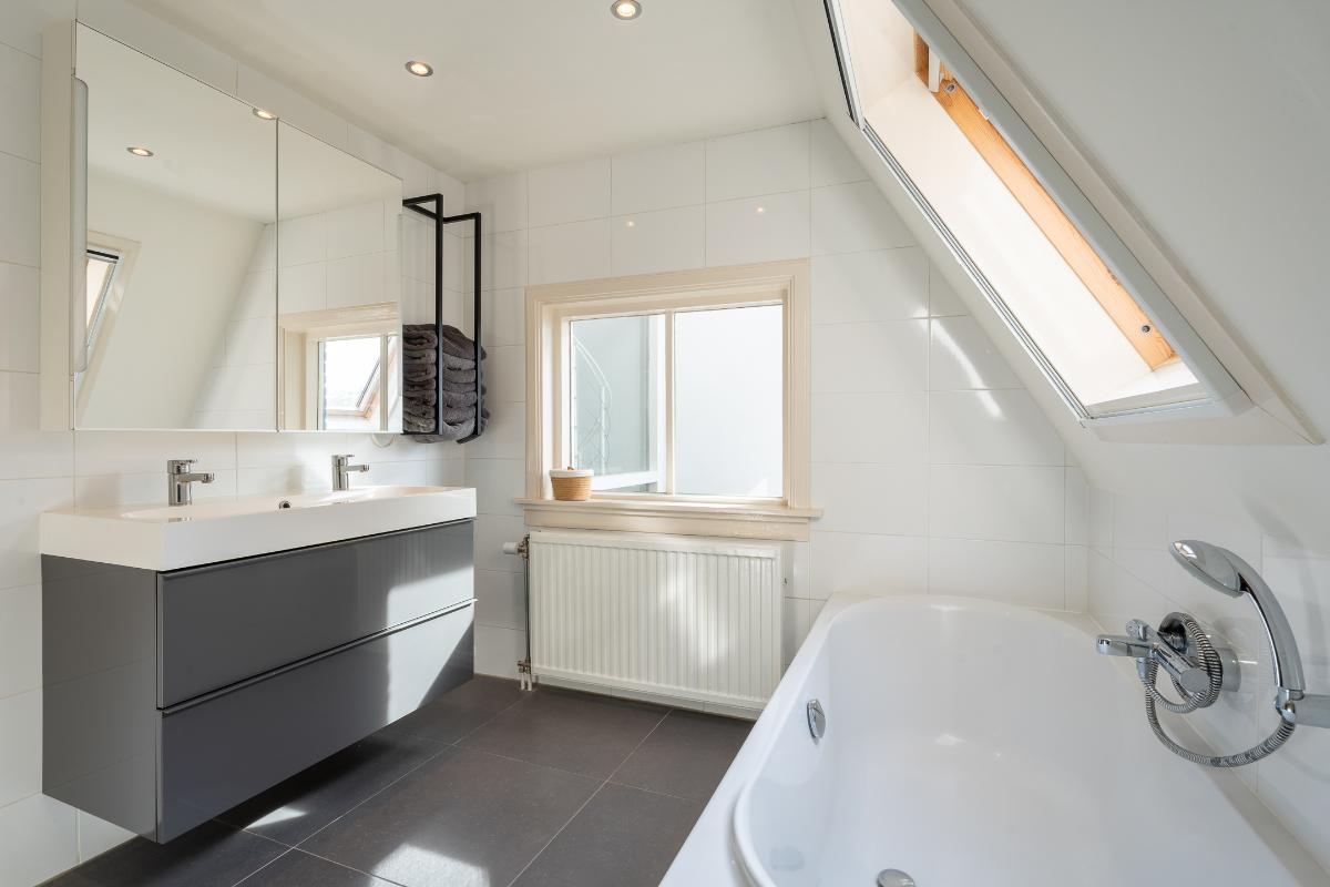 BADKAMER Volledig betegelde badkamer voorzien van douche met separate handdouche, ligbad, dubbele wastafel met meubel, handdoekenrek en verwarming. In deze badkamer is veel daglichttoetreding middels het velux dakraam en de hardhouten kozijnen.